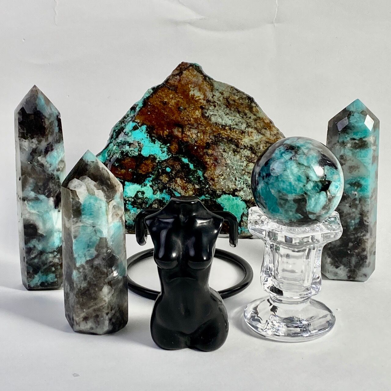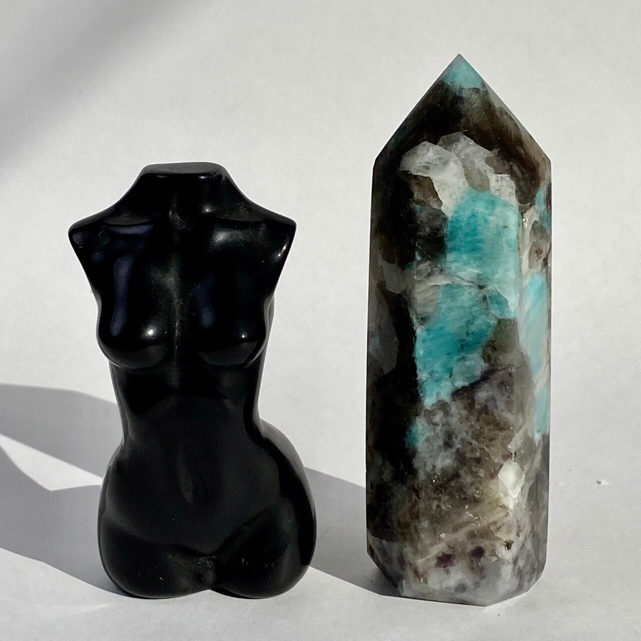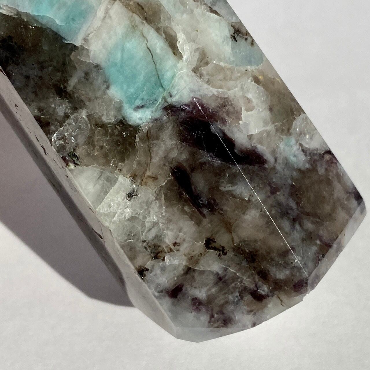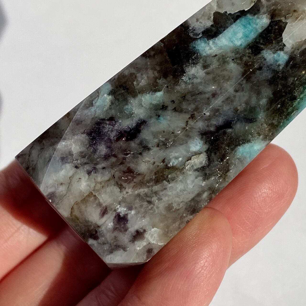 ブルーラグーンのような発色の美しいアマゾナイトが、濃淡の迷彩柄のようなスモーキークォーツの所々に配されている美しいタワーです。ダークなスモーキーの色味がアマゾナイトの鮮やかさを一段と引き立てている、素敵な組み合わせです。また、下部に少しマイカも入っているのが見受けられます。