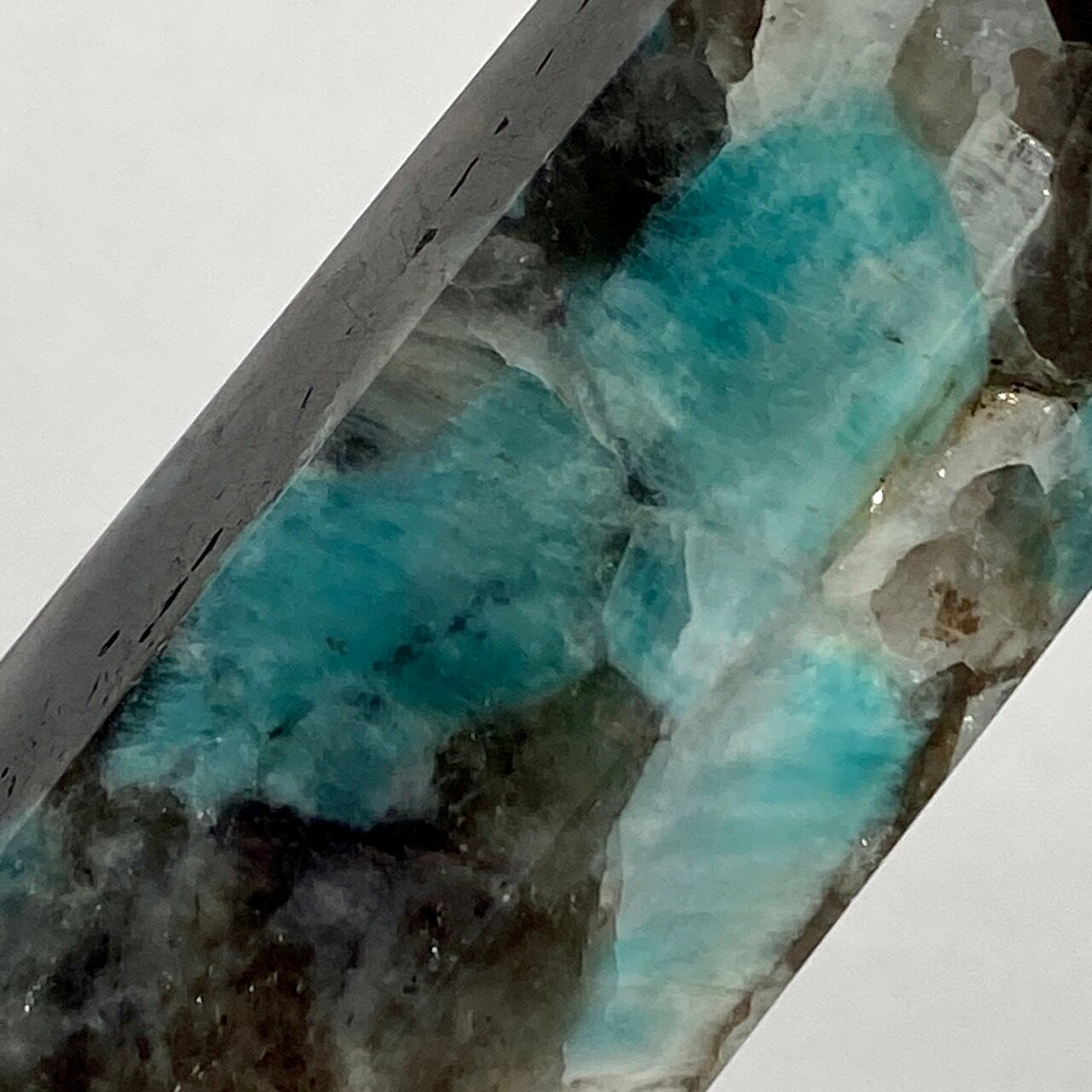 アマゾナイト(和名:天河石)とスモーキークォーツが共生するポイントです。