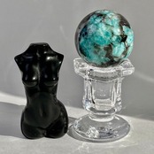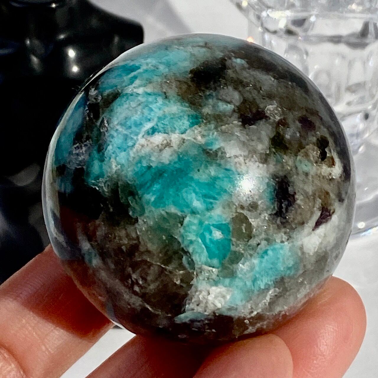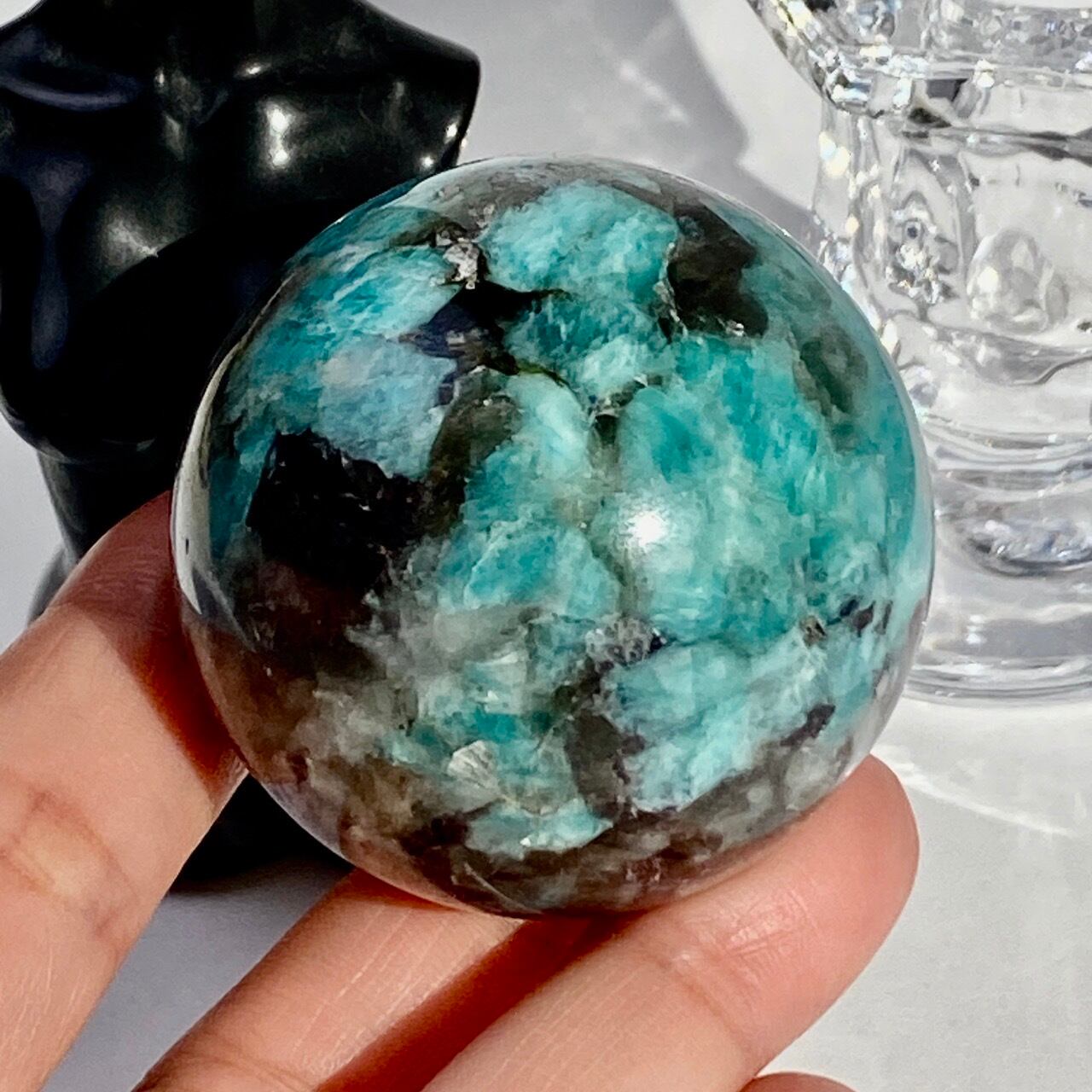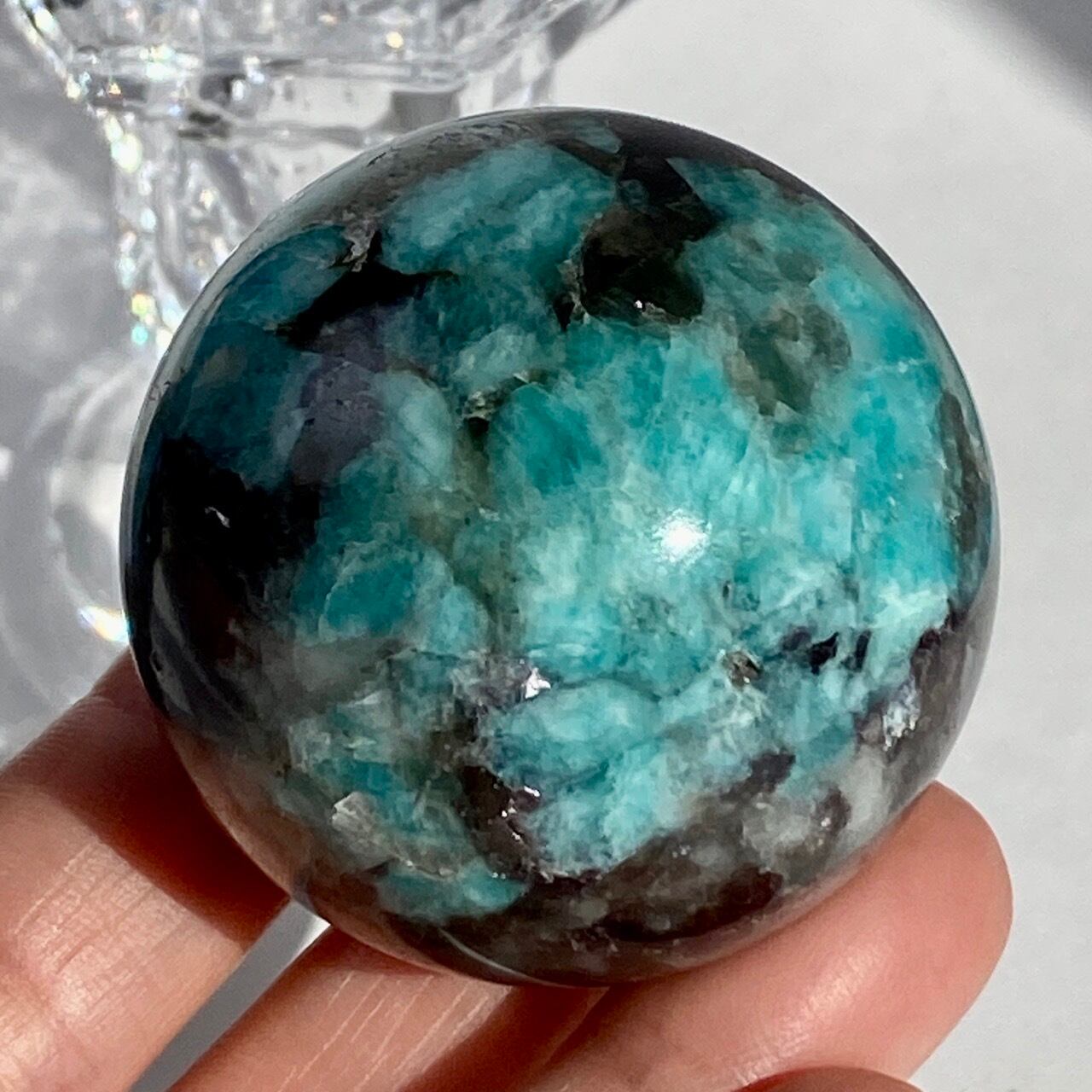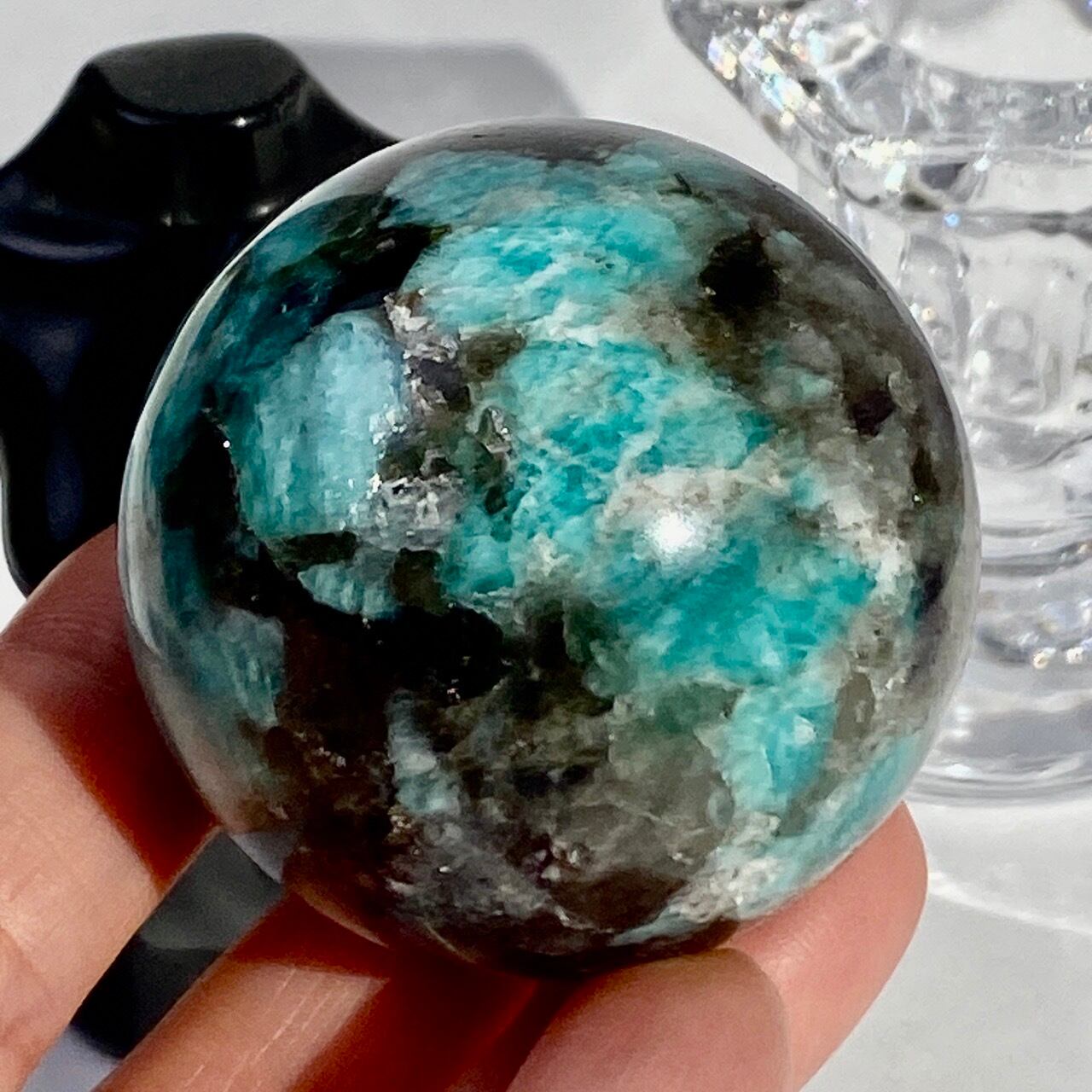 アマゾナイト(和名:天河石)とスモーキークォーツが共生するスフィアです。