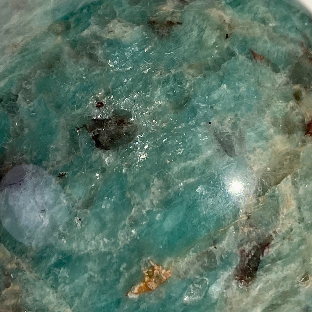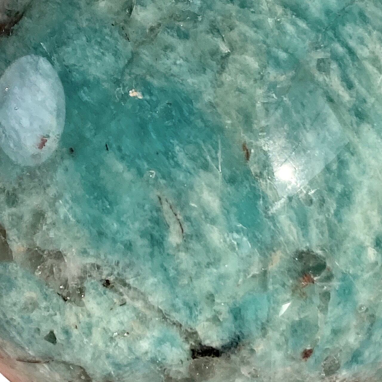 アマゾナイト(和名:天河石)にところどころスモーキークォーツが共生するスフィアです。