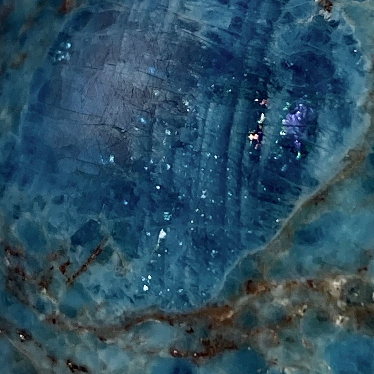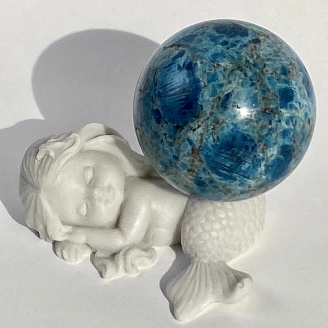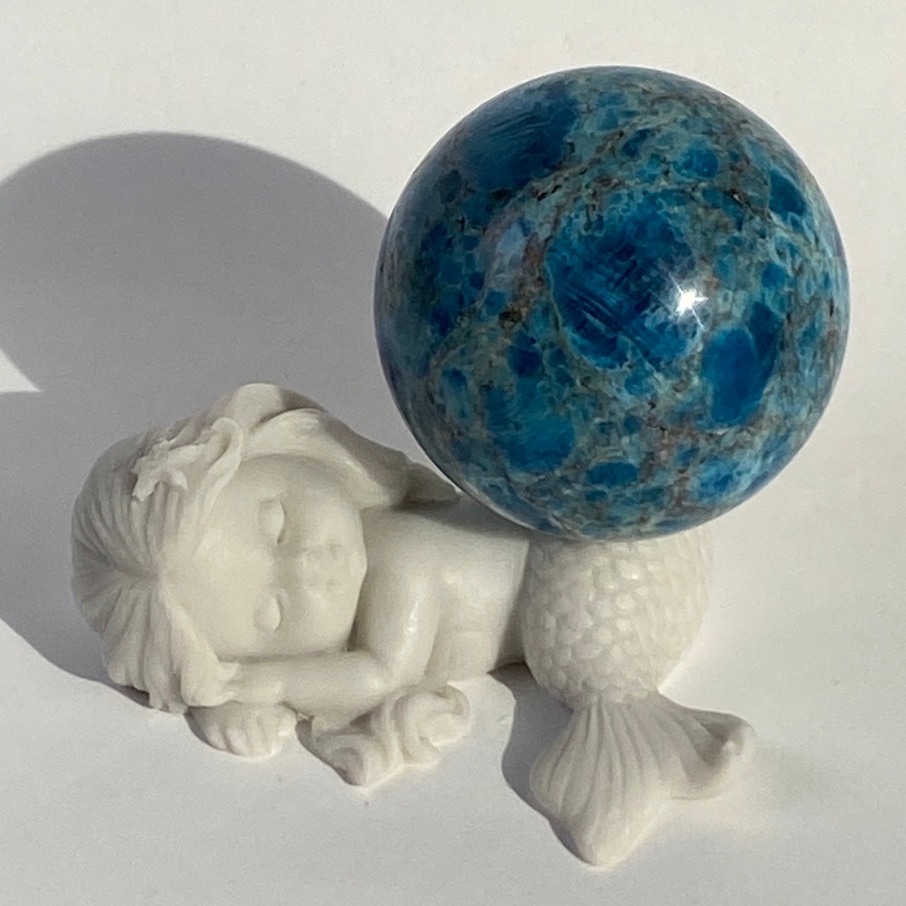 昨今市場に出回っている濃い色味のブルーアパタイトも素敵ですが、このラリマー的な、一瞬でマーメイドを想起させるような色合いも非常に美しいです。レムリアのマーメイドが持っていそうなこの石、マーメイドのスフィアホルダー(ショップに商品として掲載してはしておりませんが、幾つか在庫があるため別途販売可能ですのでお問合せフォームもしくはインスタグラムのDMよりご連絡下さい)に載せて撮影しました。優しいソフトブルー x ホワイトのベースに浮かび上がるまるで宝石のような鮮やかなスカイブルー。このスカイブルー部分に結晶化している半透明な箇所があり、煌めきまで所々に見られます。