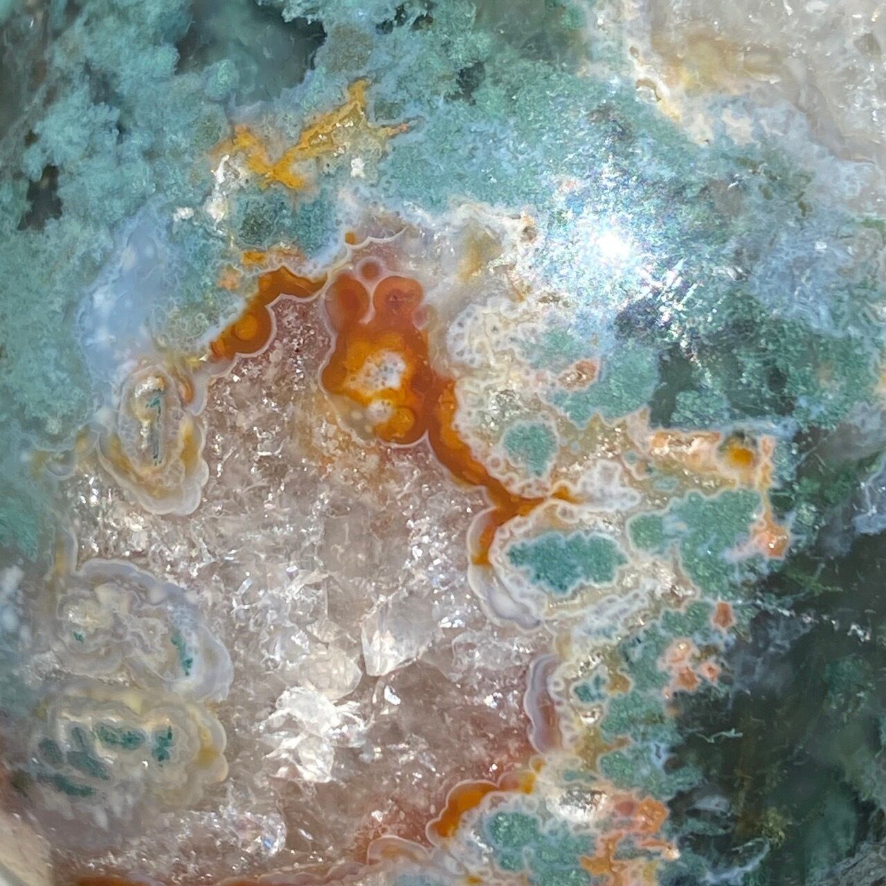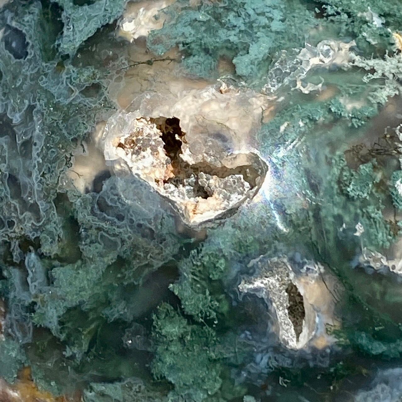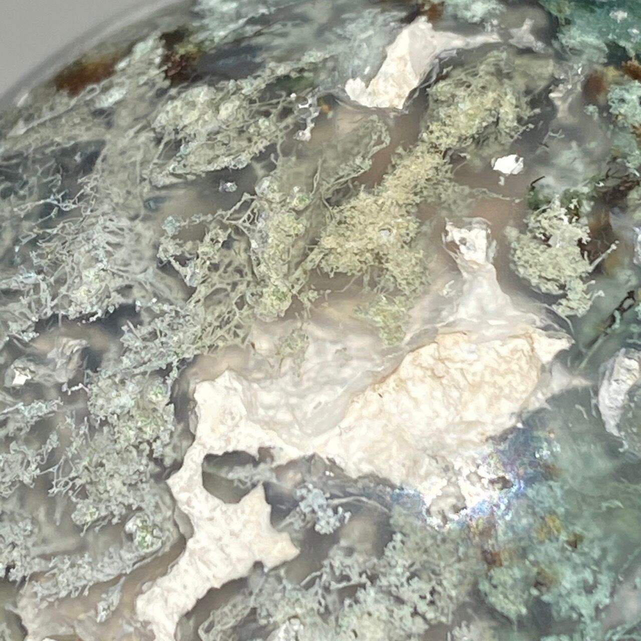 モスアゲートは瑪瑙(メノウ)の中に緑色や赤色、黒色などの内包物が入り、それが苔や樹形(木の枝)のような模様に見えるのが特徴です。