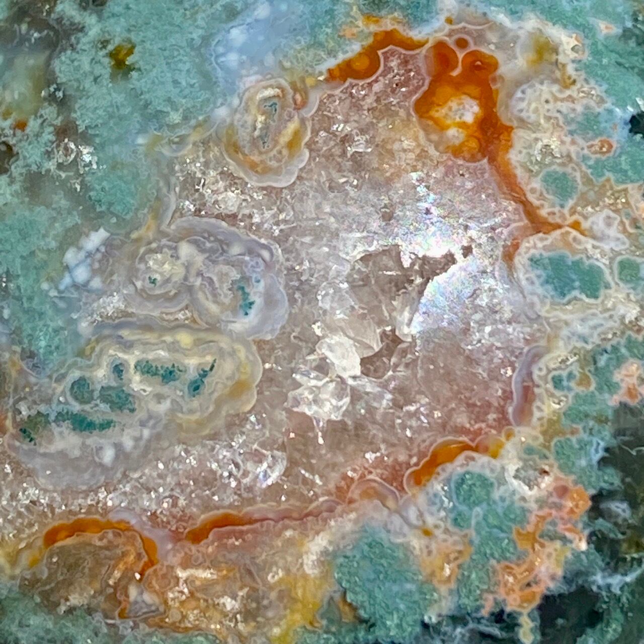 まるで、紅龍がクォーツを抱きながら、空に登っていくような模様。その周りに、赤と対照的な青銅色の細かい模様が入っていて、一瞬で目が釘付けになった子です。もしくはペイズリー柄とでも形容できそうです。カーネリアンの色が入っているモスアゲートは比較的稀のため、特別感があります。