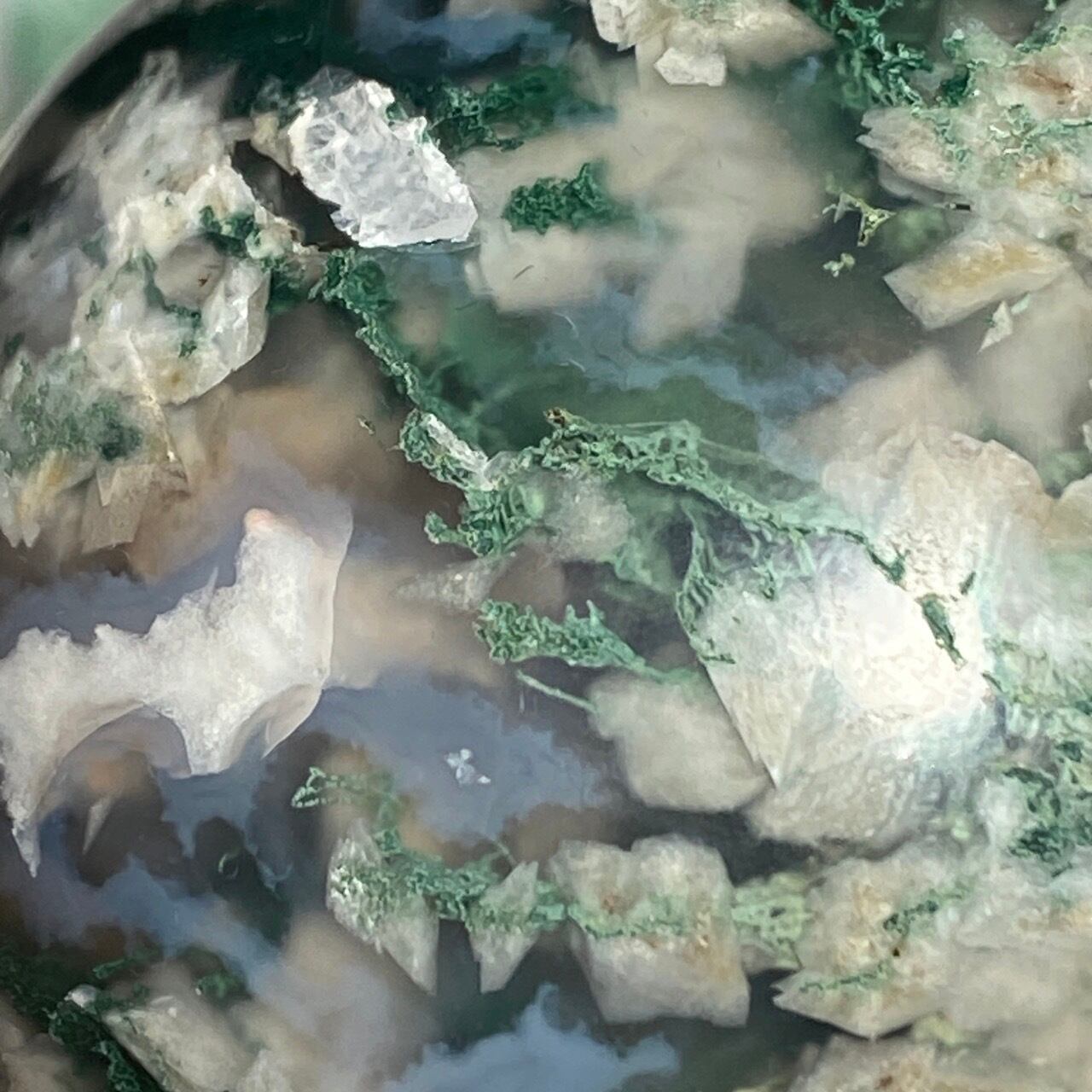 モスアゲートは瑪瑙(メノウ)の中に緑色や赤色、黒色などの内包物が入り、それが苔や樹形(木の枝)のような模様に見えるのが特徴です。