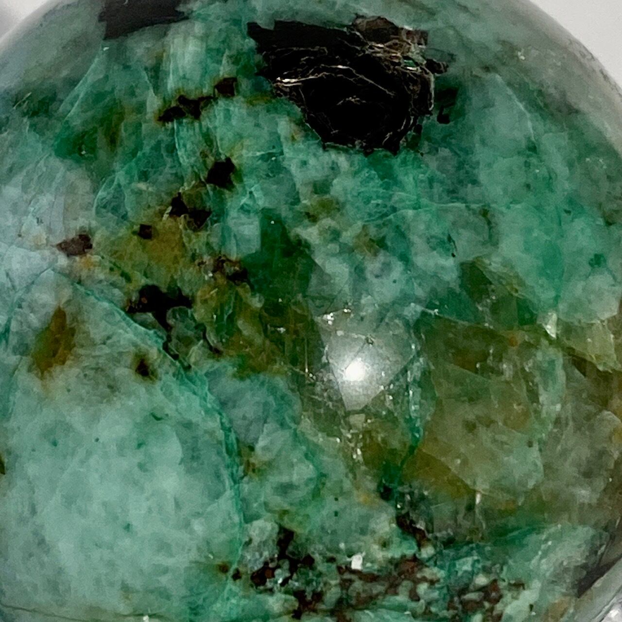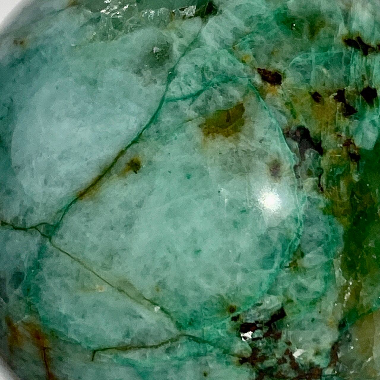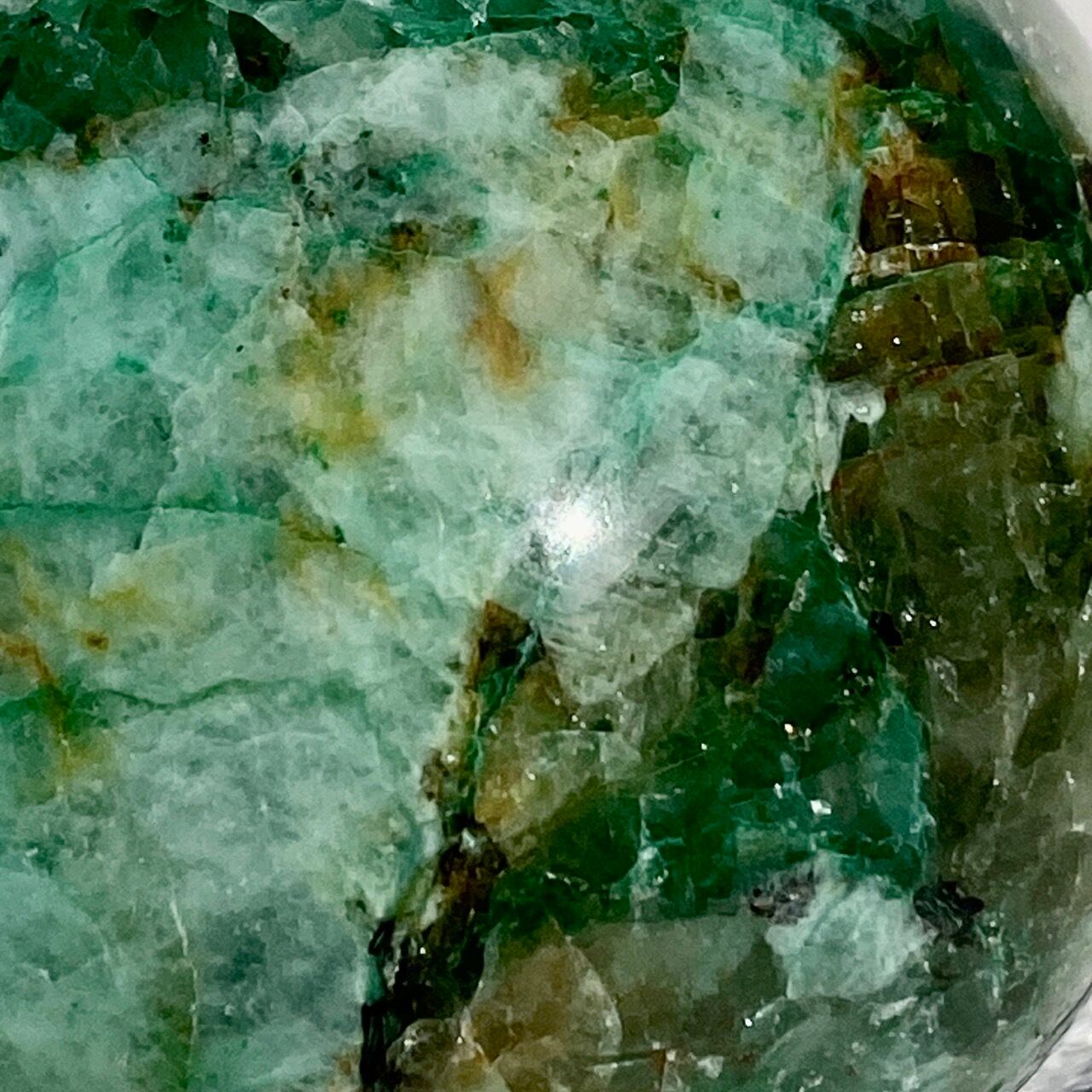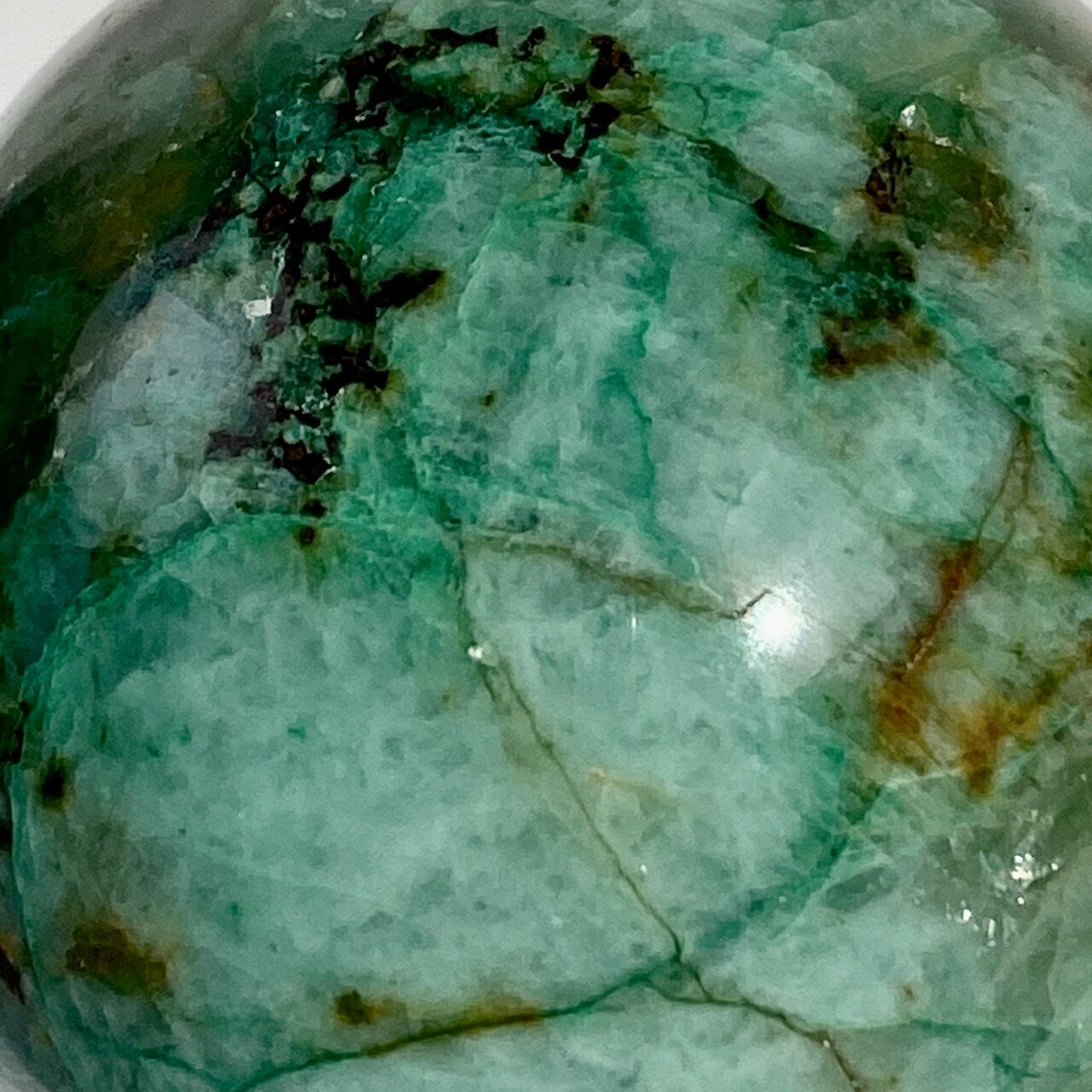 この石の魅力は、なんといっても、このブルーとグリーンのミックスによる発色が素晴らしいという事。また、ところどころネオングリーンの色味や、暖色系のオレンジ・ブラウンが入っていて、素敵です。この子は、スモーキークォーツが入っていて、一部マイカ(画像2枚目のアルミ箔のような部分)も含まれています。クウォーツ部分は透け感があります。