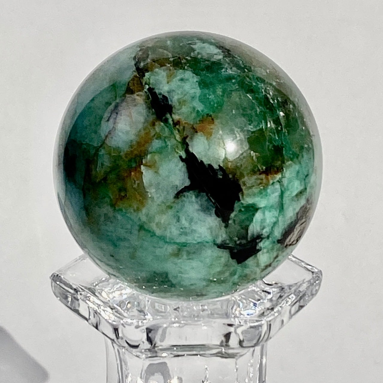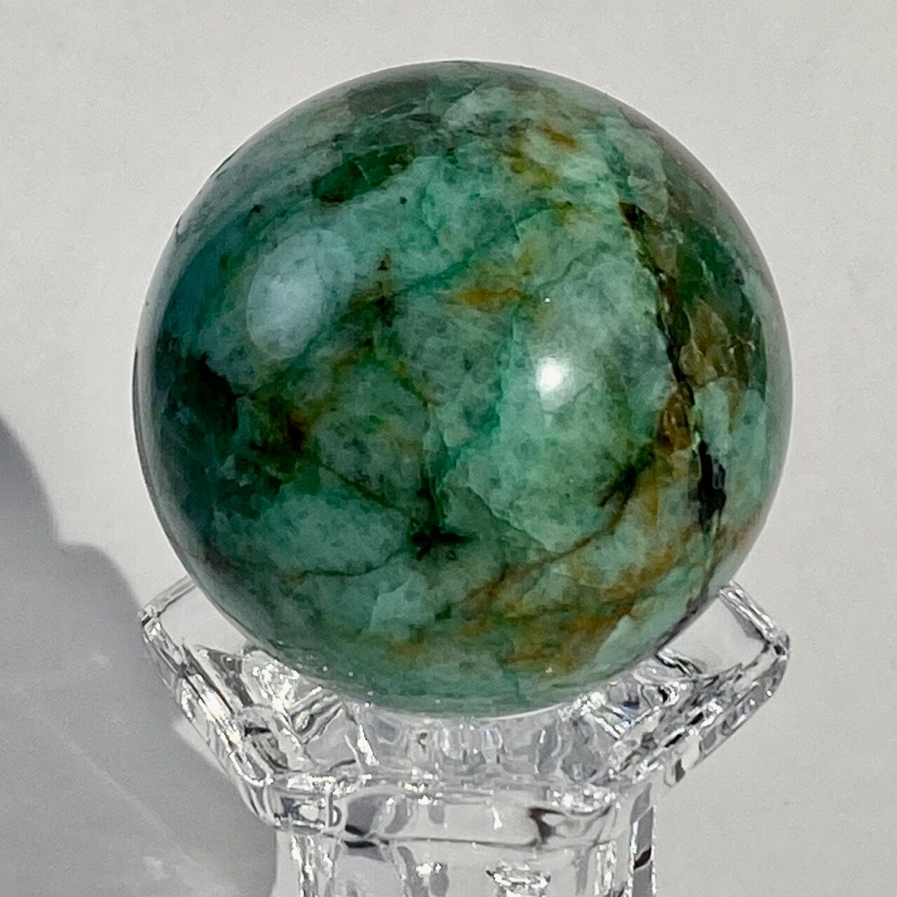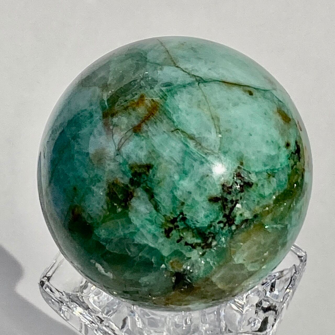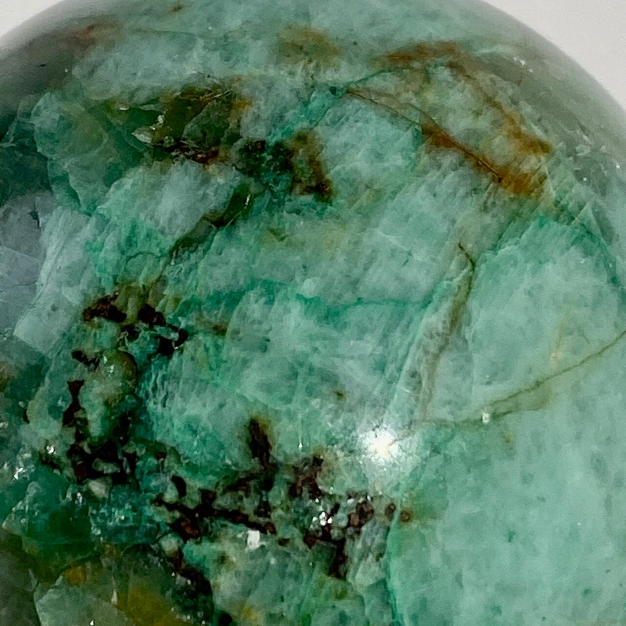 この石の魅力は、なんといっても、このブルーとグリーンのミックスによる発色が素晴らしいという事。また、ところどころネオングリーンの色味や、暖色系のオレンジ・ブラウンが入っていて、素敵です。この子は、スモーキークォーツが入っていて、一部マイカ(画像2枚目のアルミ箔のような部分)も含まれています。クウォーツ部分は透け感があります。