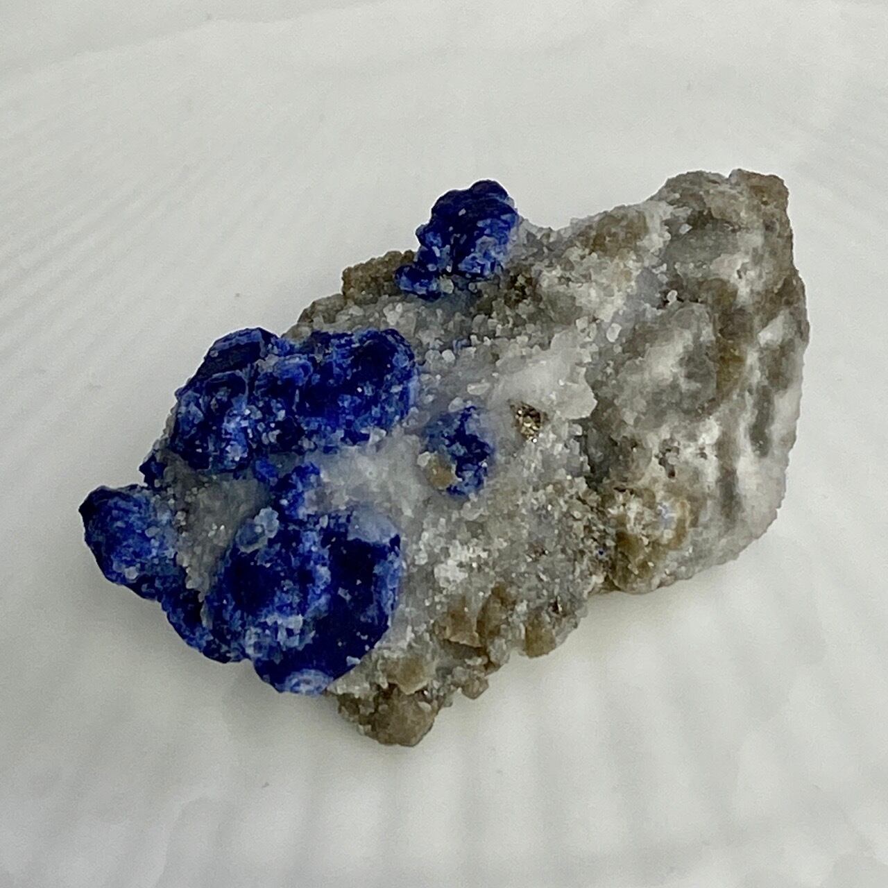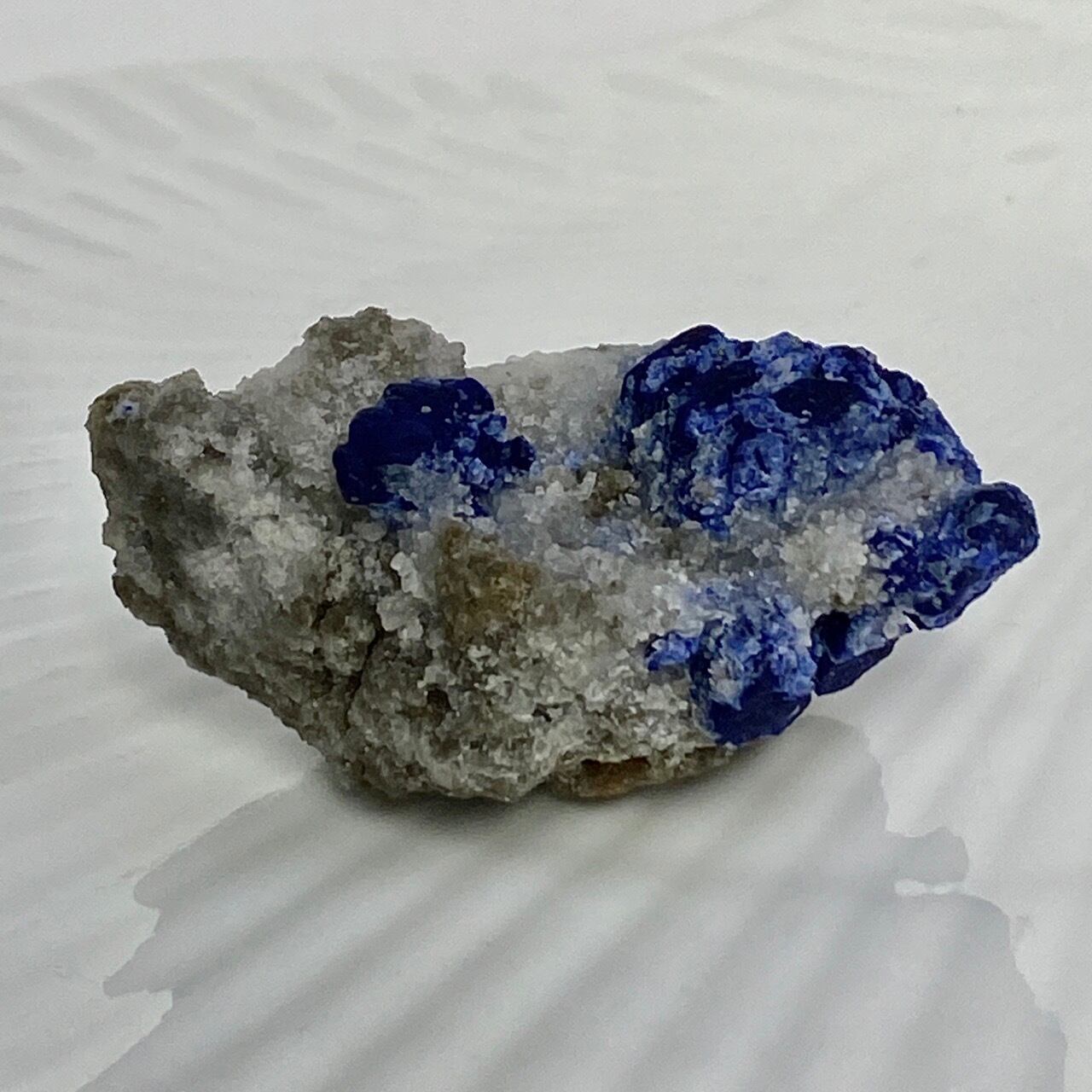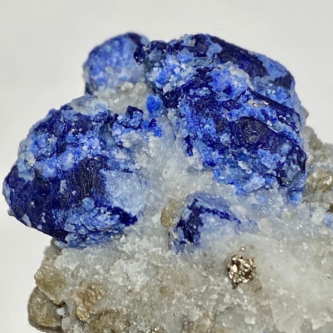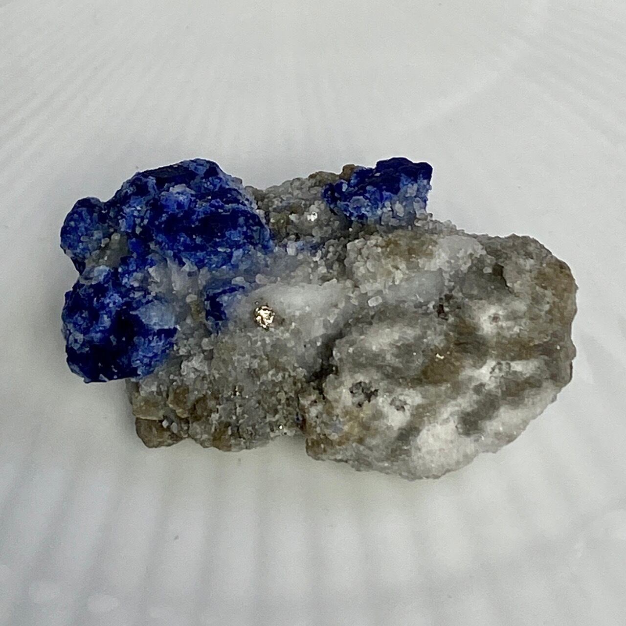 ラピスラズリでお馴染みのラズライト(LAZURITE 青金石)のパイライト入りスペシメンになります。このシリーズの石は、ものによってはカルサイトを含みます。母岩に発色の良いブルーベリーのような瑠璃色のラズライトの塊が豊富に付いている、ドルチェのような子です。また、パイライトも若干付いています。ラズライト部分が濃淡になっているのに加え、シュガーパウダーの様な白っぽい色も混じっている為、ドルチェ感が増しています。尚、インスタグラムでこのシリーズの動画を確認頂けます。