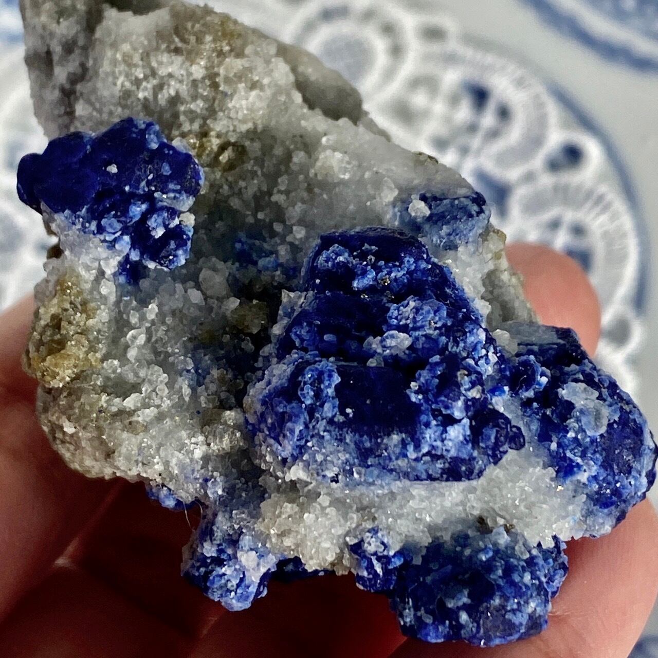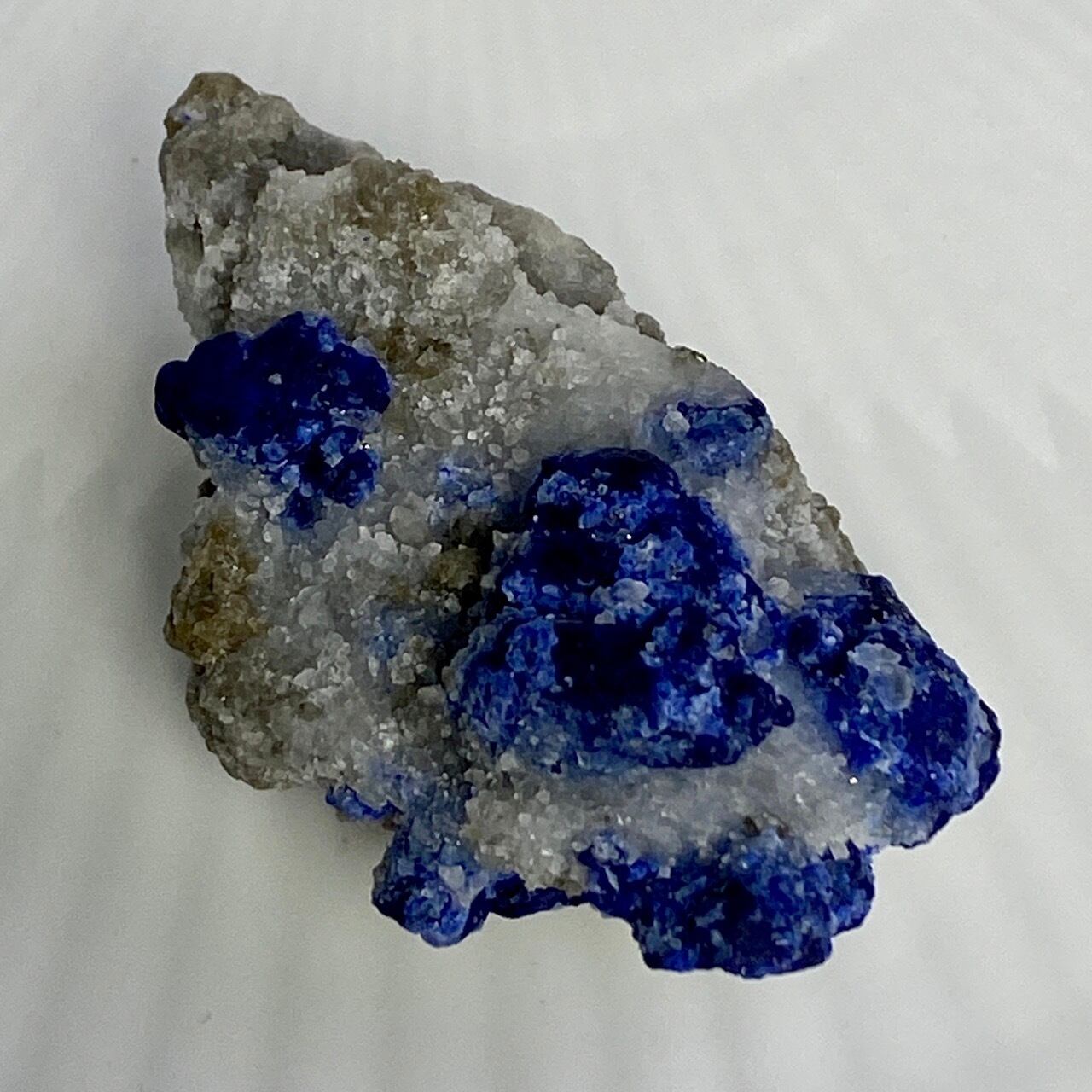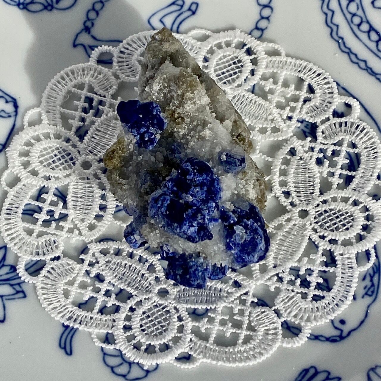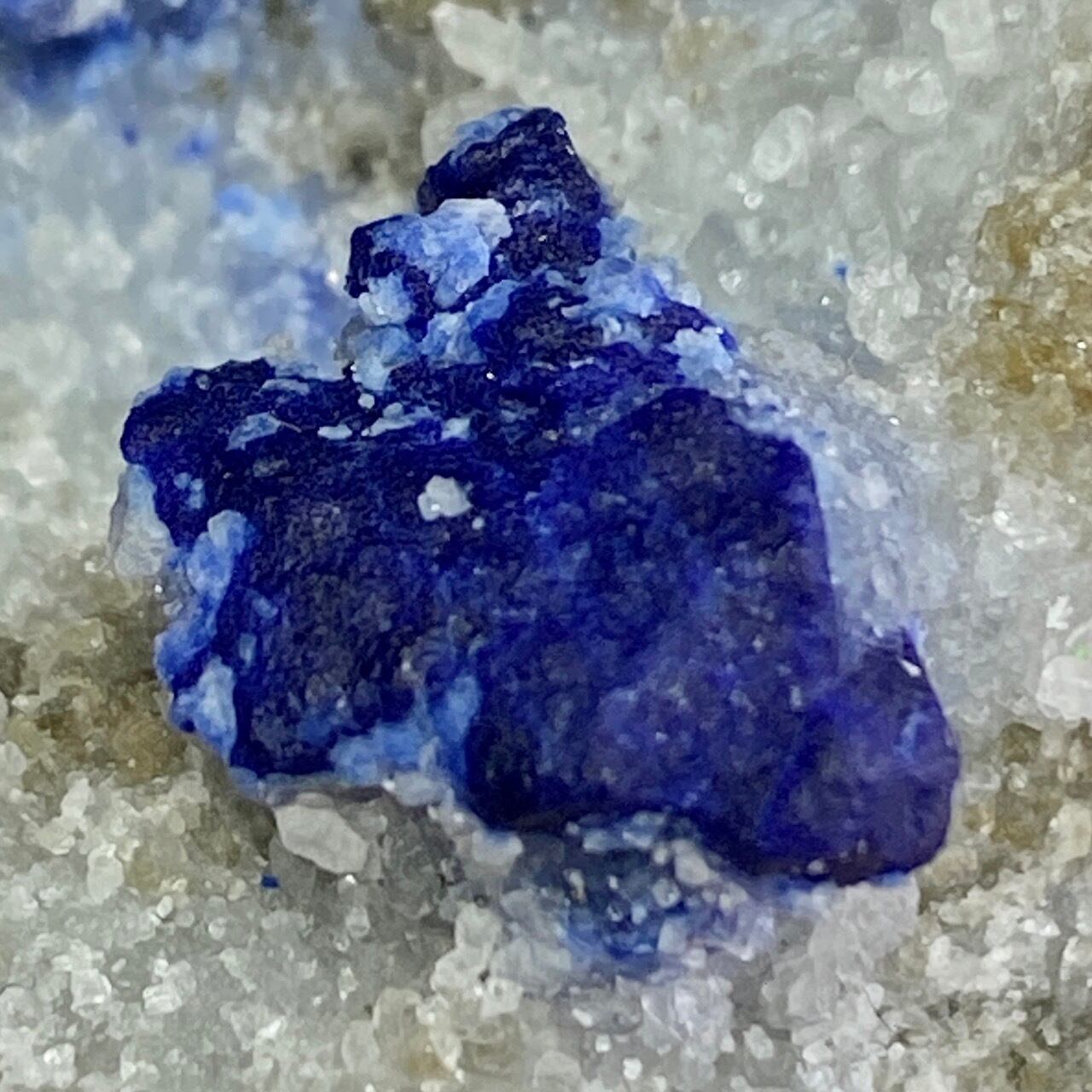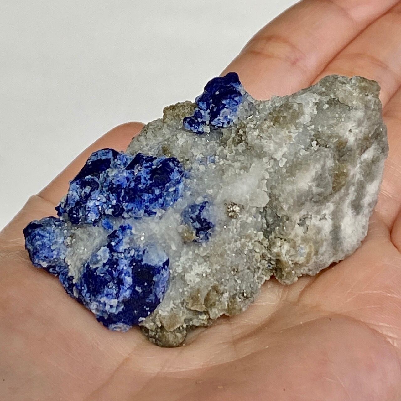ラピスラズリでお馴染みのラズライト(LAZURITE 青金石)のパイライト入りスペシメンになります。このシリーズの石は、ものによってはカルサイトを含みます。母岩に発色の良いブルーベリーのような瑠璃色のラズライトの塊が豊富に付いている、ドルチェのような子です。また、パイライトも若干付いています。ラズライト部分が濃淡になっているのに加え、シュガーパウダーの様な白っぽい色も混じっている為、ドルチェ感が増しています。尚、インスタグラムでこのシリーズの動画を確認頂けます。
