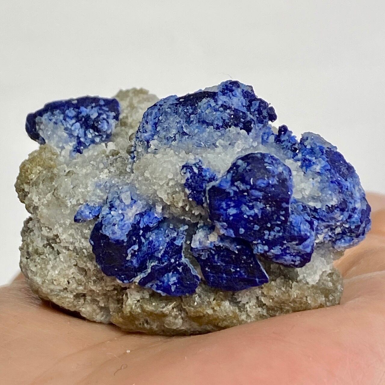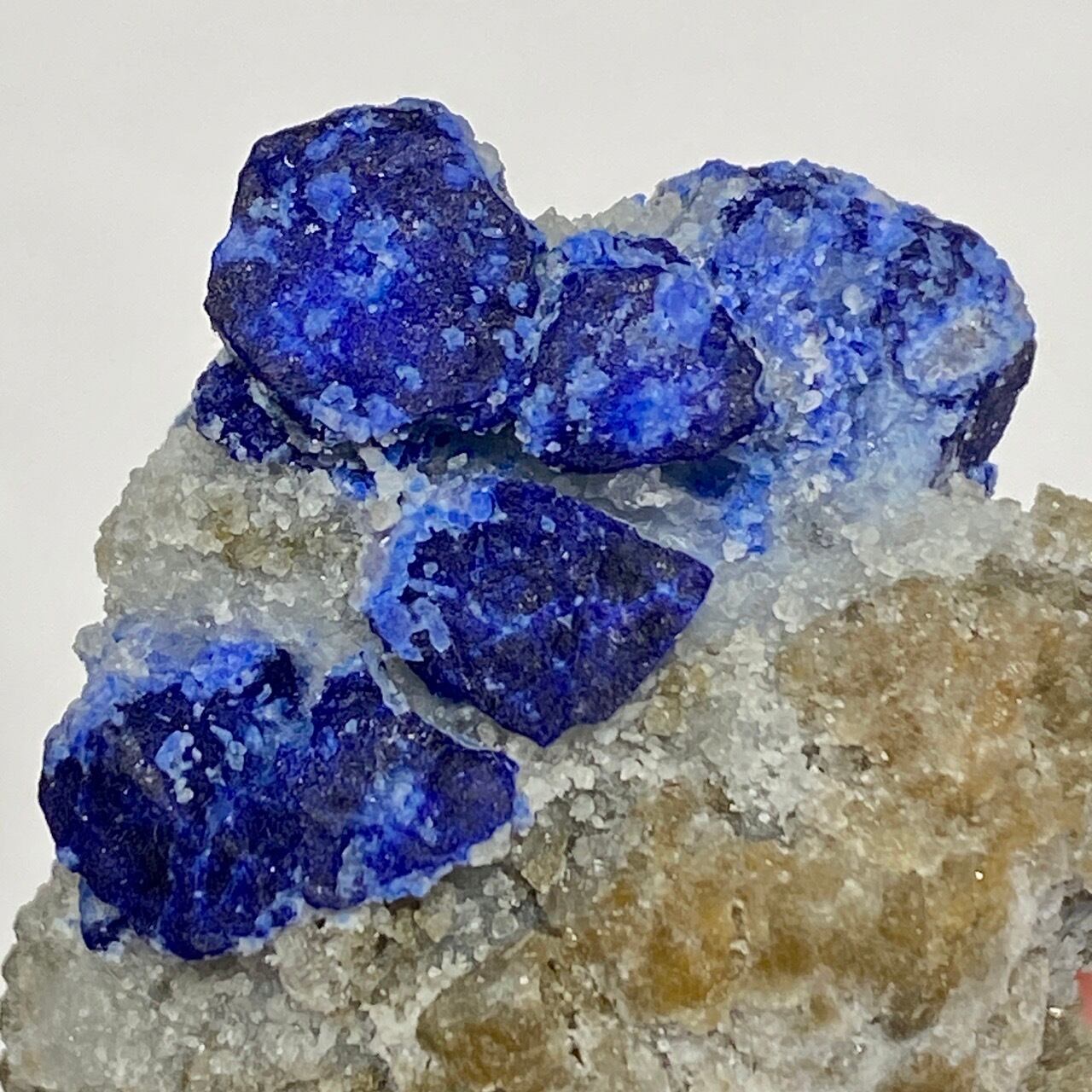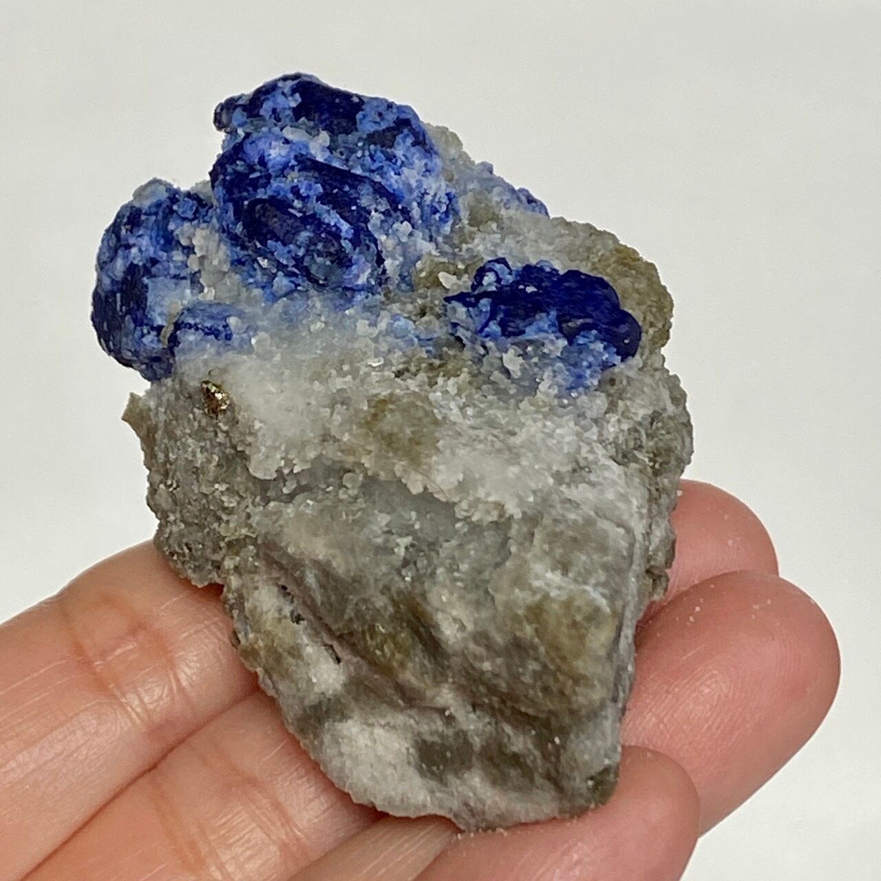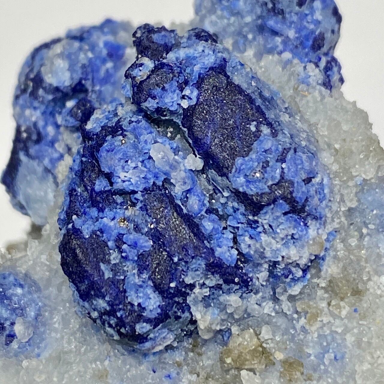 ラピスラズリでお馴染みのラズライト(LAZURITE 青金石)のパイライト入りスペシメンになります。このシリーズの石は、ものによってはカルサイトを含みます。母岩に発色の良いブルーベリーのような瑠璃色のラズライトの塊が豊富に付いている、ドルチェのような子です。また、パイライトも若干付いています。ラズライト部分が濃淡になっているのに加え、シュガーパウダーの様な白っぽい色も混じっている為、ドルチェ感が増しています。尚、インスタグラムでこのシリーズの動画を確認頂けます。
