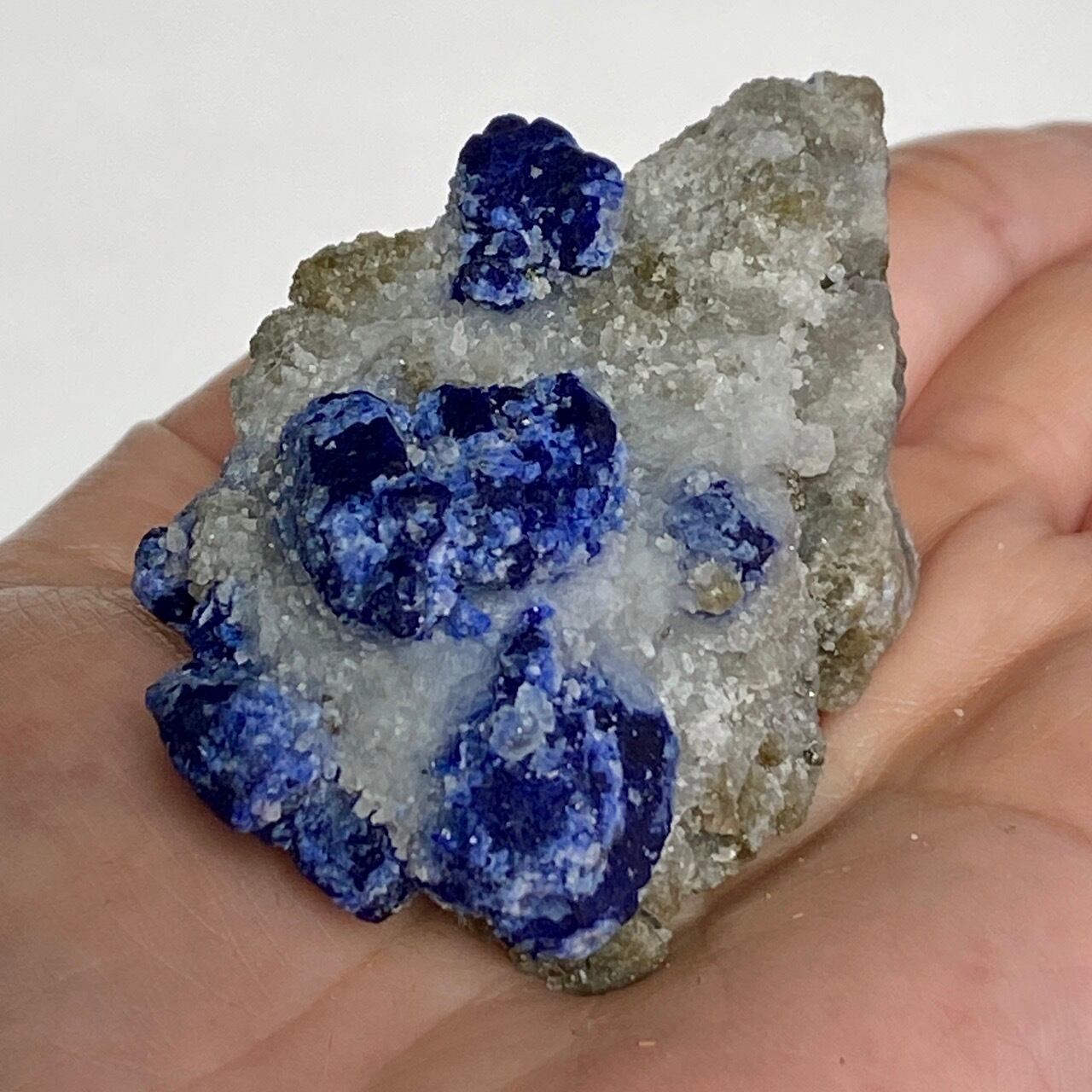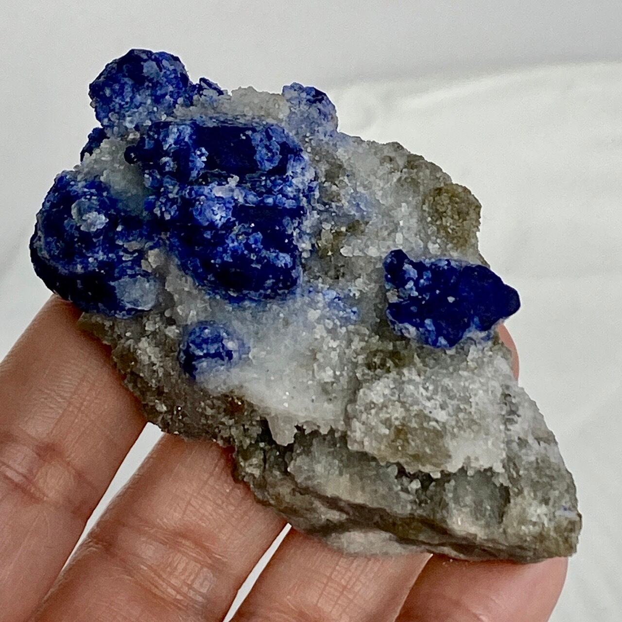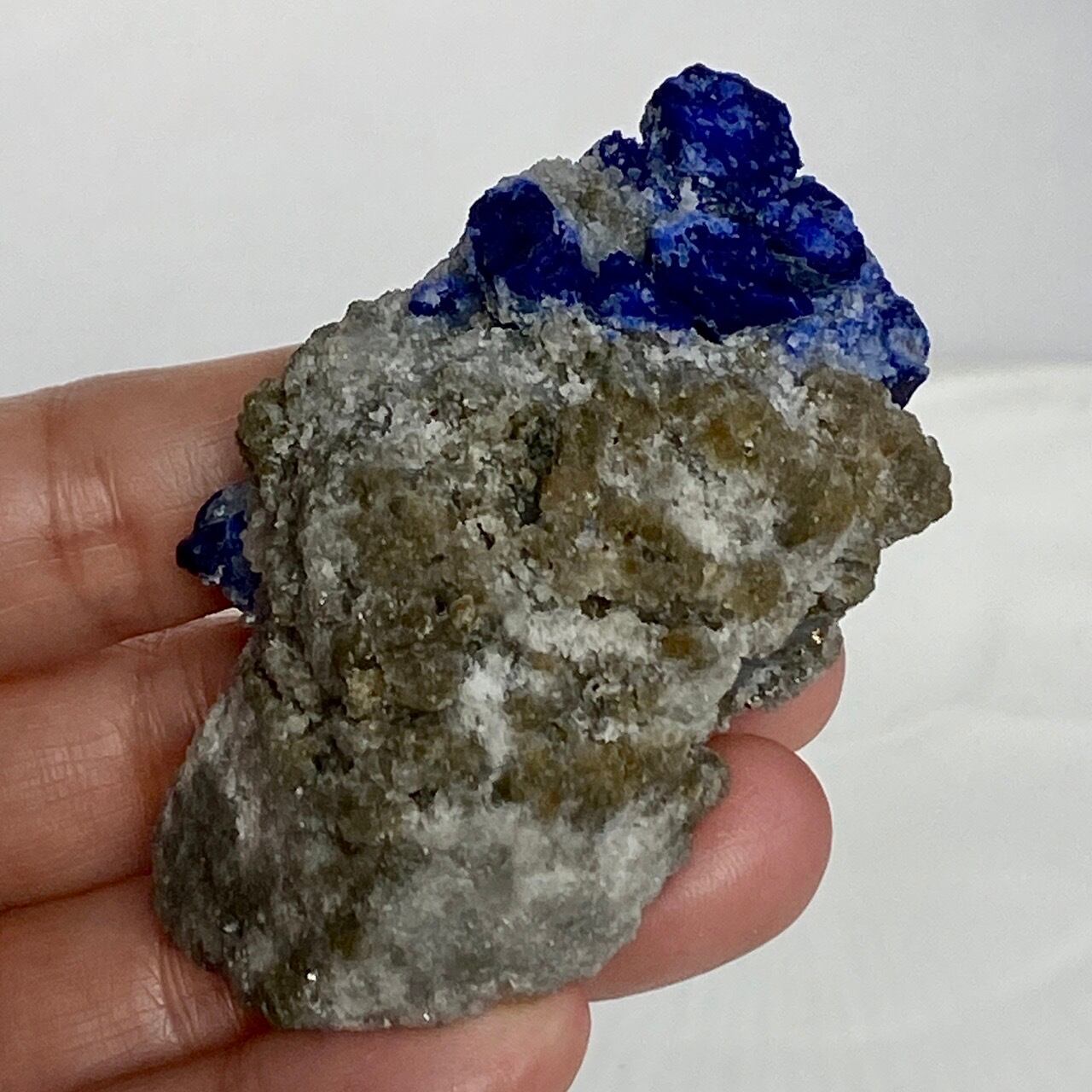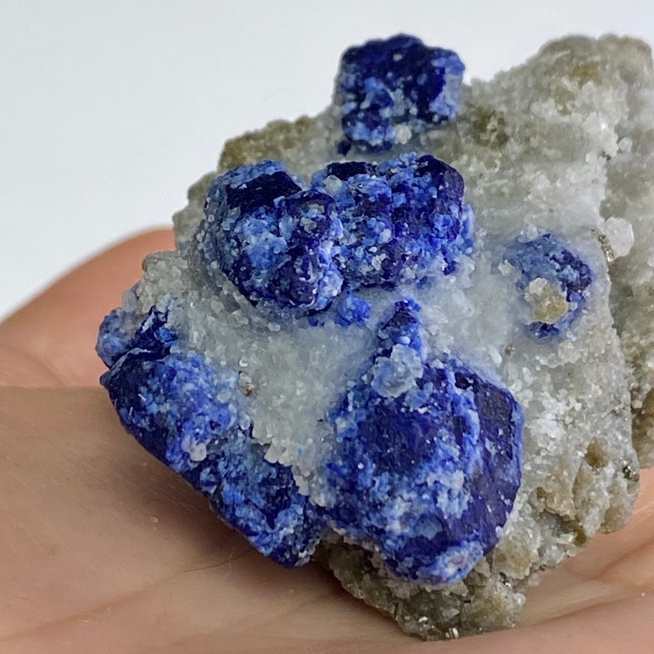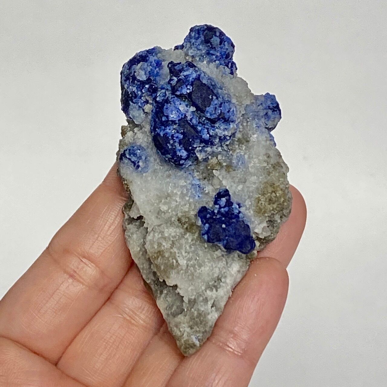 ラピスラズリでお馴染みのラズライト(LAZURITE 青金石)のパイライト入りスペシメンになります。このシリーズの石は、ものによってはカルサイトを含みます。母岩に発色の良いブルーベリーのような瑠璃色のラズライトの塊が豊富に付いている、ドルチェのような子です。また、パイライトも若干付いています。ラズライト部分が濃淡になっているのに加え、シュガーパウダーの様な白っぽい色も混じっている為、ドルチェ感が増しています。尚、インスタグラムでこのシリーズの動画を確認頂けます。