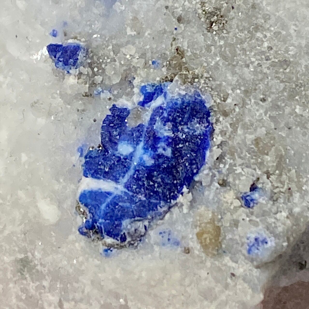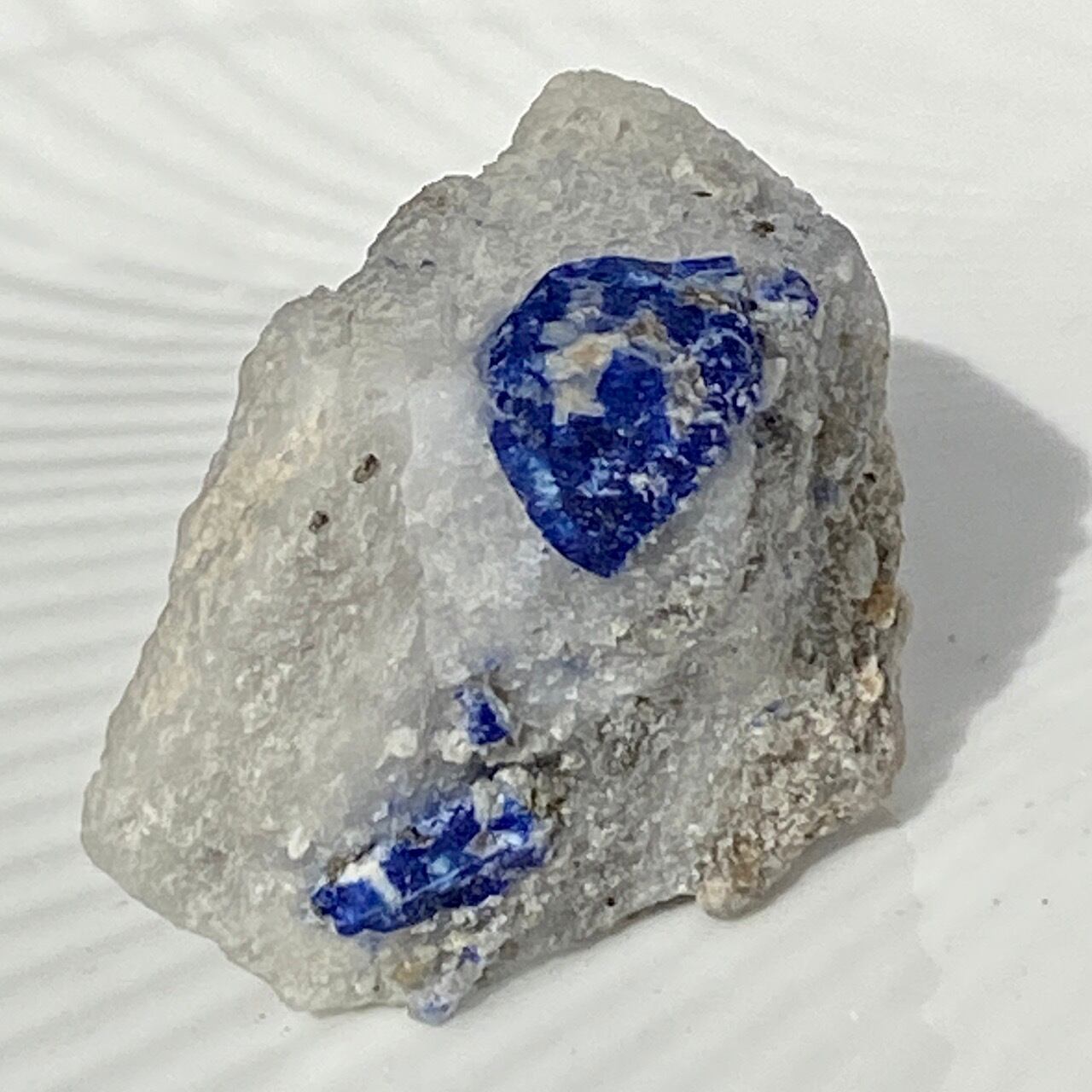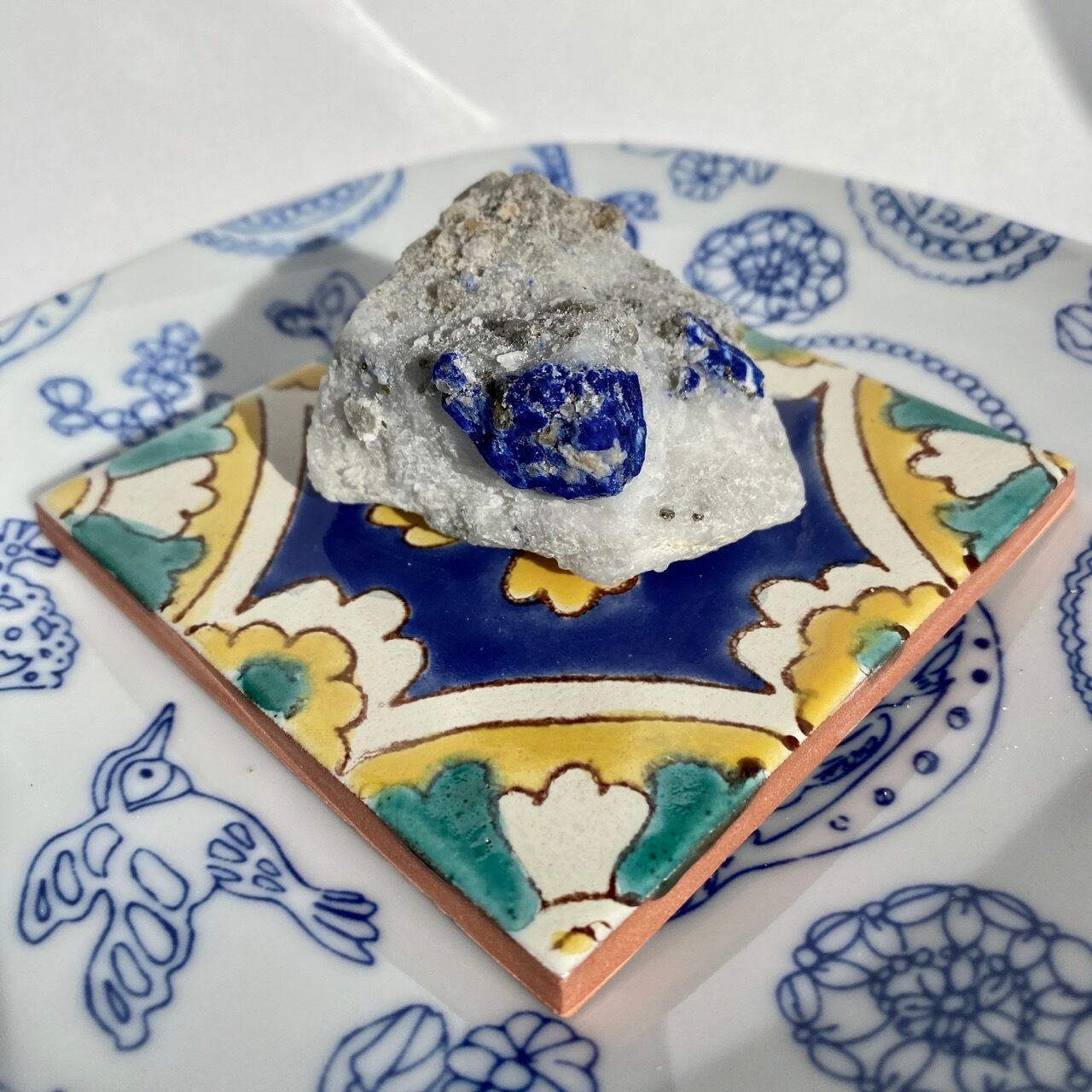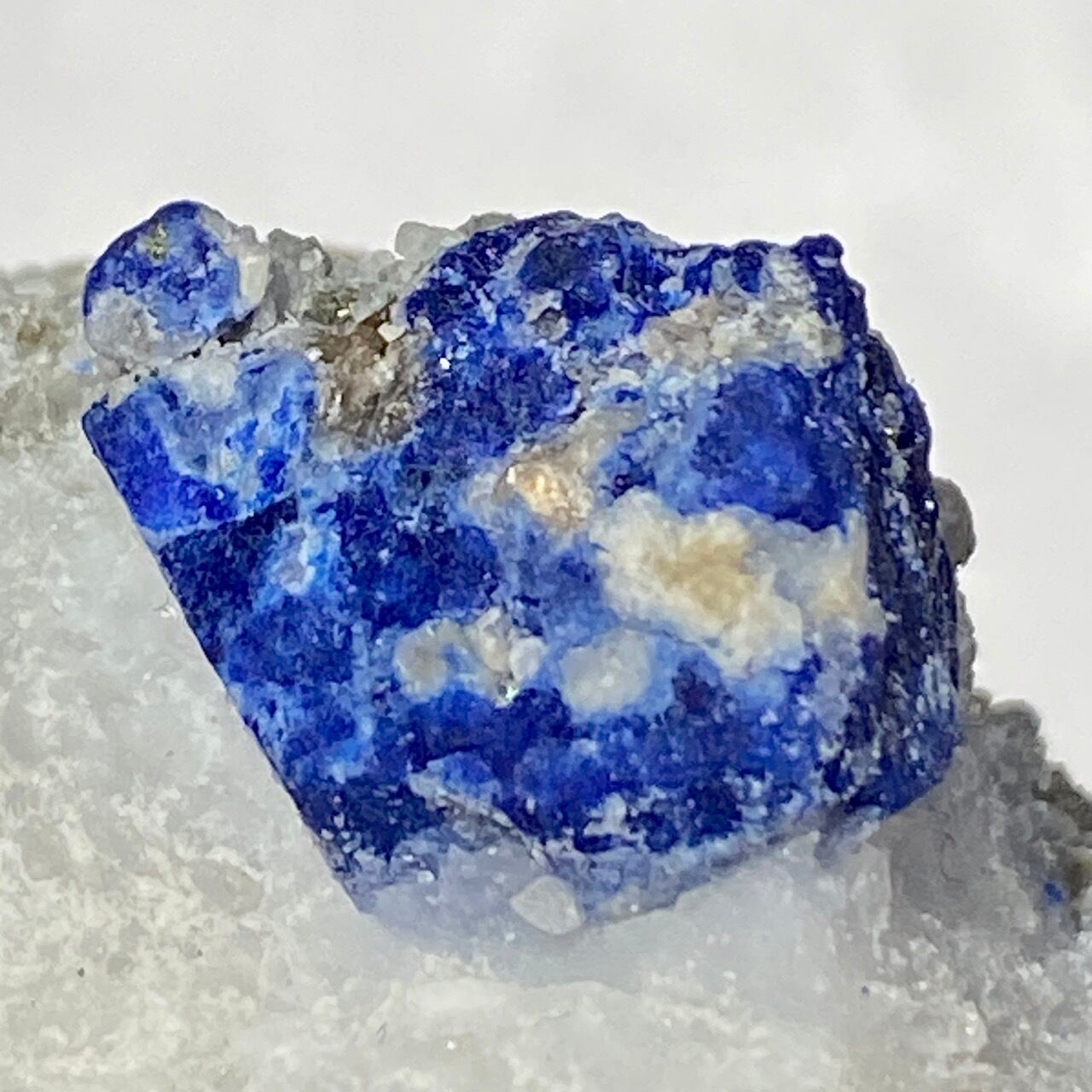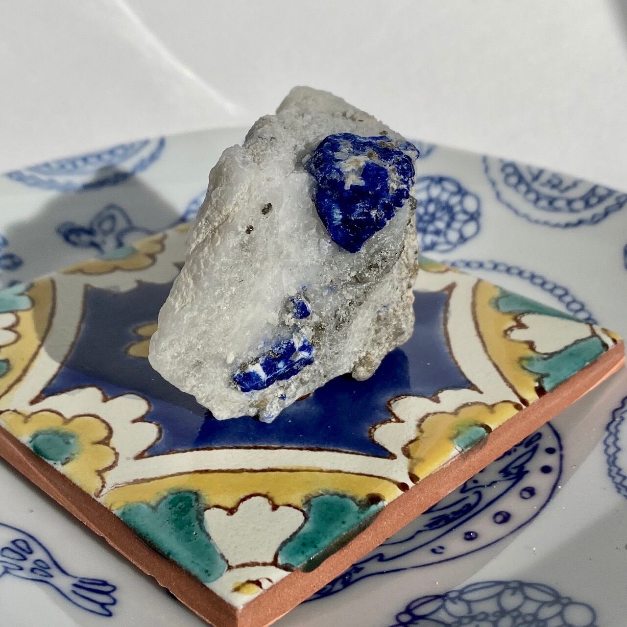 ラピスラズリの主成分でお馴染みのラズライト(LAZURITE 青金石)のスペシメンになります。このシリーズの石は、ものによってはカルサイトを含みます。母岩に配された発色の良い瑠璃色のラズライトと、ほんのわずかですが極小のパイライトが付着しています。尚、インスタグラムでこのシリーズの動画を確認頂けます。