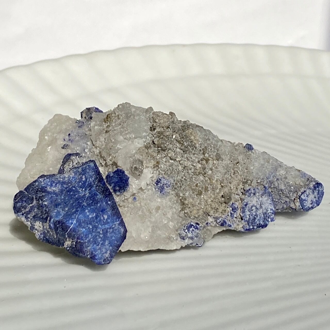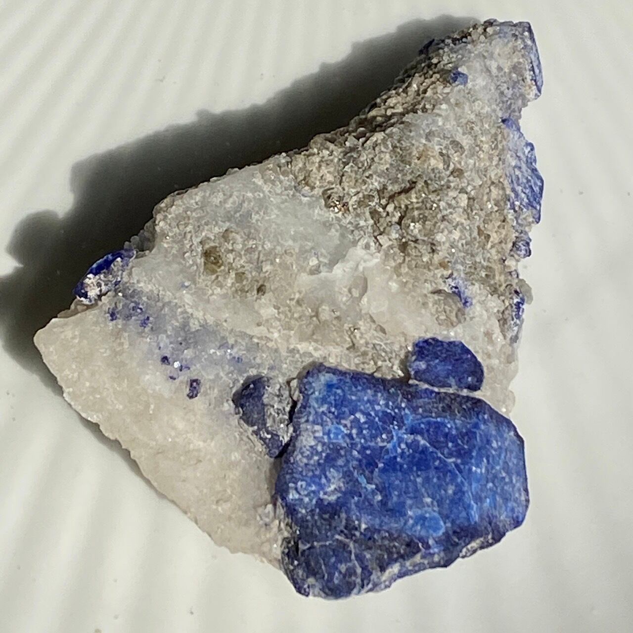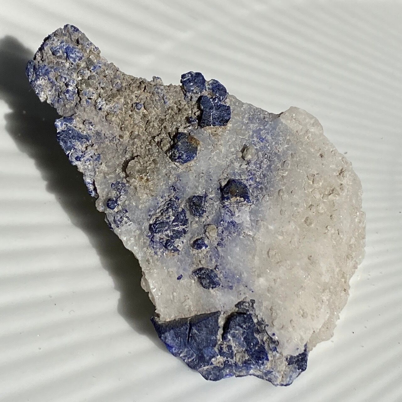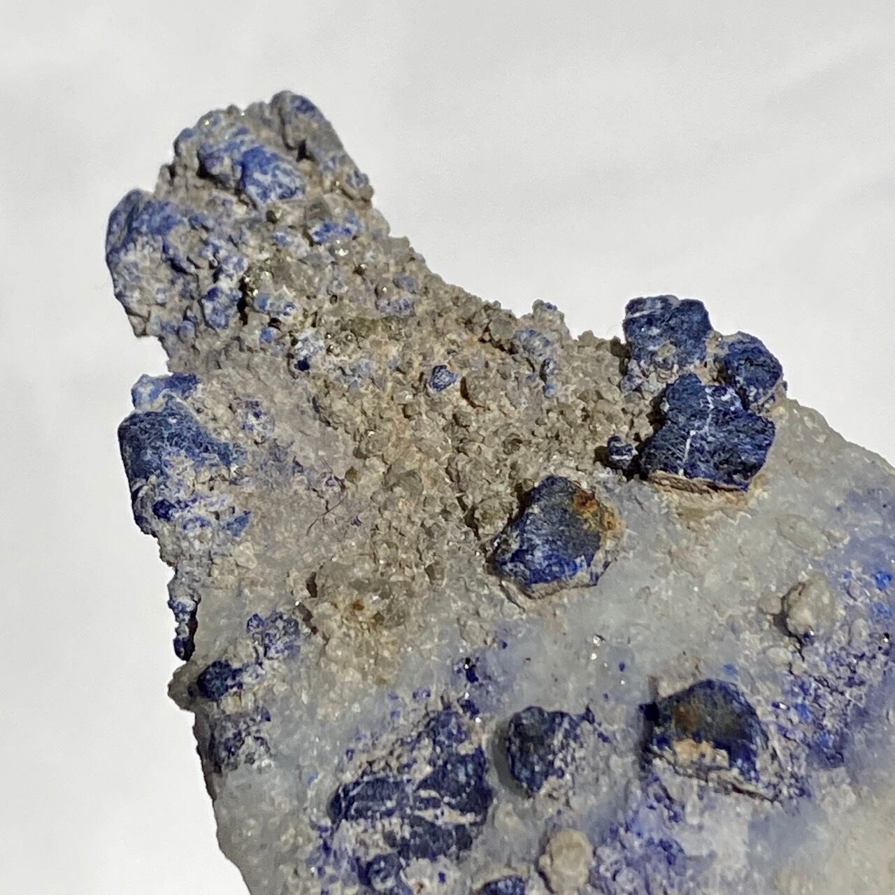 ラピスラズリの主成分でお馴染みのラズライト(LAZURITE 青金石)のパイライト入りスペシメンになります。このシリーズの石は、ものによってはカルサイトを含みます。母岩に所々配された瑠璃色のラズライトに、所々に極小の金色のパイライトが添えられたケーキのような子です。底面にも小さなラズライトの塊が沢山付着(最終画像に掲載)しています。尚、インスタグラムでこのシリーズの動画を確認頂けます。