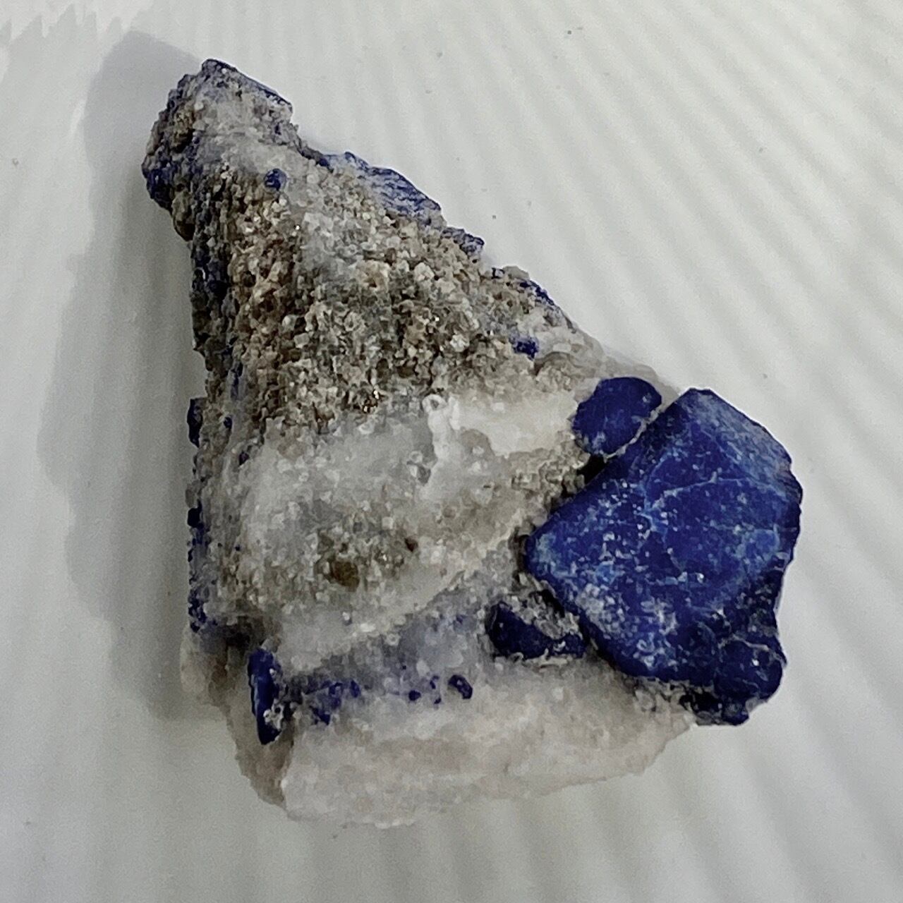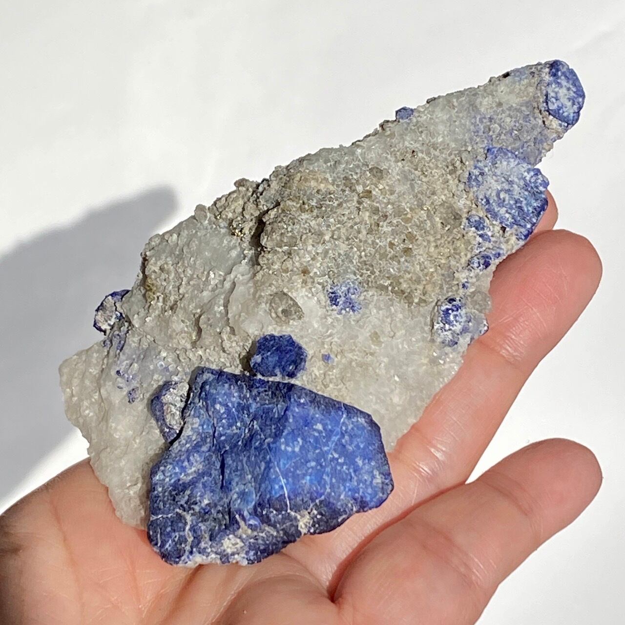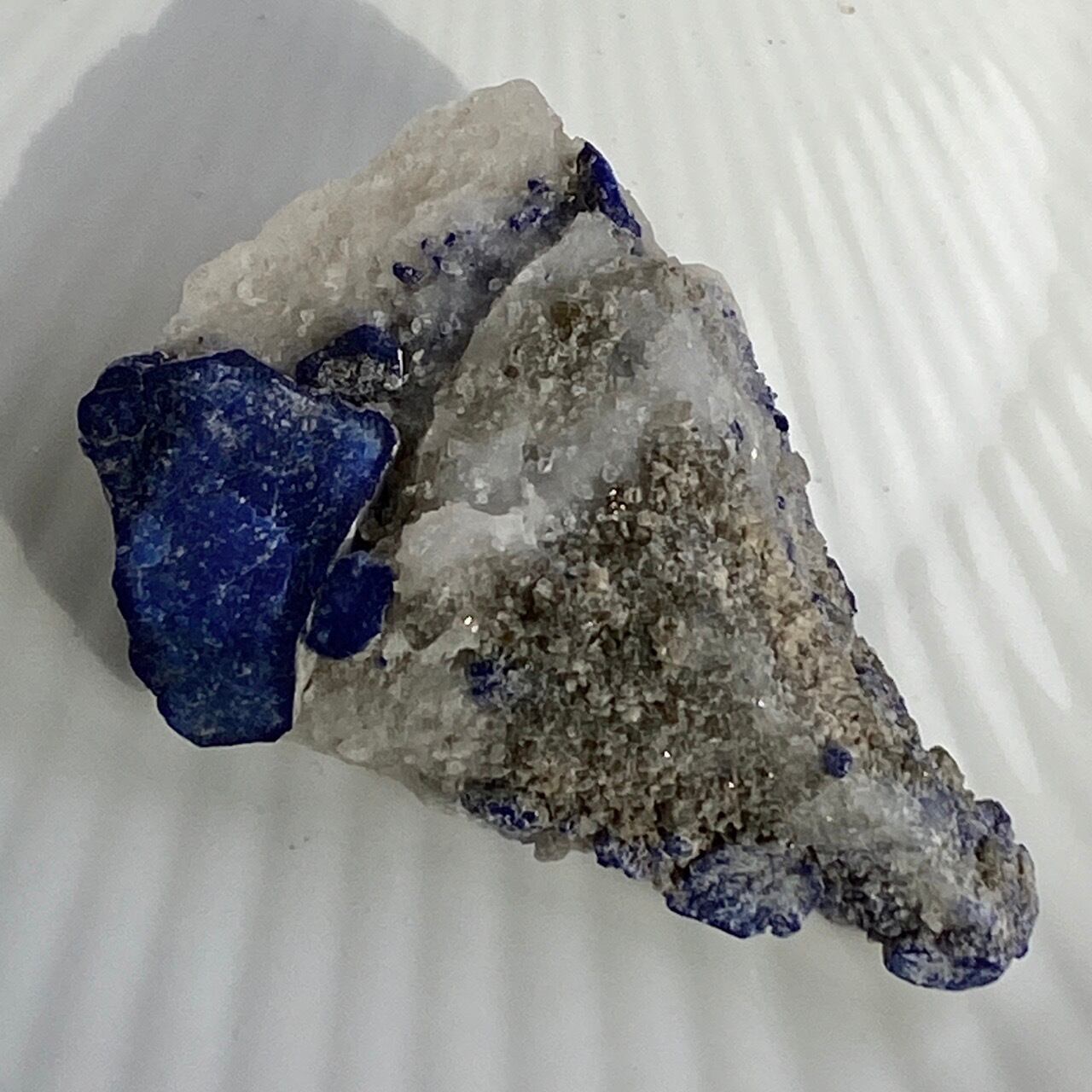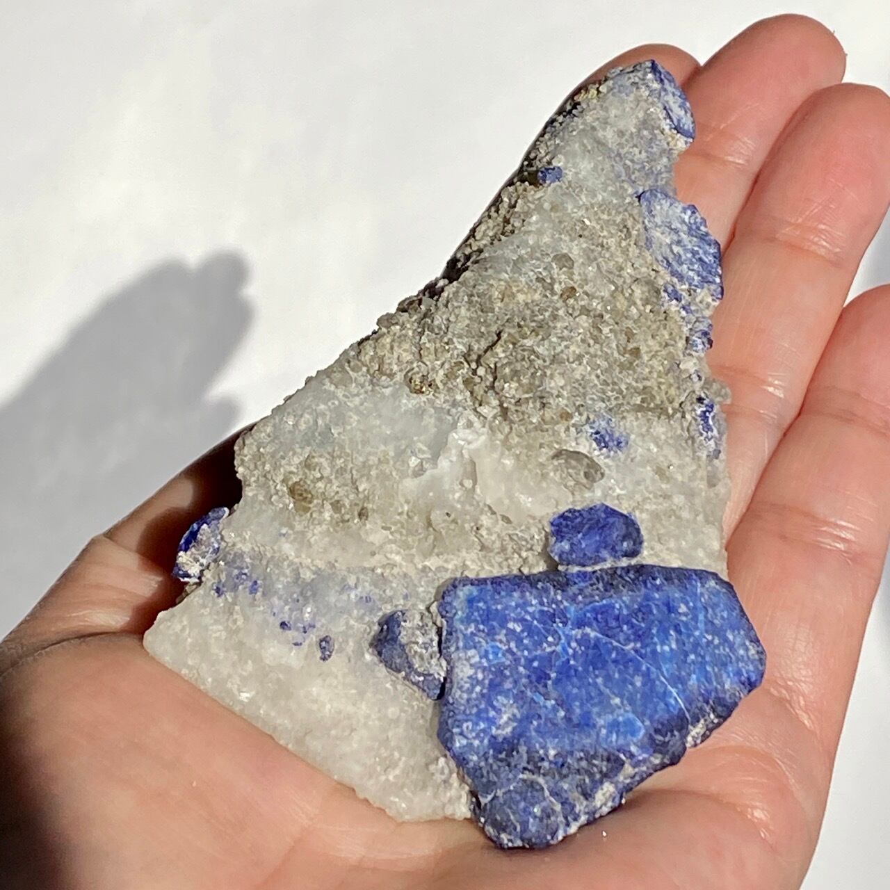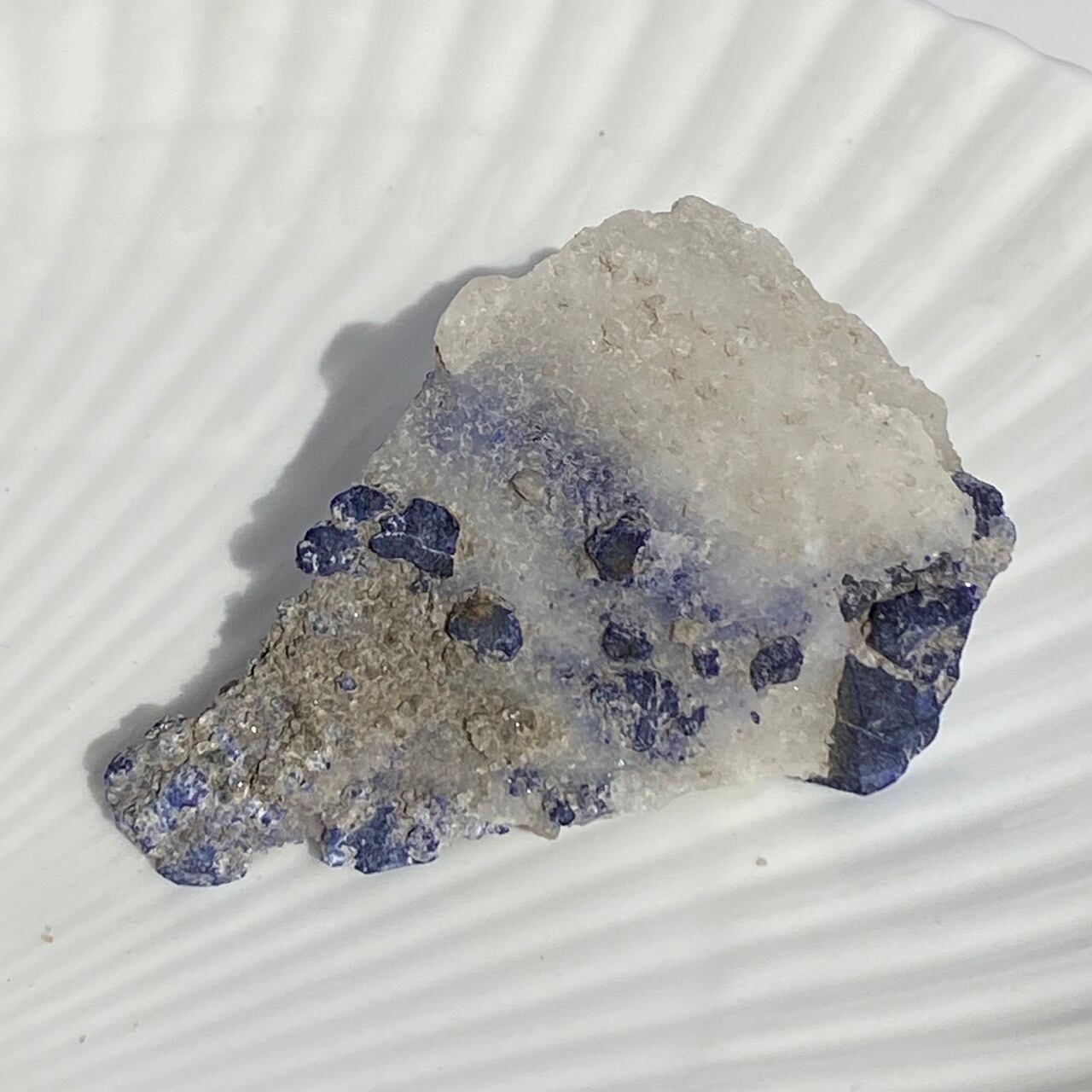ラピスラズリの主成分でお馴染みのラズライト(LAZURITE 青金石)のパイライト入りスペシメンになります。このシリーズの石は、ものによってはカルサイトを含みます。母岩に所々配された瑠璃色のラズライトに、所々に極小の金色のパイライトが添えられたケーキのような子です。底面にも小さなラズライトの塊が沢山付着(最終画像に掲載)しています。尚、インスタグラムでこのシリーズの動画を確認頂けます。