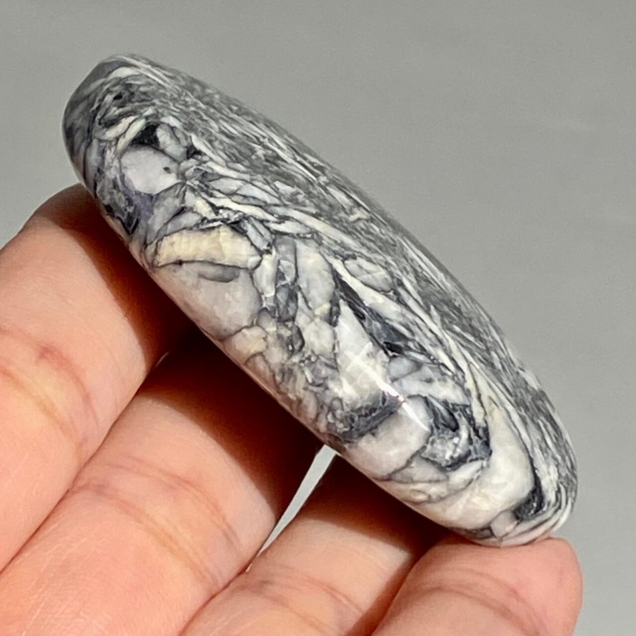 ※この石の特徴ですが、細かいクラックやチップ、そしてキズや凹みがあります。画像では表面がラフに見えますが、研磨されています。ピノリスにはオフホワイト・アイボリー部分に黄身(もしくは山吹色)がかった箇所がございますが、これはピノリスの原石に含まれる色味で、避けることはできません。