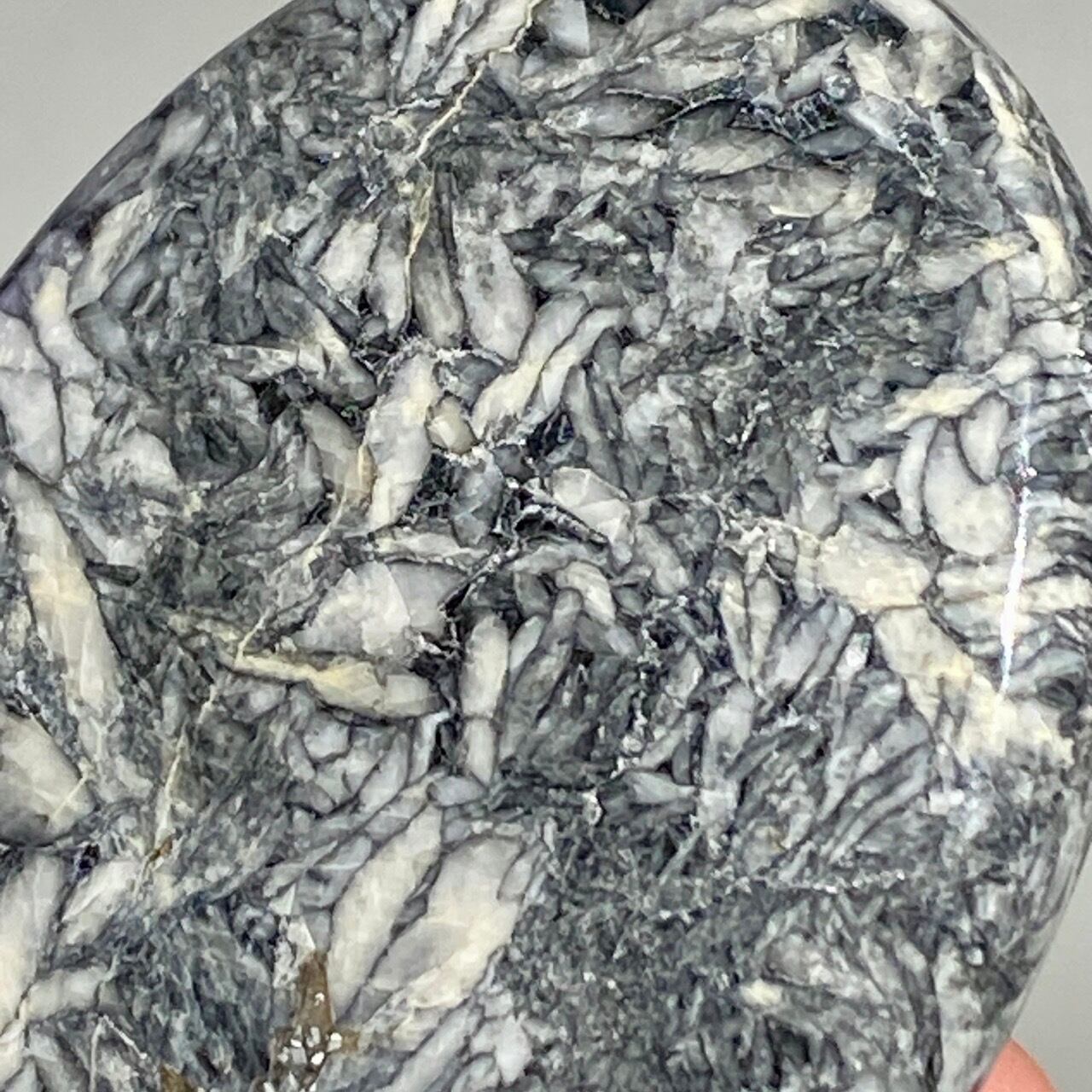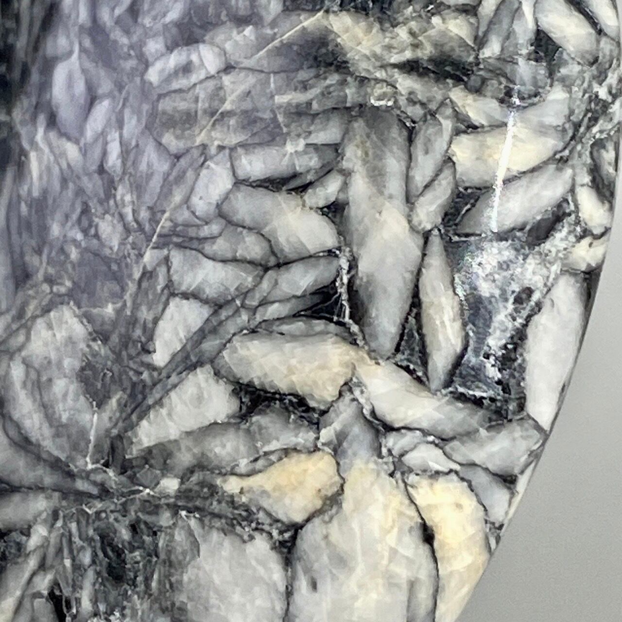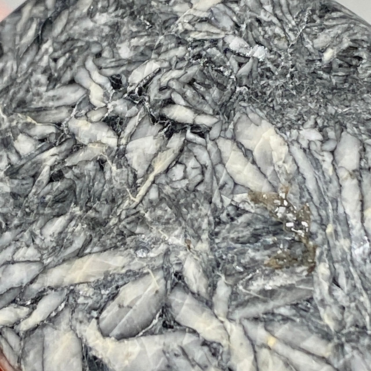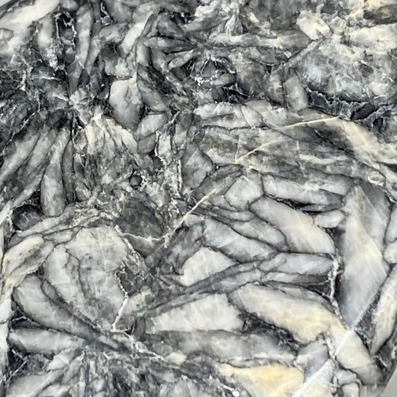 黒いドロマイト/グラファイト部分に見られる白っぽい(時には黄身がかった)マグネサイトの葉のような模様が芸術的です。