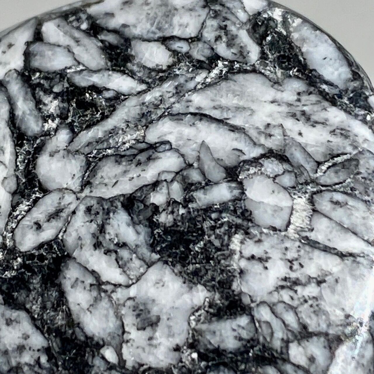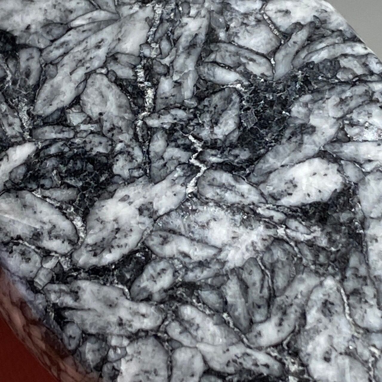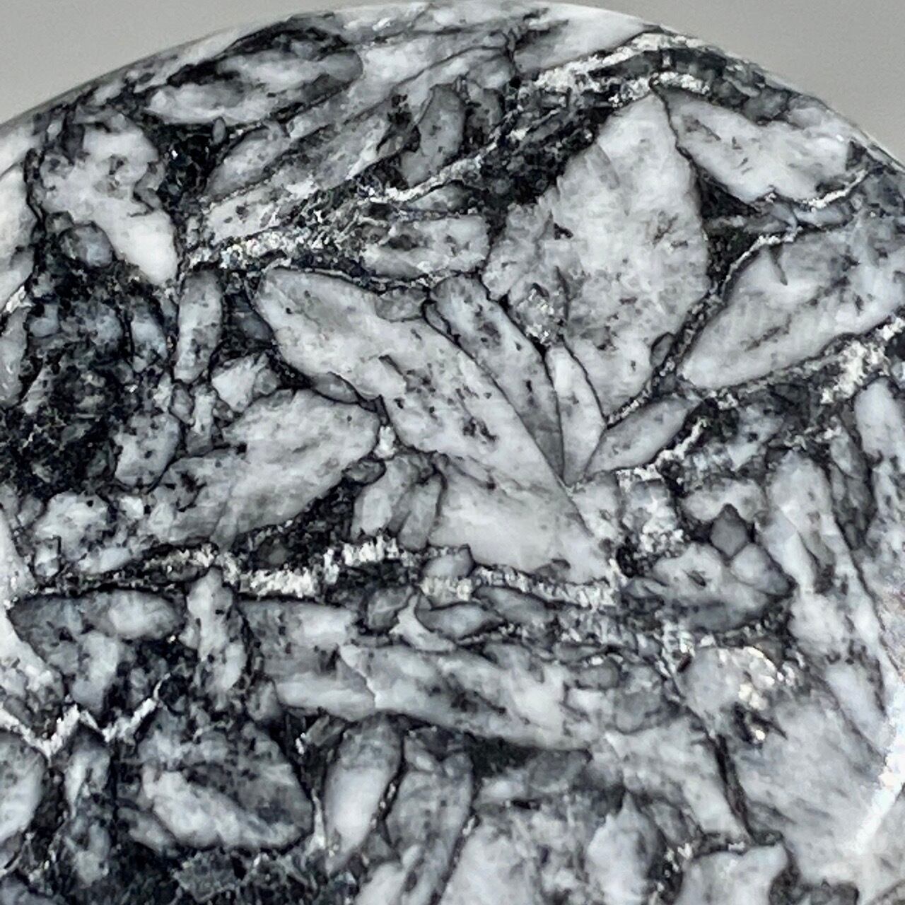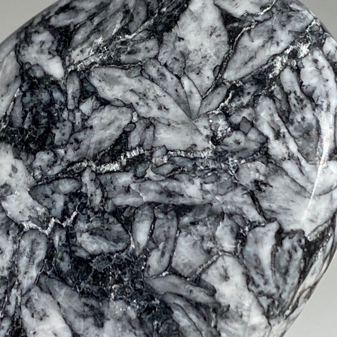 黒いドロマイト/グラファイト部分に見られる白っぽい(時には黄身がかった)マグネサイトの葉のような模様が芸術的です。