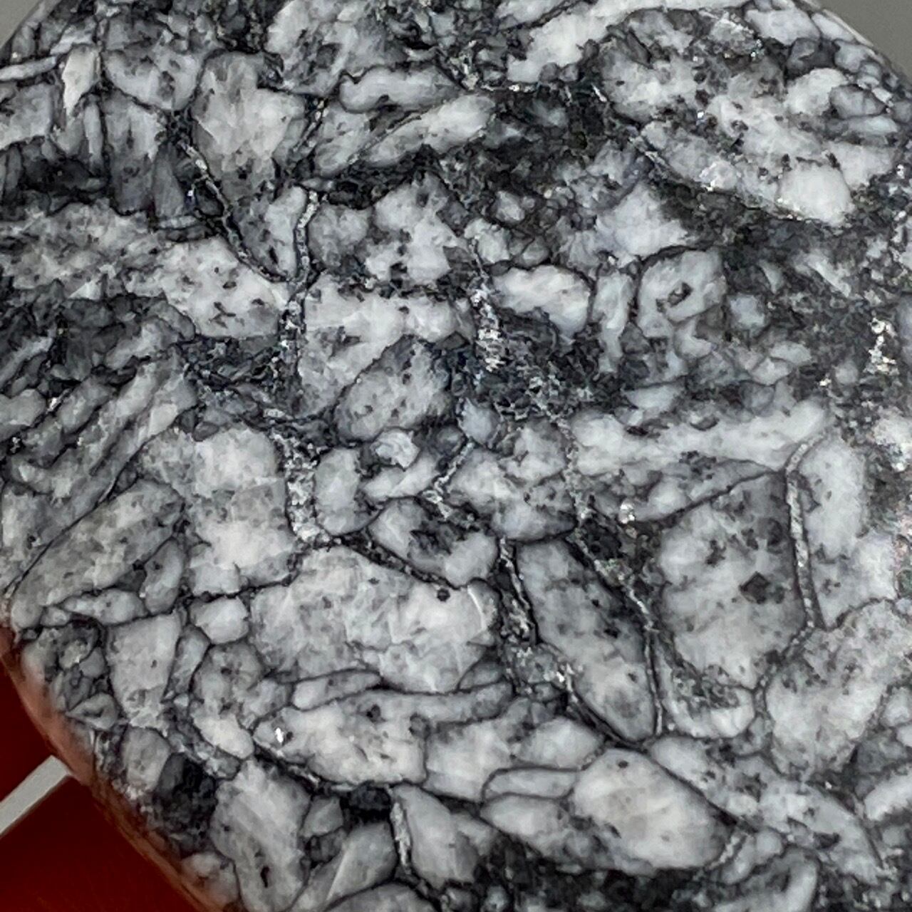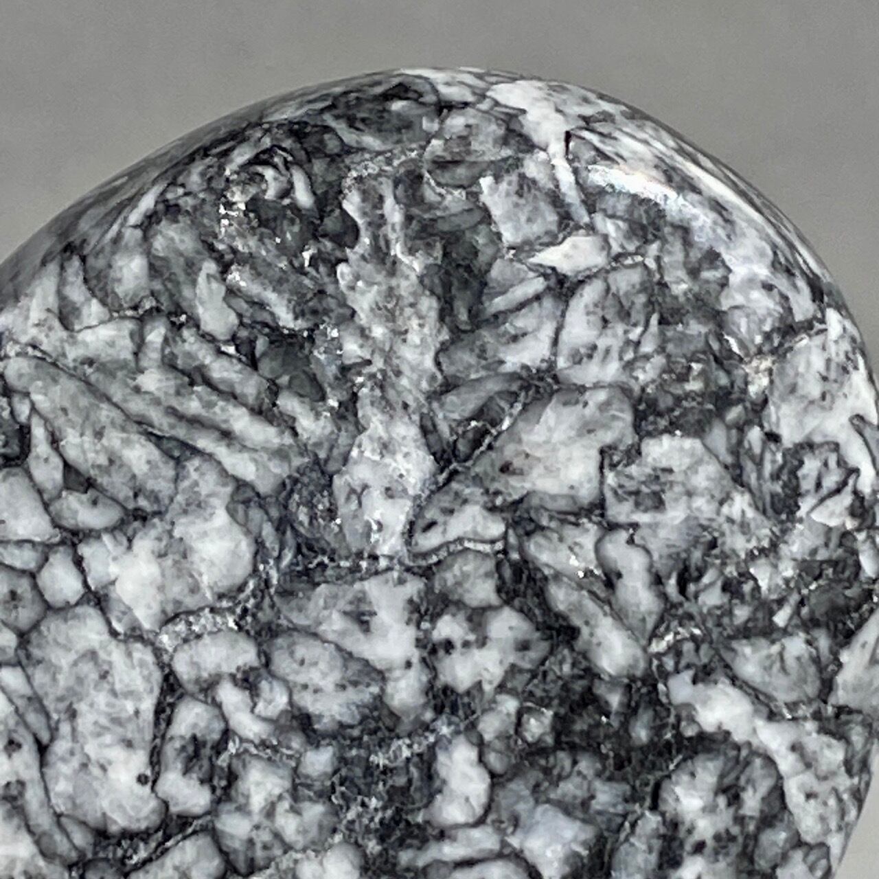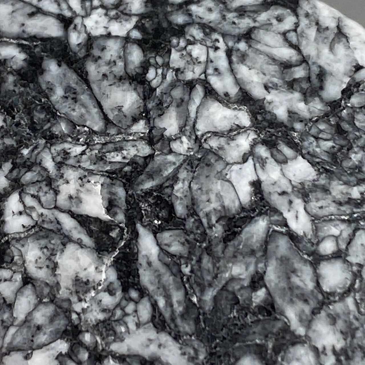 黒いドロマイト/グラファイト部分に見られる白っぽい(時には黄身がかった)マグネサイトの葉のような模様が芸術的です。