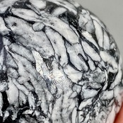 黒いドロマイト/グラファイト部分に見られる白っぽい(時には黄身がかった)マグネサイトの葉のような模様が芸術的です。
