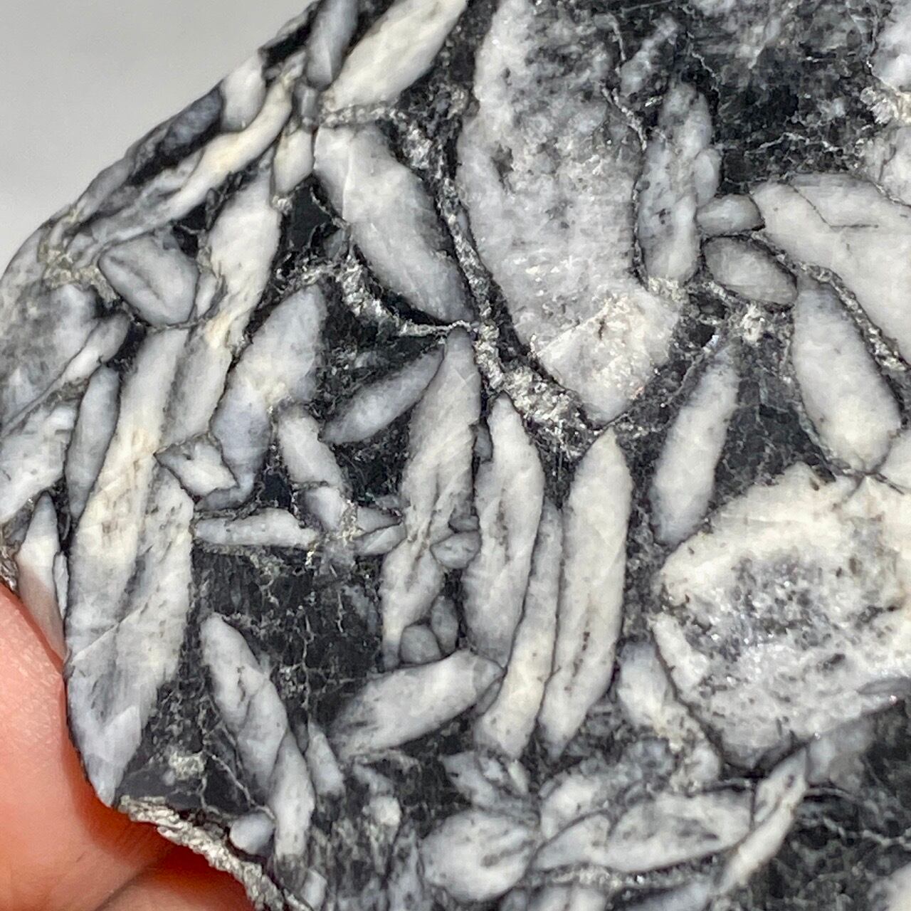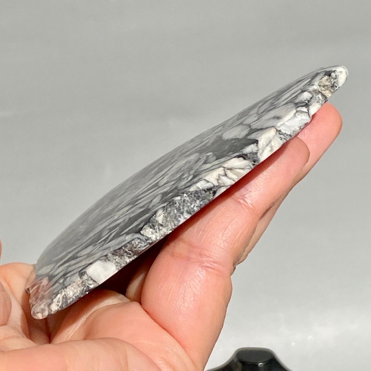 ※この石の特徴ですが、クラックやチップ、そしてキズや凹凸(溝含む)があります。画像では表面がラフに見えますが、研磨されています。縁のみ、原石そのままのシルエットで研磨されていません(場所によっては尖っているため取り扱い注意)。また、ピノリスのオフホワイト・アイボリー部分に黄身(もしくは山吹色)がかった箇所がございますが、これはピノリスの原石に含まれる色味で、避けることはできません。