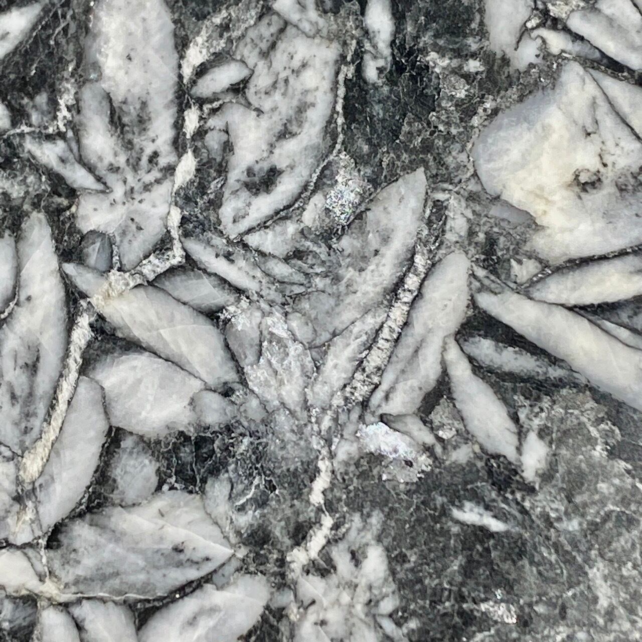 黒いドロマイト/グラファイト部分に見られる白っぽい(時には黄身がかった)マグネサイトの葉のような模様が芸術的です。