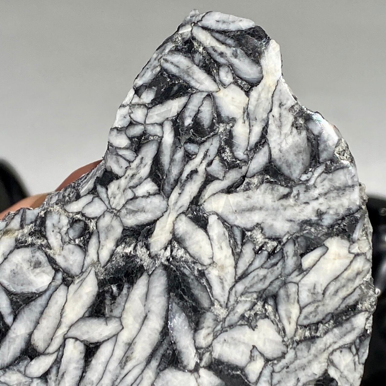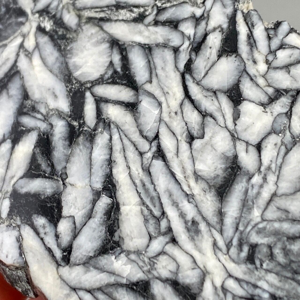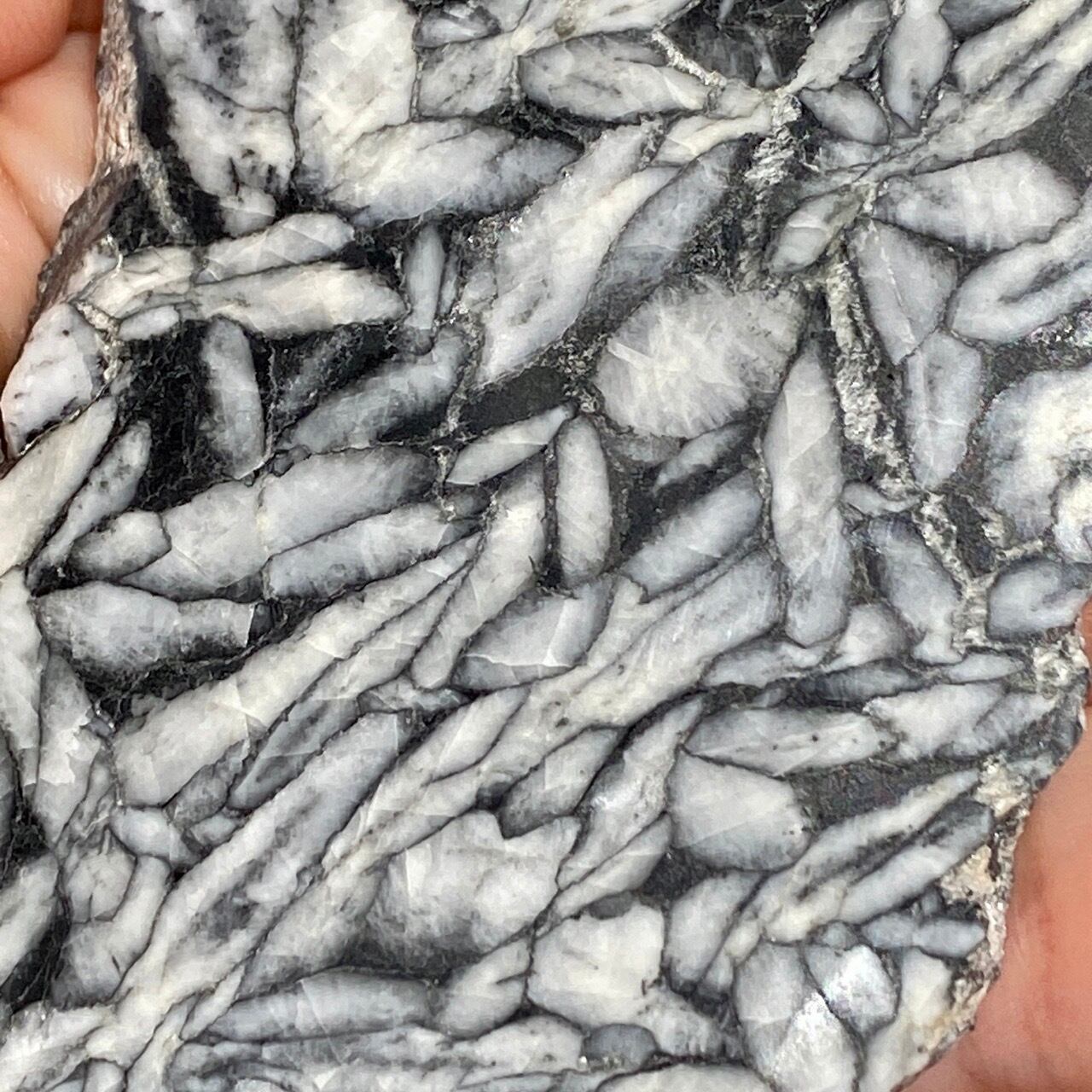 黒いドロマイト/グラファイト部分に見られる白っぽい(時には黄身がかった)マグネサイトの葉のような模様が芸術的です。