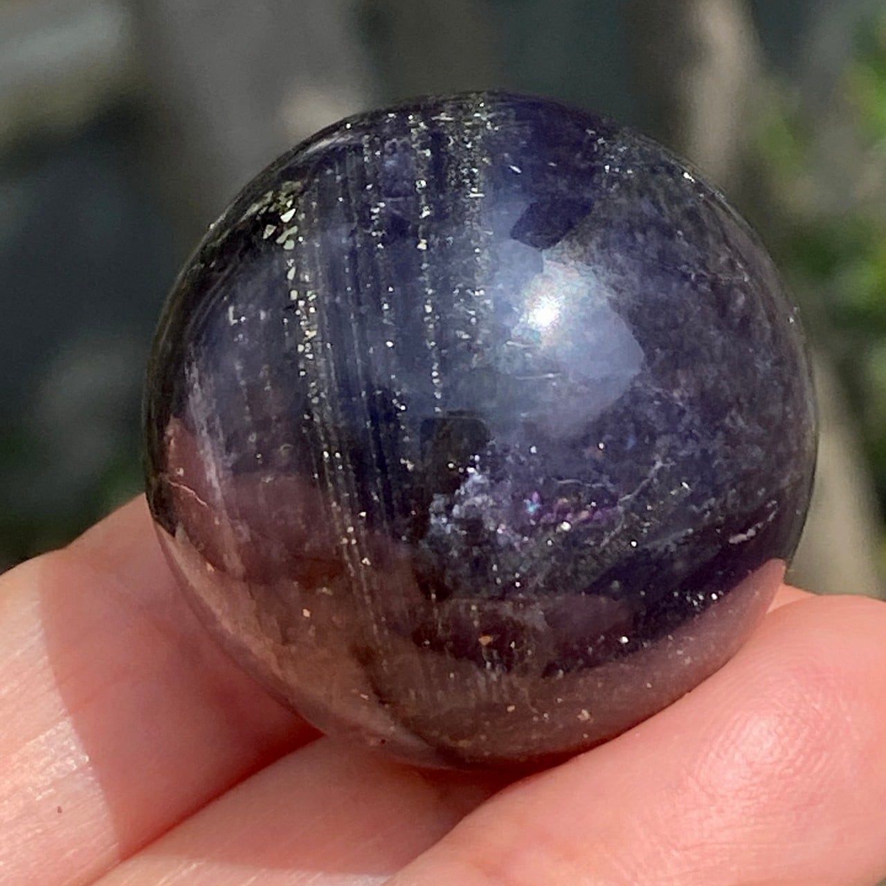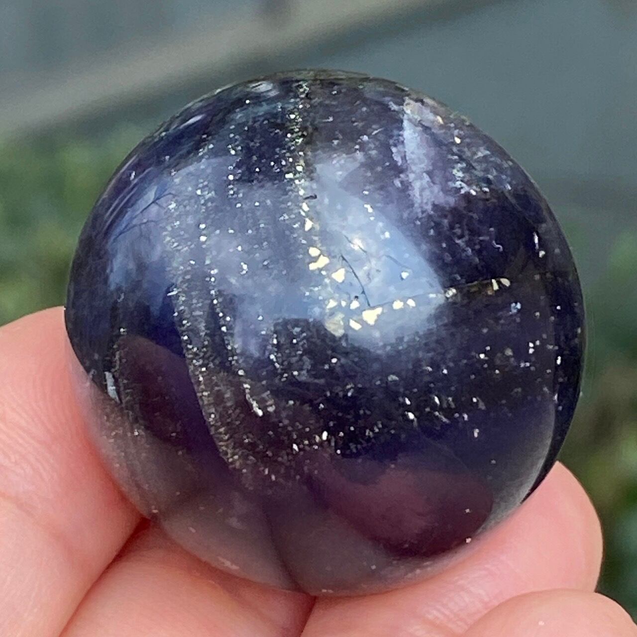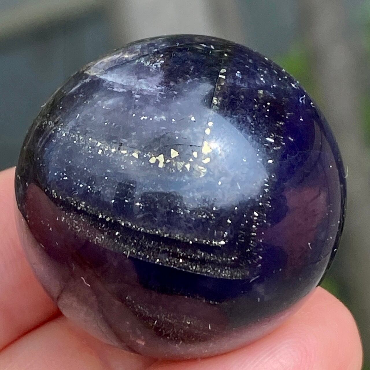 ミッドナイトパープルを超えたダークな宇宙(フローライト)に煌めく星(パイライト)を彷彿させるような子です。フローライト特有のV字のバンディングが2箇所あり、その部分から覗くパイライトが魅力的です。