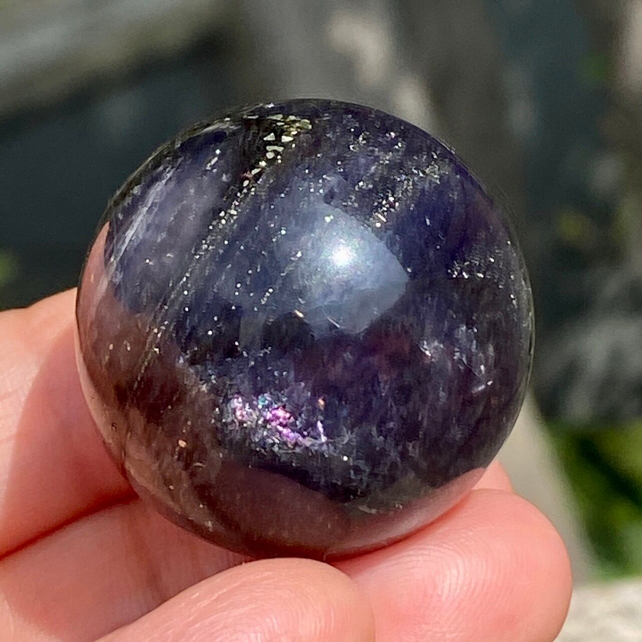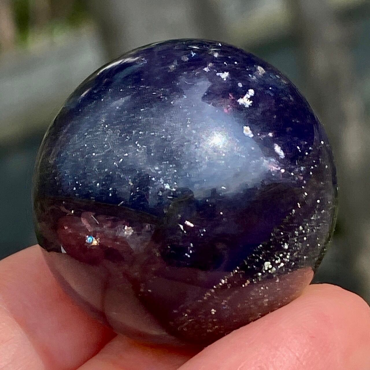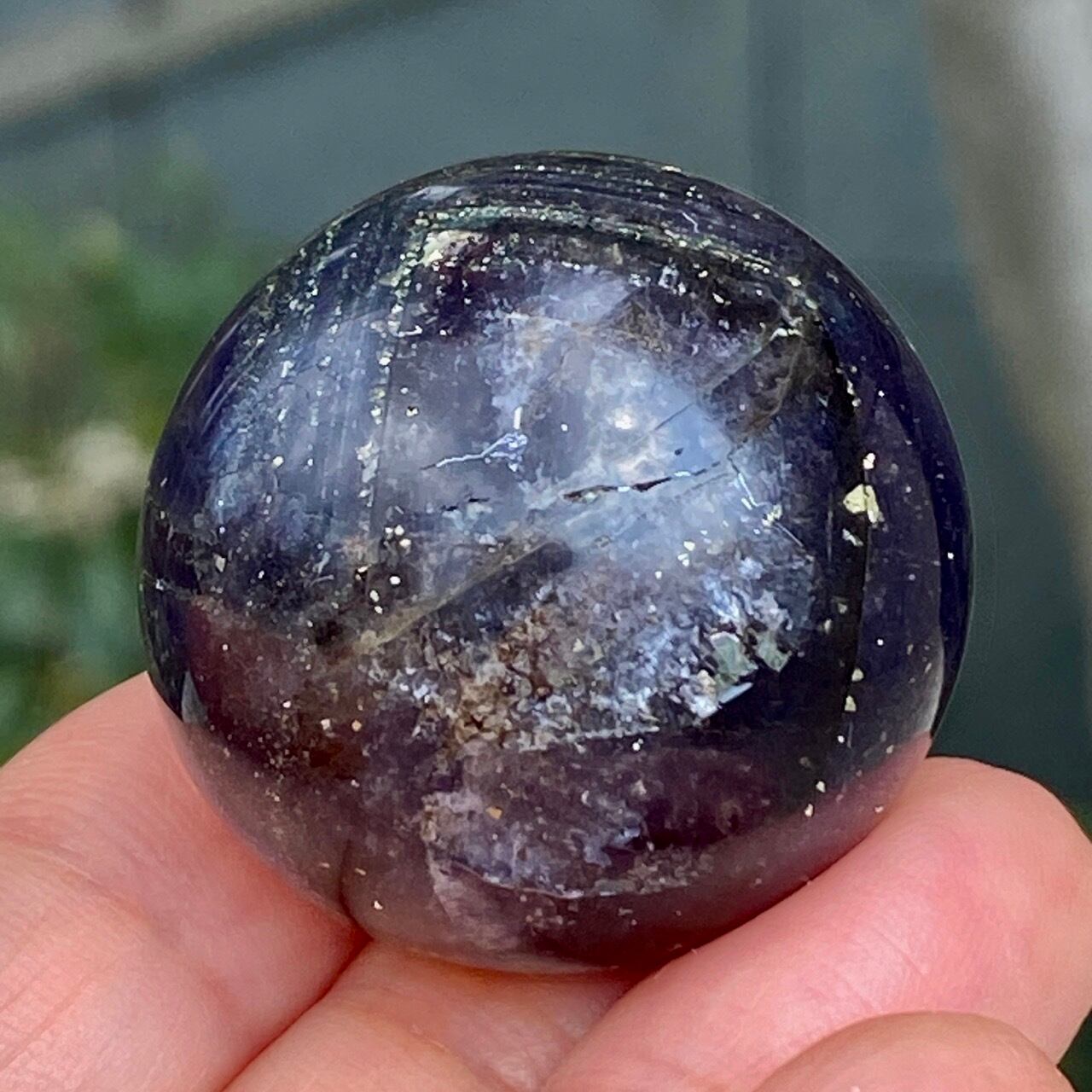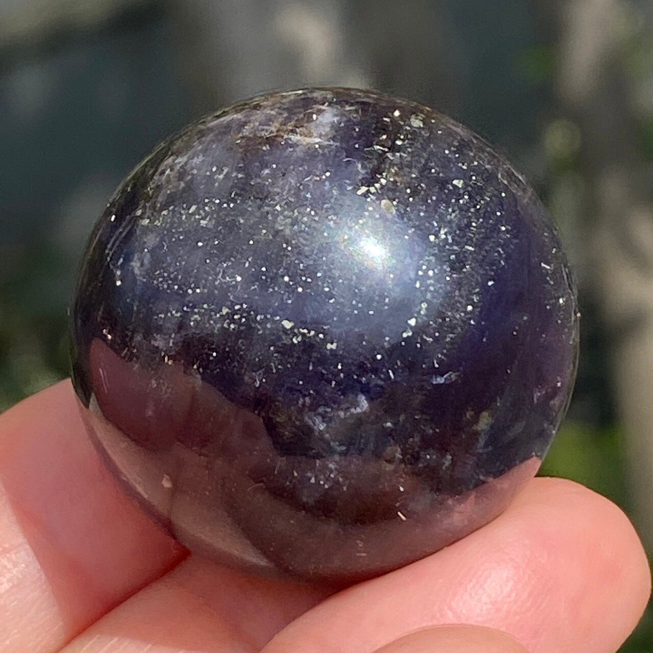 ミッドナイトパープルを超えたダークな宇宙(フローライト)に煌めく星(パイライト)を彷彿させるような子です。フローライト特有のV字のバンディングが2箇所あり、その部分から覗くパイライトが魅力的です。