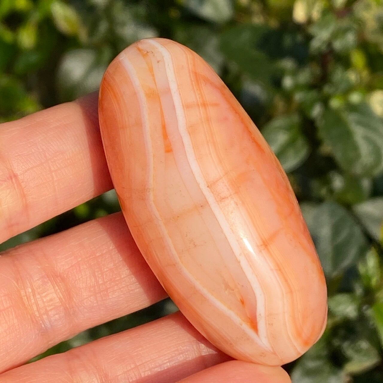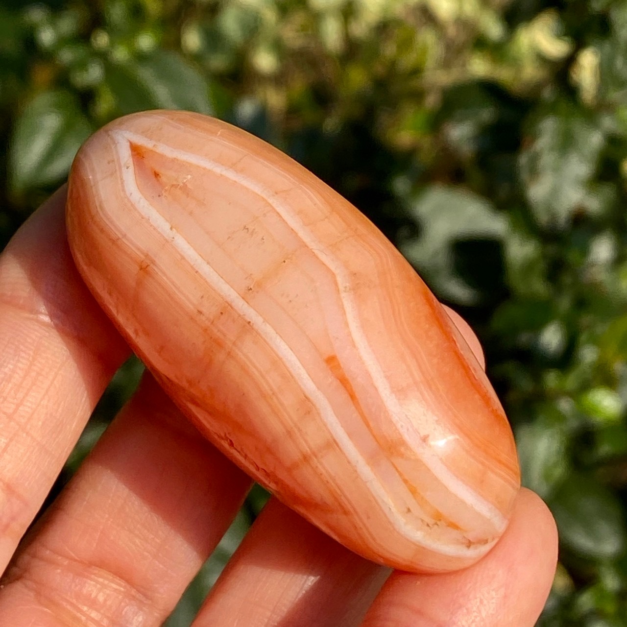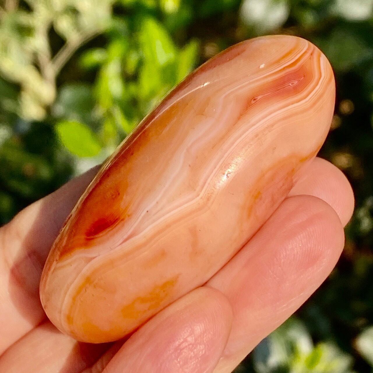 アゲート特有のバンディング(帯状の模様)がサイド部分をぐるっと取り囲んでいます。通常のカーネリアンとは異なり色味は優しい感じで、形状が握り易いです。