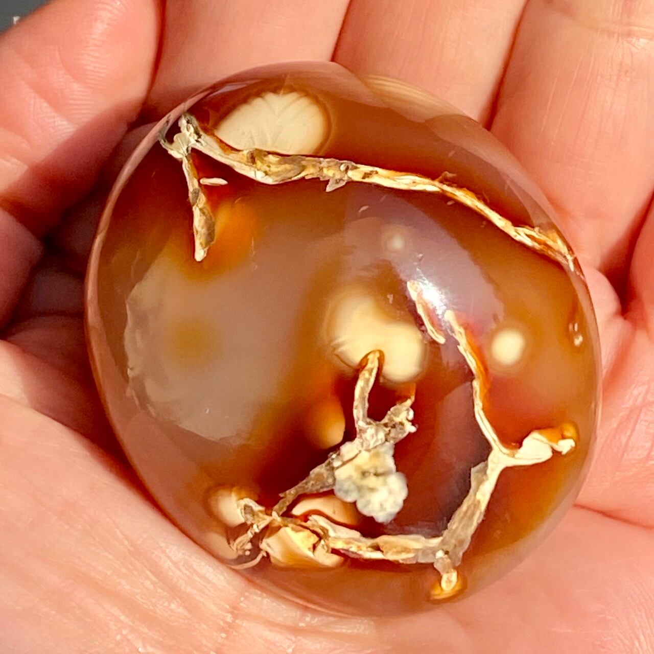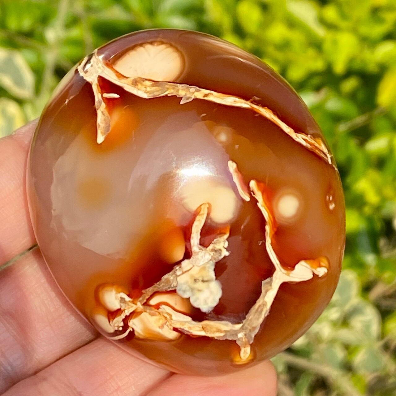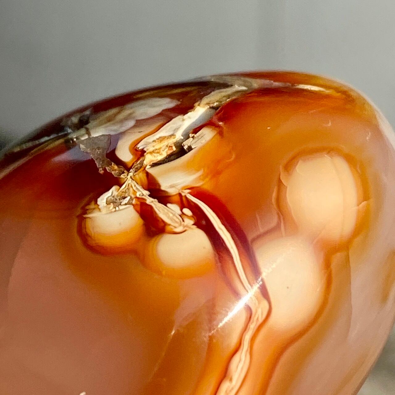 ※カーネリアンやアゲート特有のクラックやキズ、チップ、そして凹みや溝等(この子は特に、片面の枝模様に沿って、深めの凹みやチップが複数箇所有)がございます。