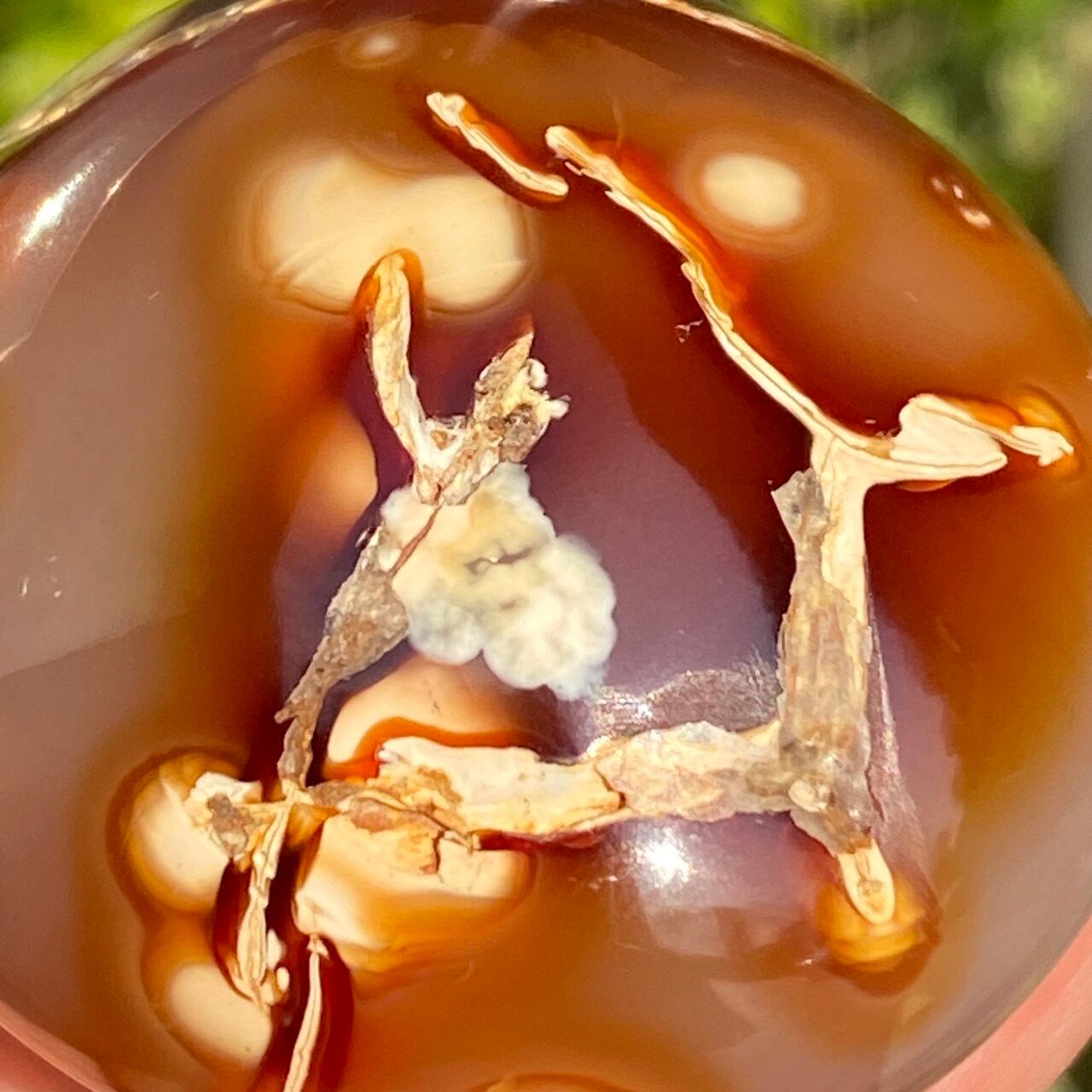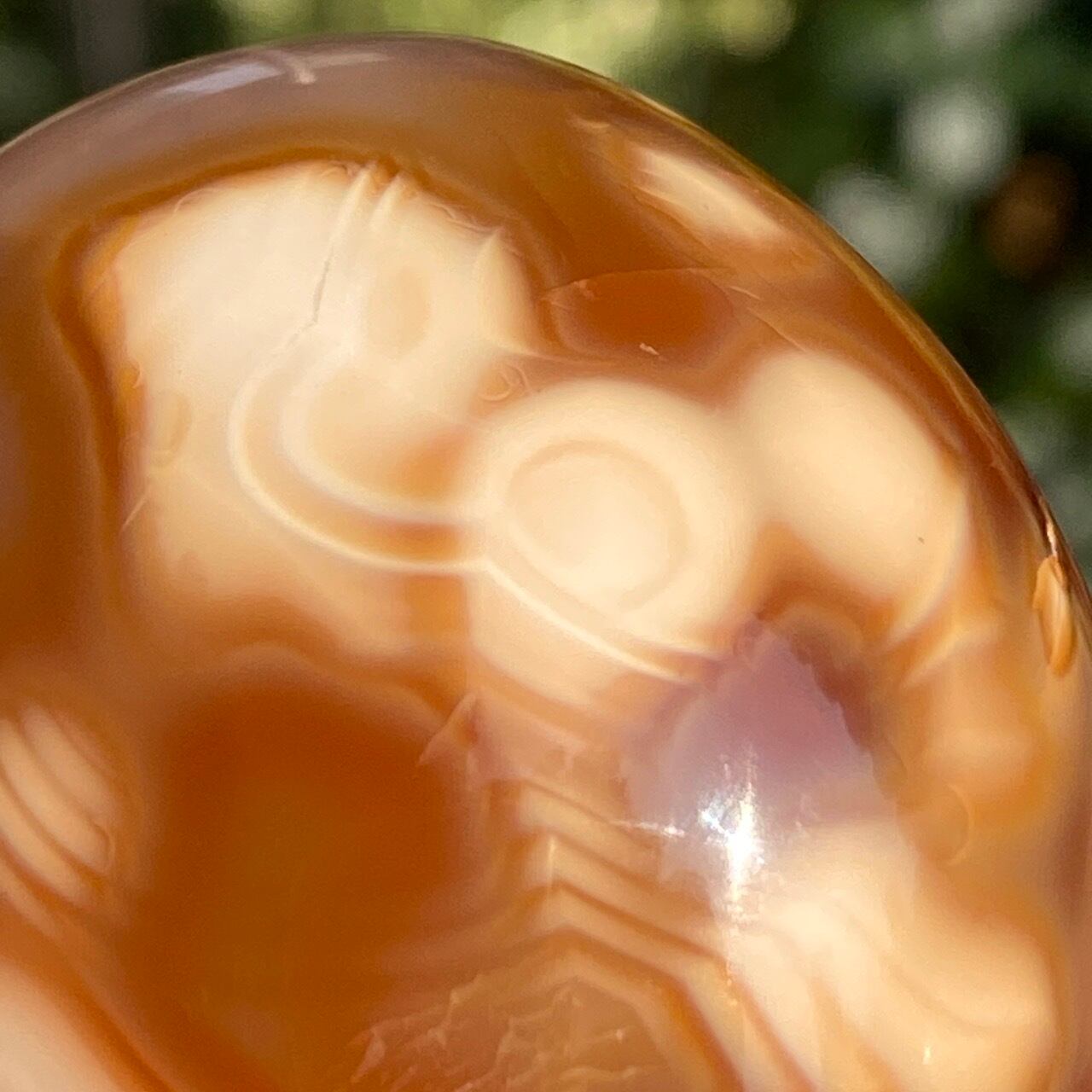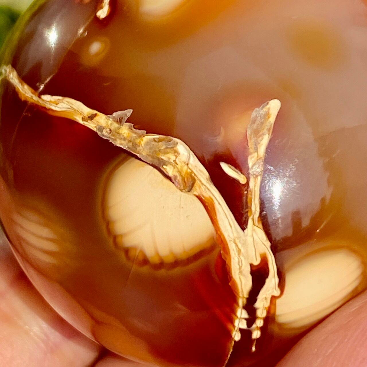 ※カーネリアンやアゲート特有のクラックやキズ、チップ、そして凹みや溝等(この子は特に、片面の枝模様に沿って、深めの凹みやチップが複数箇所有)がございます。