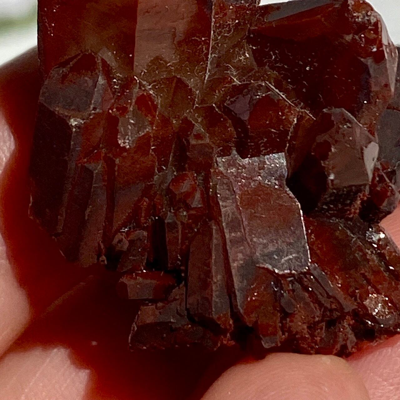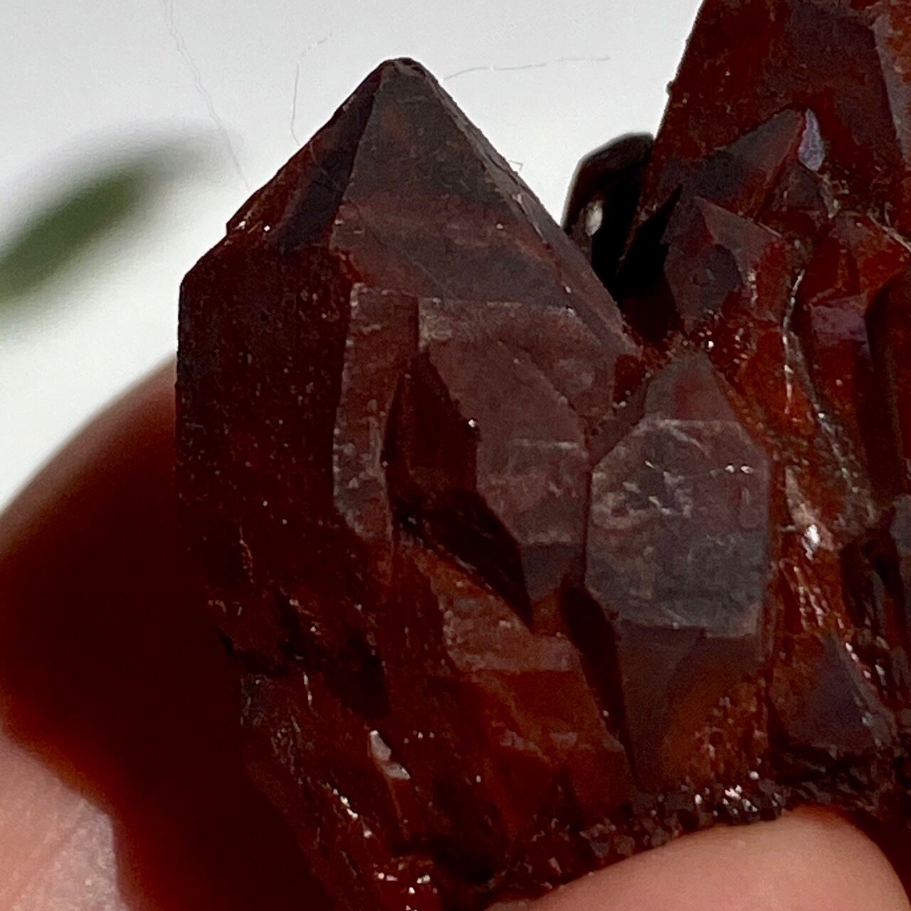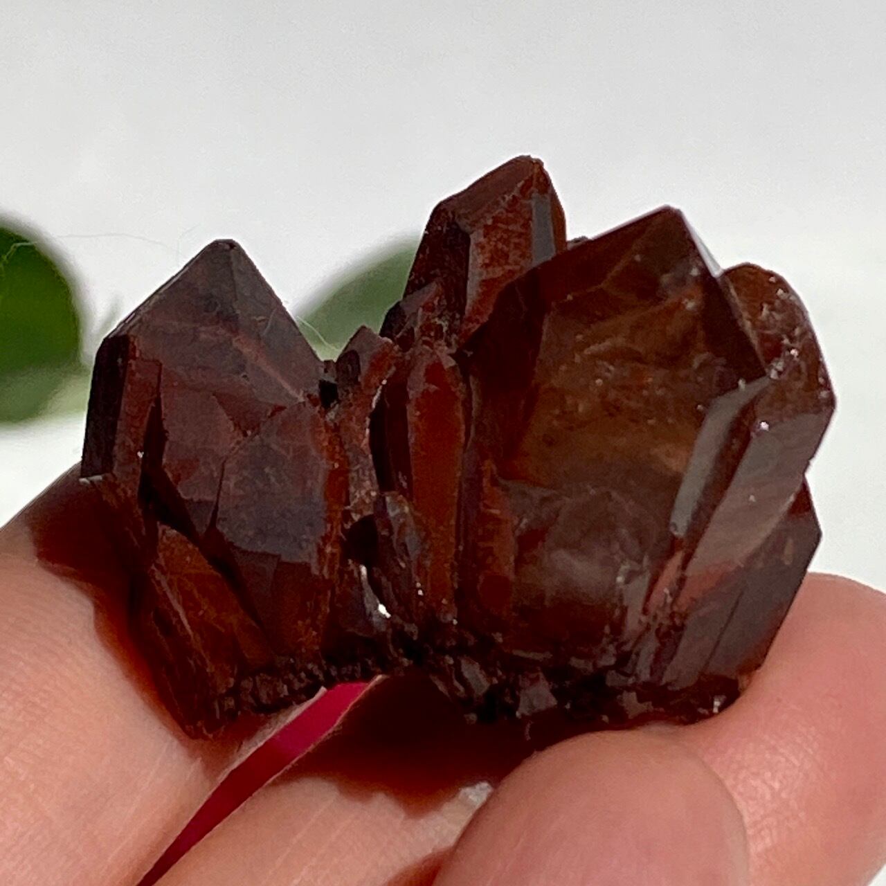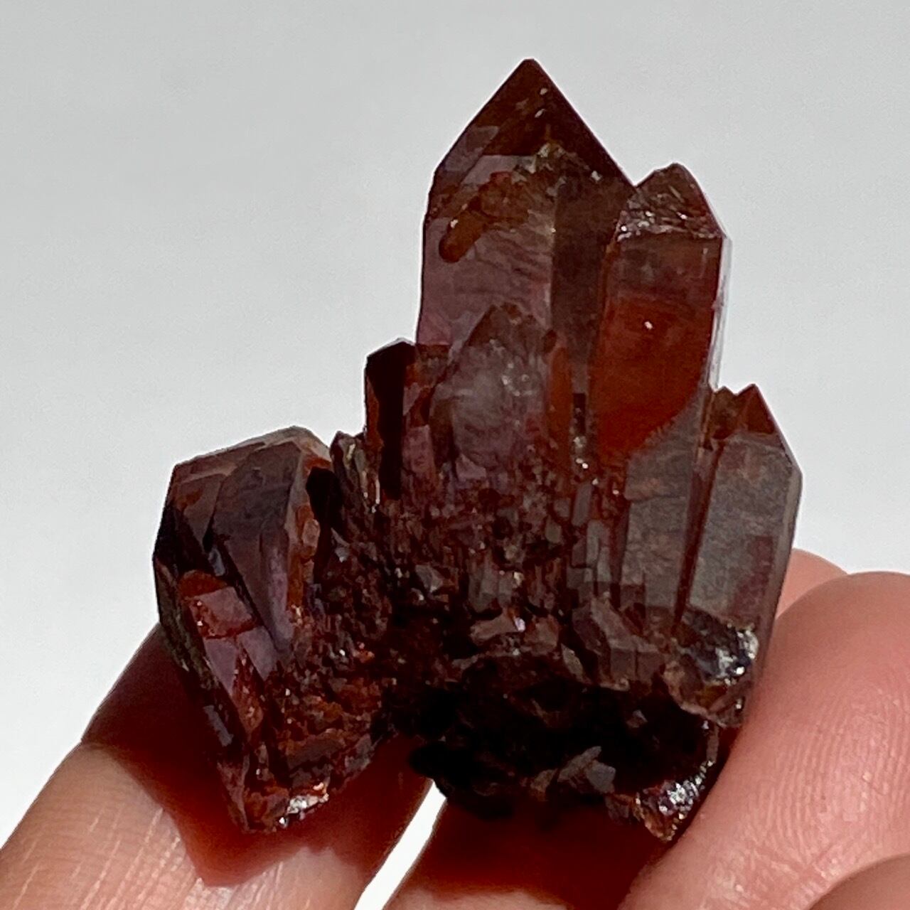 カテドラル風のクリアクォーツのミニクラスターの周りの赤いヘマタイトのコーティングが見事です。スクリーンを通して初めて見た時に、その素晴らしい魅力に心動かされましたが、受け取った時は、その美しさにただただ魅入っていました。チョコレート色と赤土色がミックスされ、ところどころコーティングが無いクォーツ部分も見られます。大きさが標本にも適していると思います。細かいポイントが両剣になっていて、下からみるとごつごつしていて可愛いです。