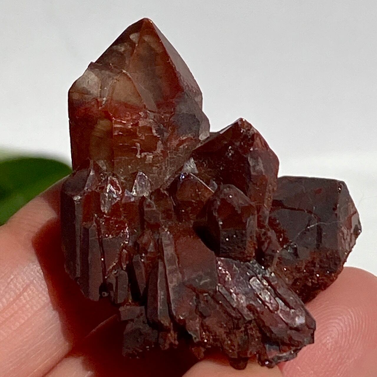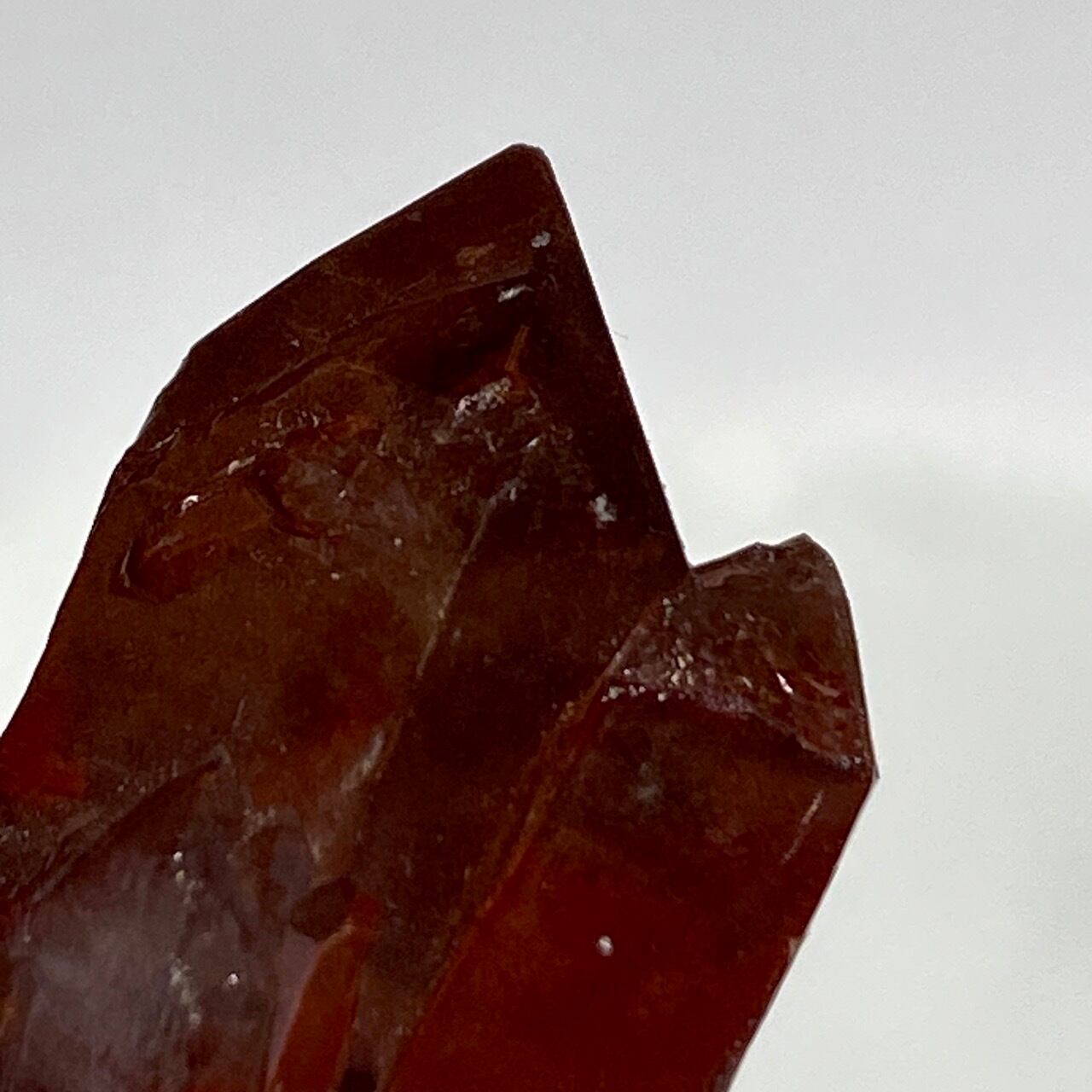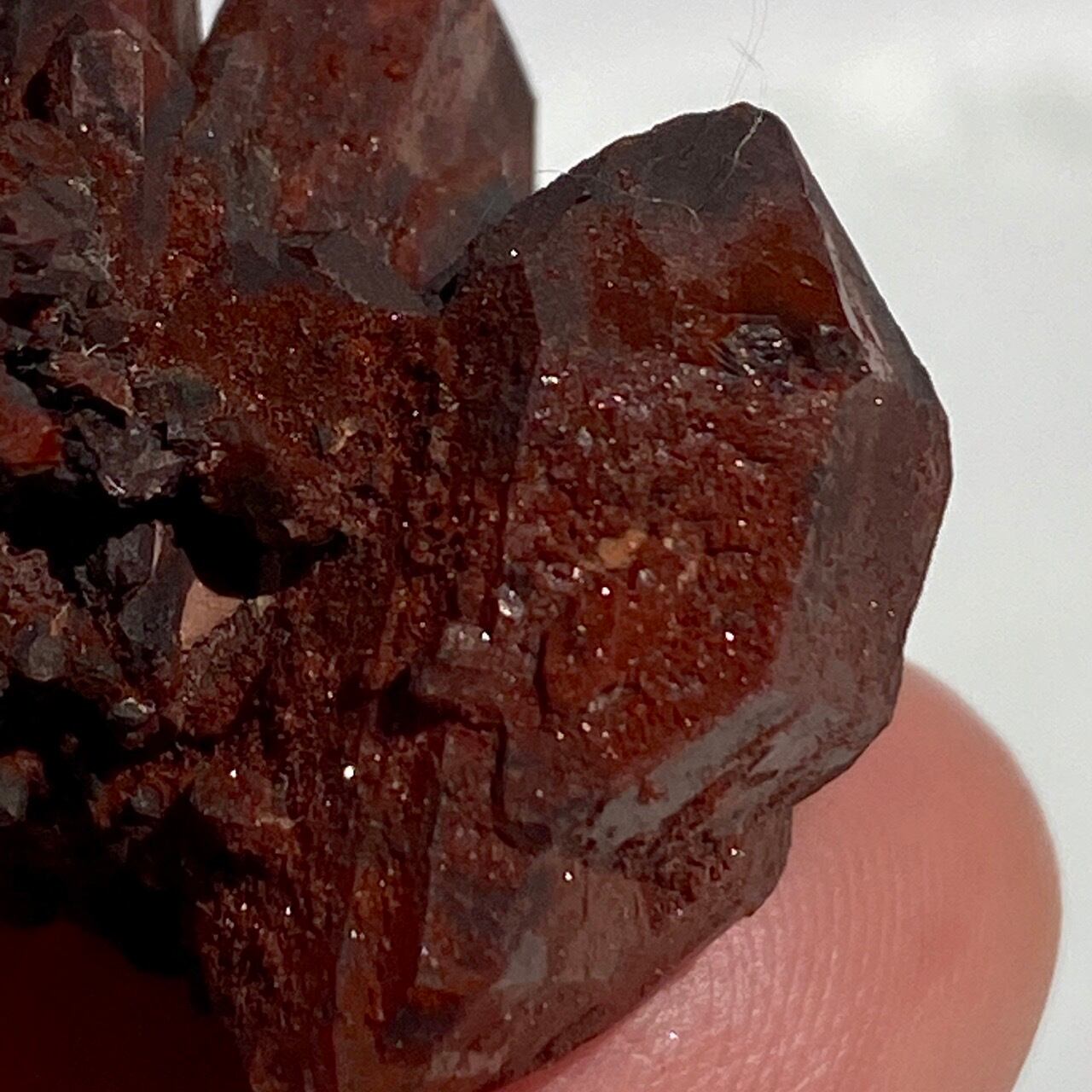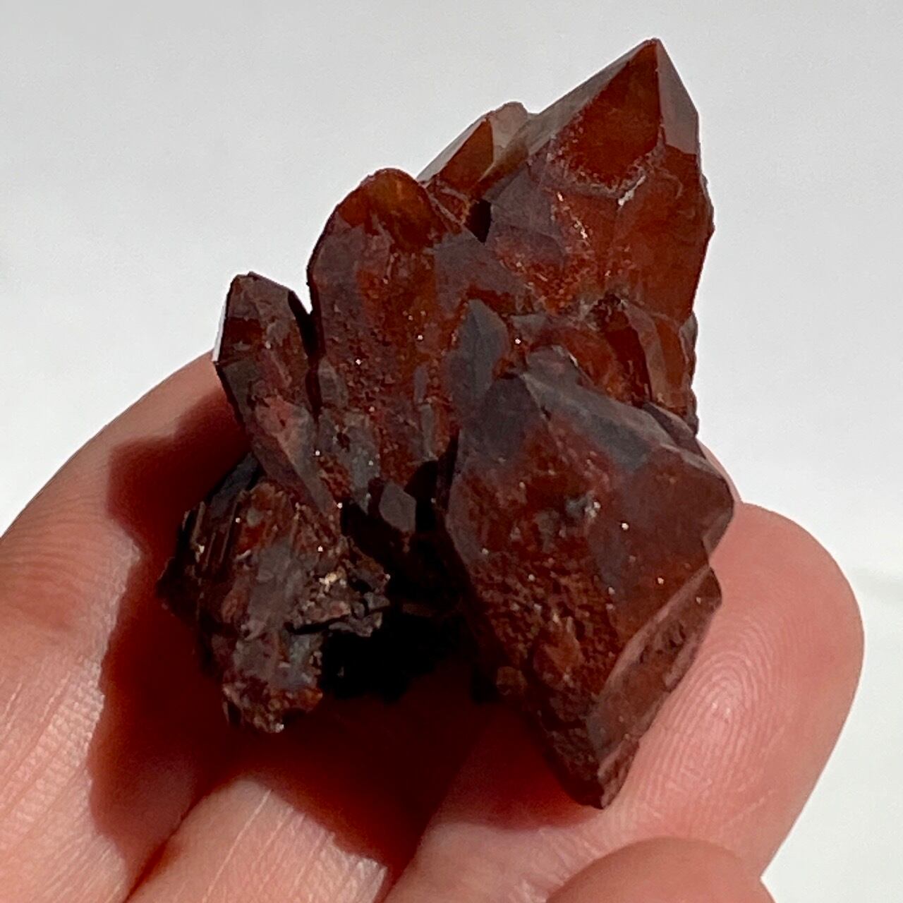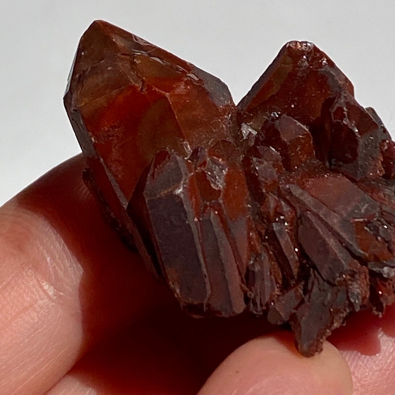 カテドラル風のクリアクォーツのミニクラスターの周りの赤いヘマタイトのコーティングが見事です。スクリーンを通して初めて見た時に、その素晴らしい魅力に心動かされましたが、受け取った時は、その美しさにただただ魅入っていました。チョコレート色と赤土色がミックスされ、ところどころコーティングが無いクォーツ部分も見られます。大きさが標本にも適していると思います。細かいポイントが両剣になっていて、下からみるとごつごつしていて可愛いです。