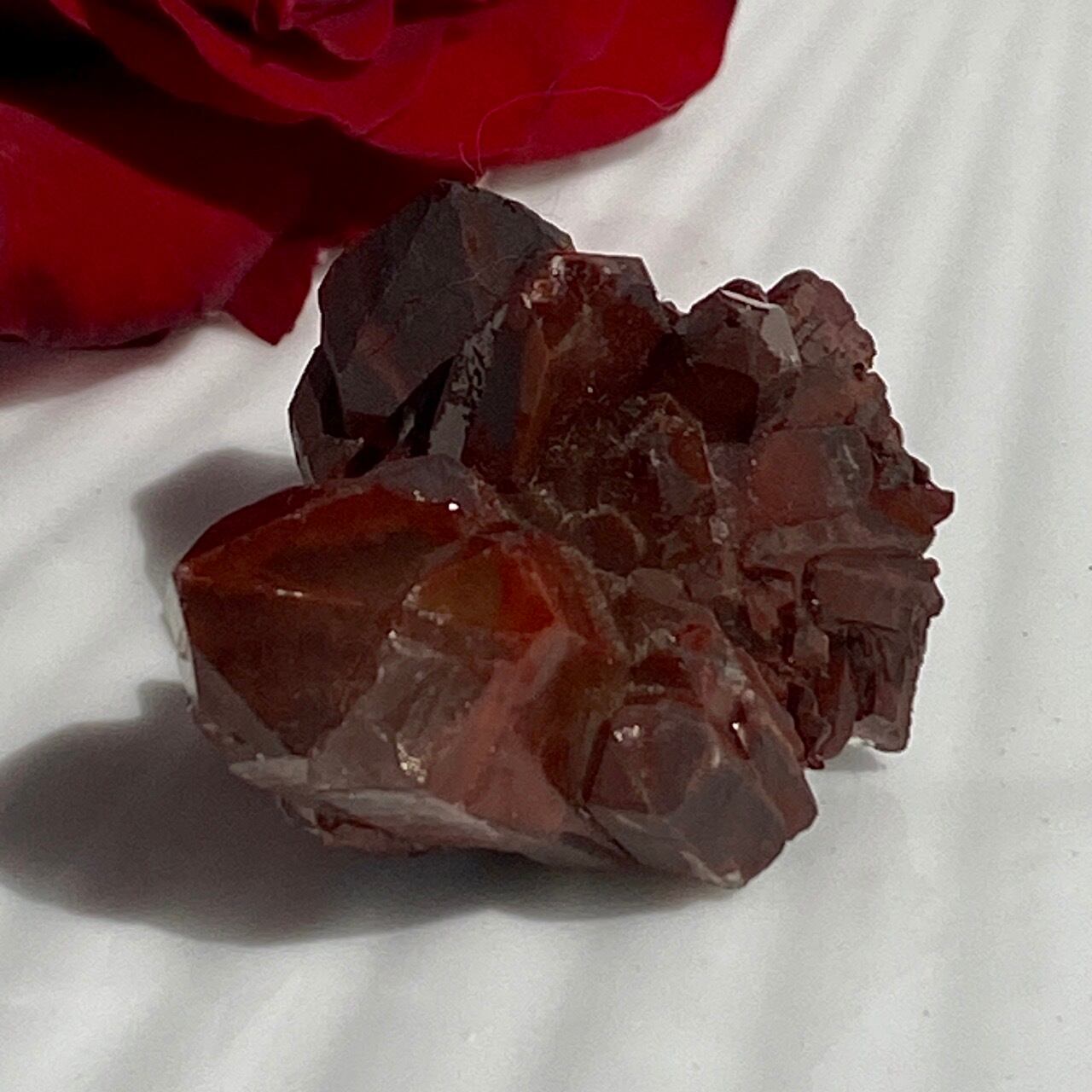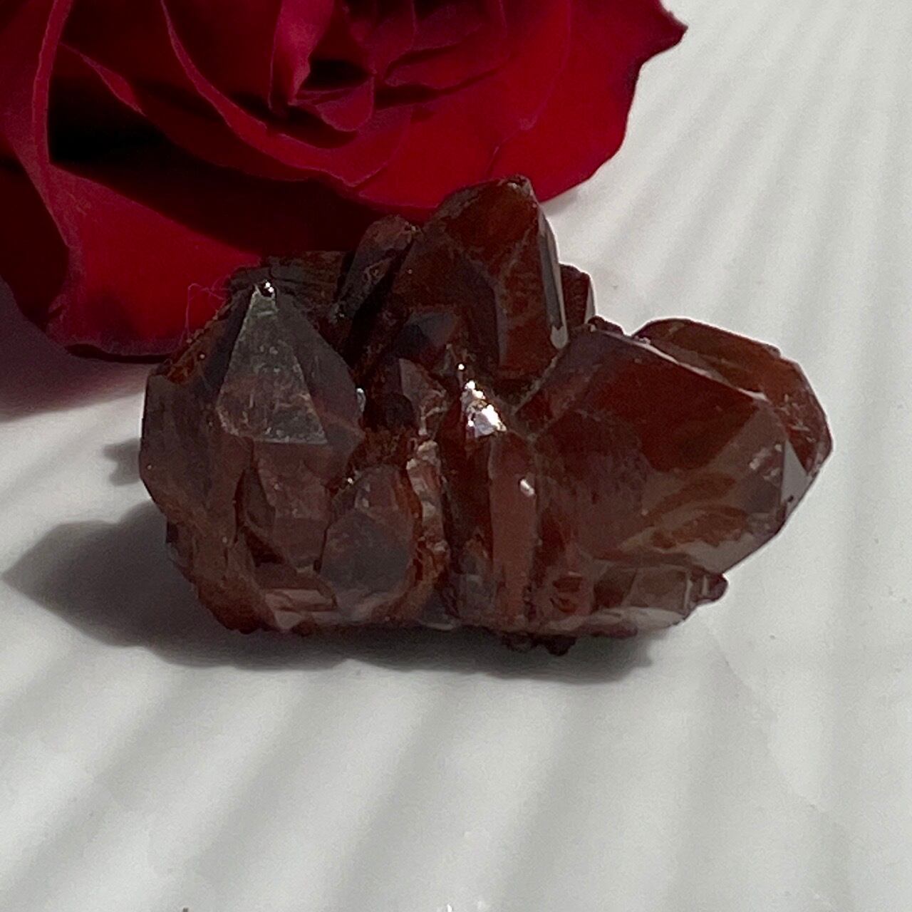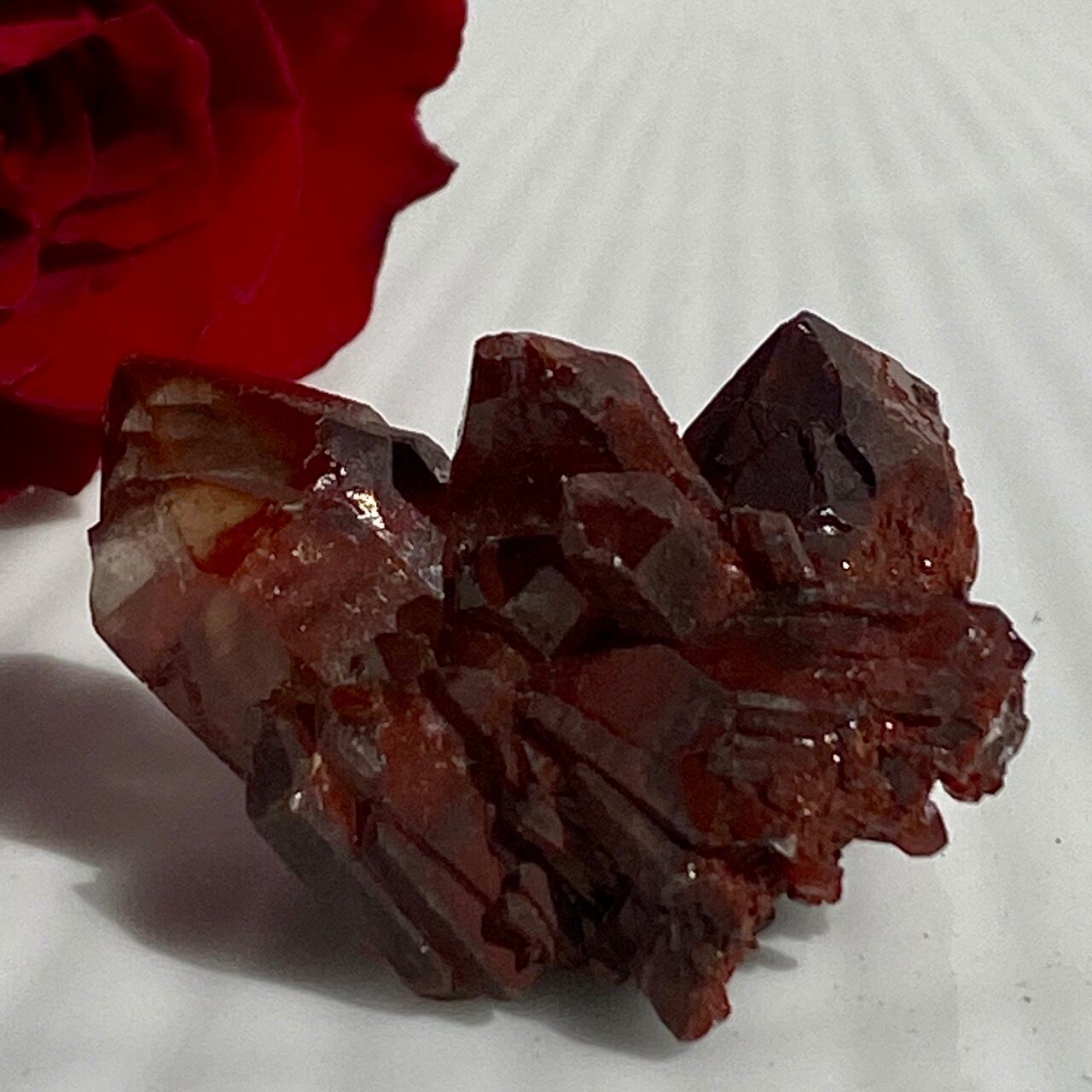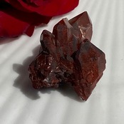 2014年にモロッコで発見されたレア系のレッドヘマタイトでコーティングされたクォーツクラスターです。外側に細かいポイントで覆われたものは、龍のうろこに似ている事から、レッドドラゴンクォーツと呼ばれています。