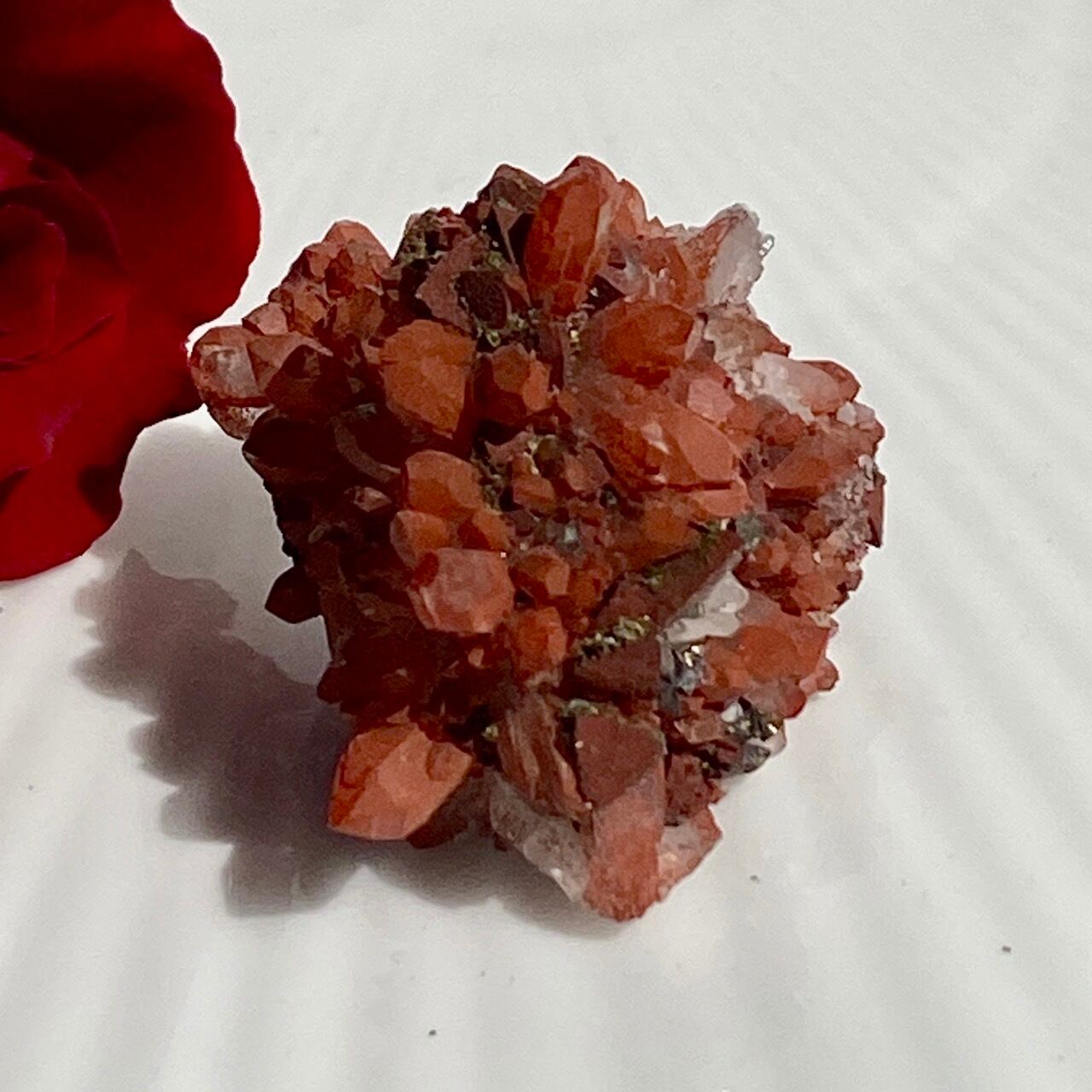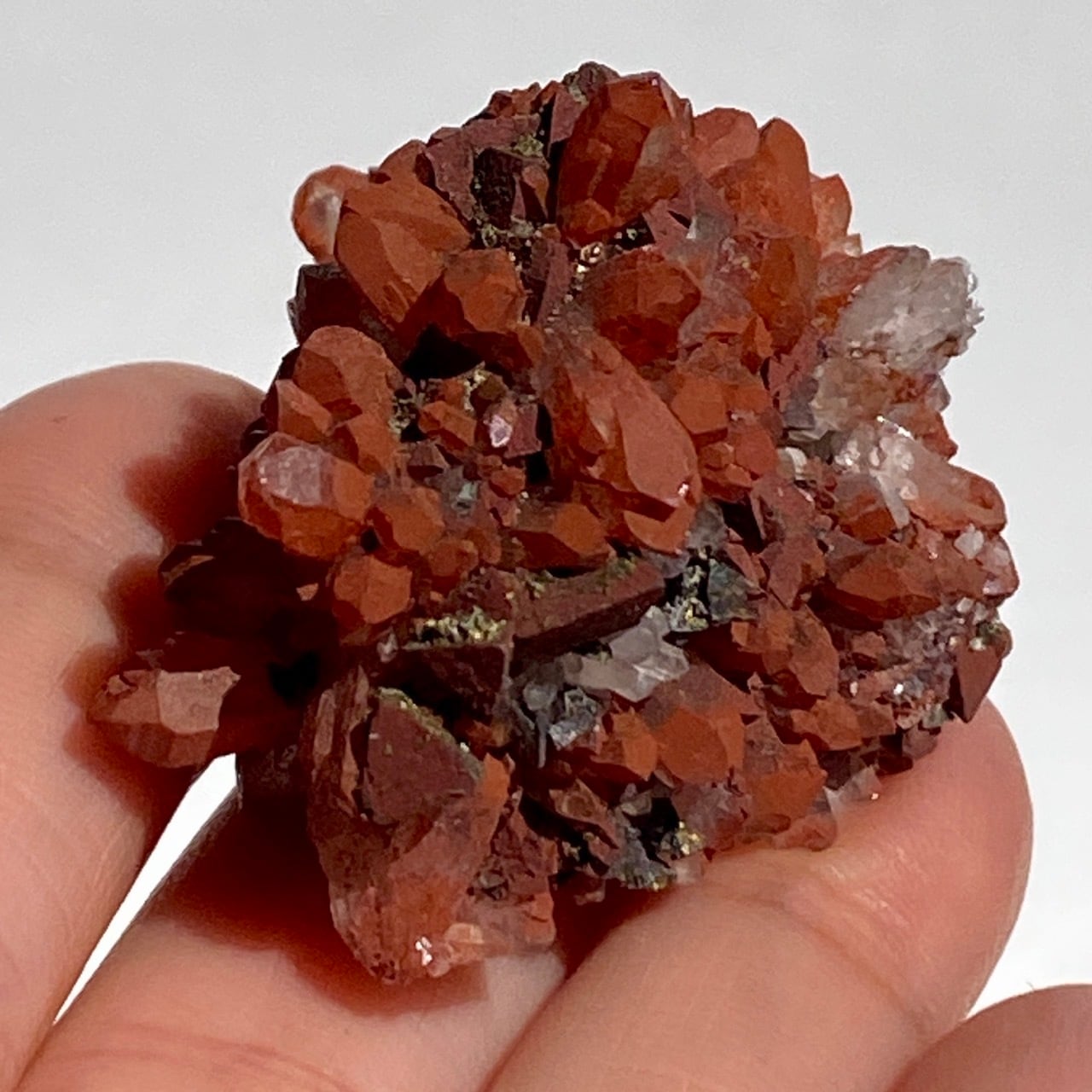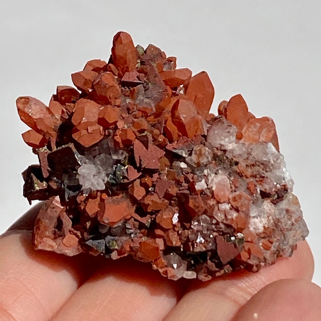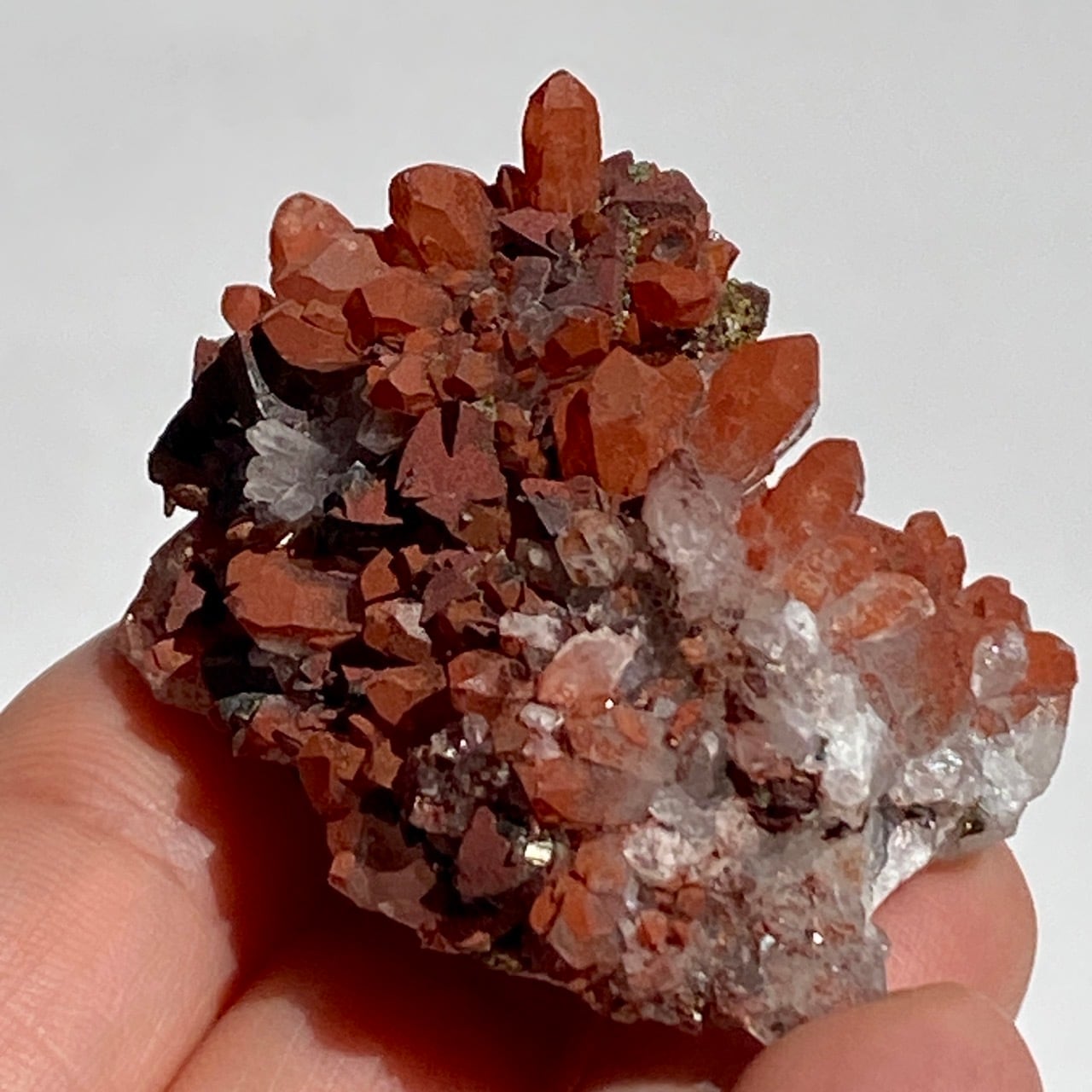 細かいポイントの周りに赤鉄鉱(ヘマタイト)のコーティングがされている可愛いミニクラスターです。ところどころ黄鉄鉱(パイライト)も付着しています。