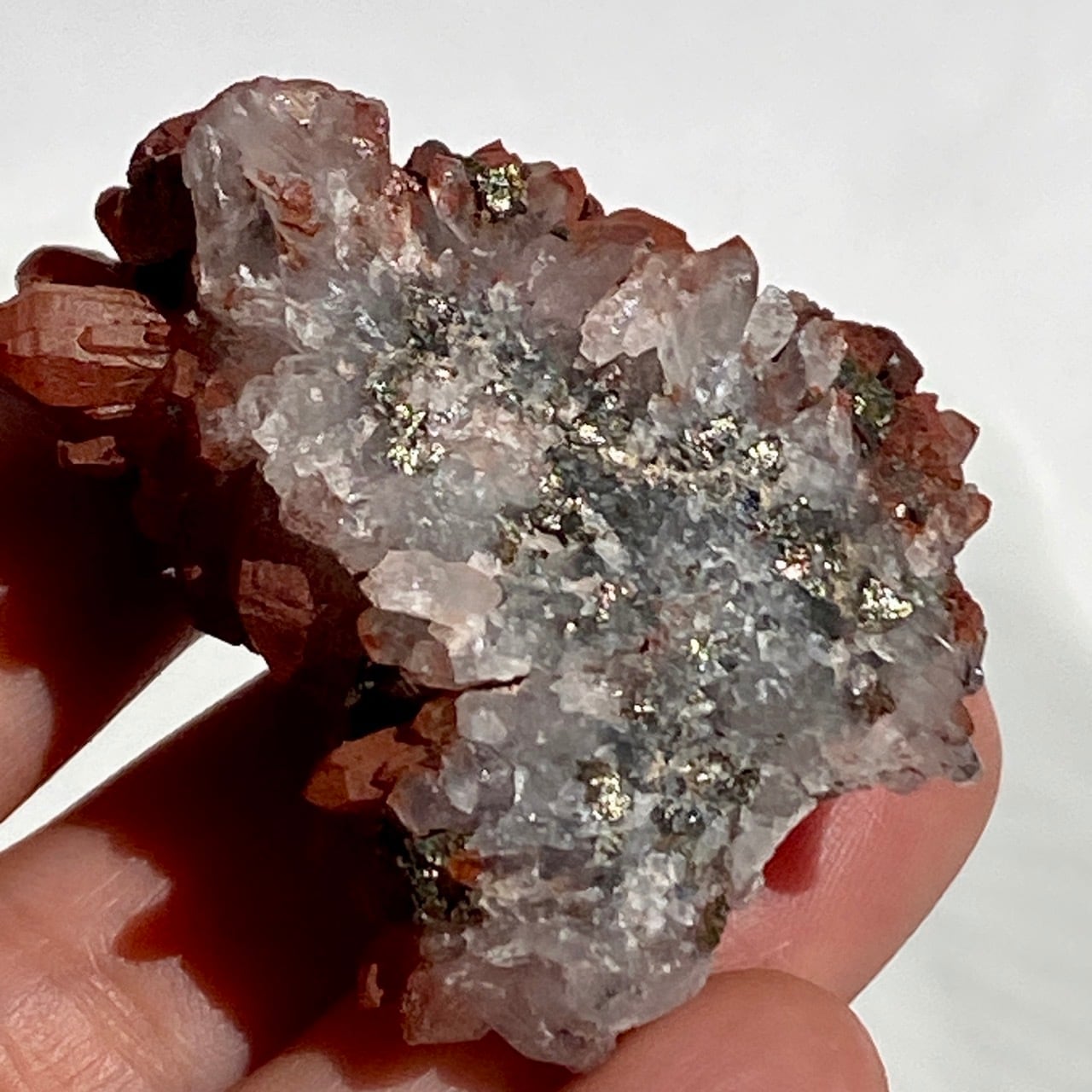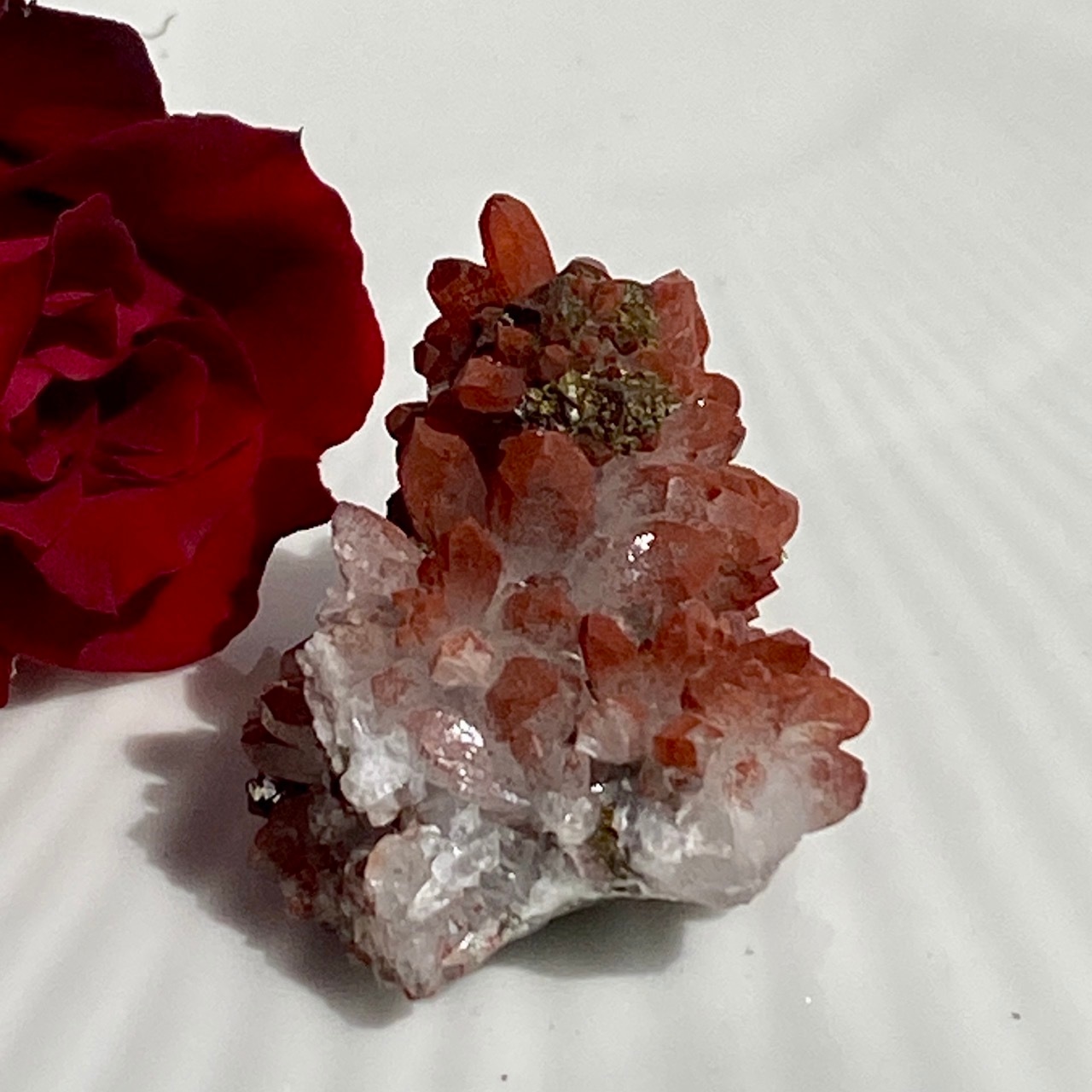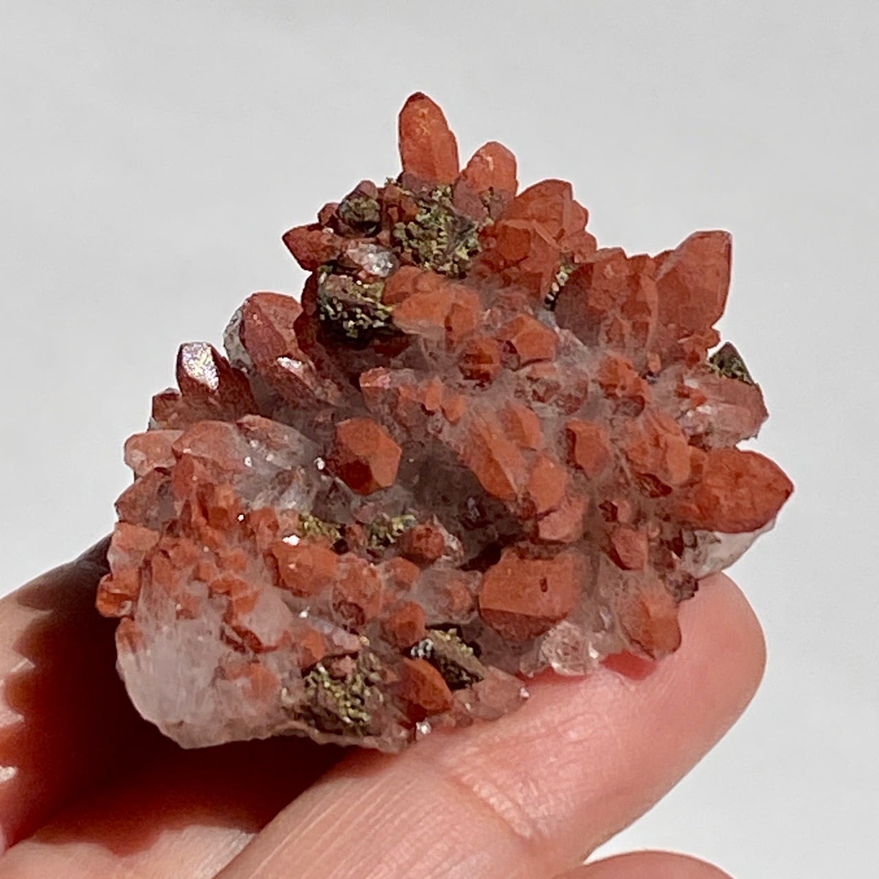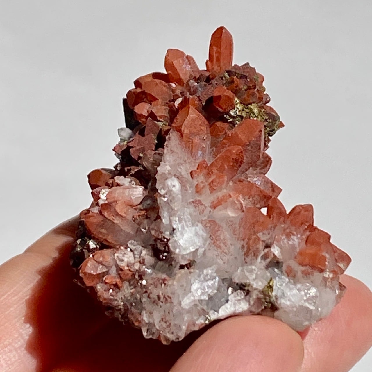細かいポイントの周りに赤鉄鉱(ヘマタイト)のコーティングがされている可愛いミニクラスターです。ところどころ黄鉄鉱(パイライト)も付着しています。
