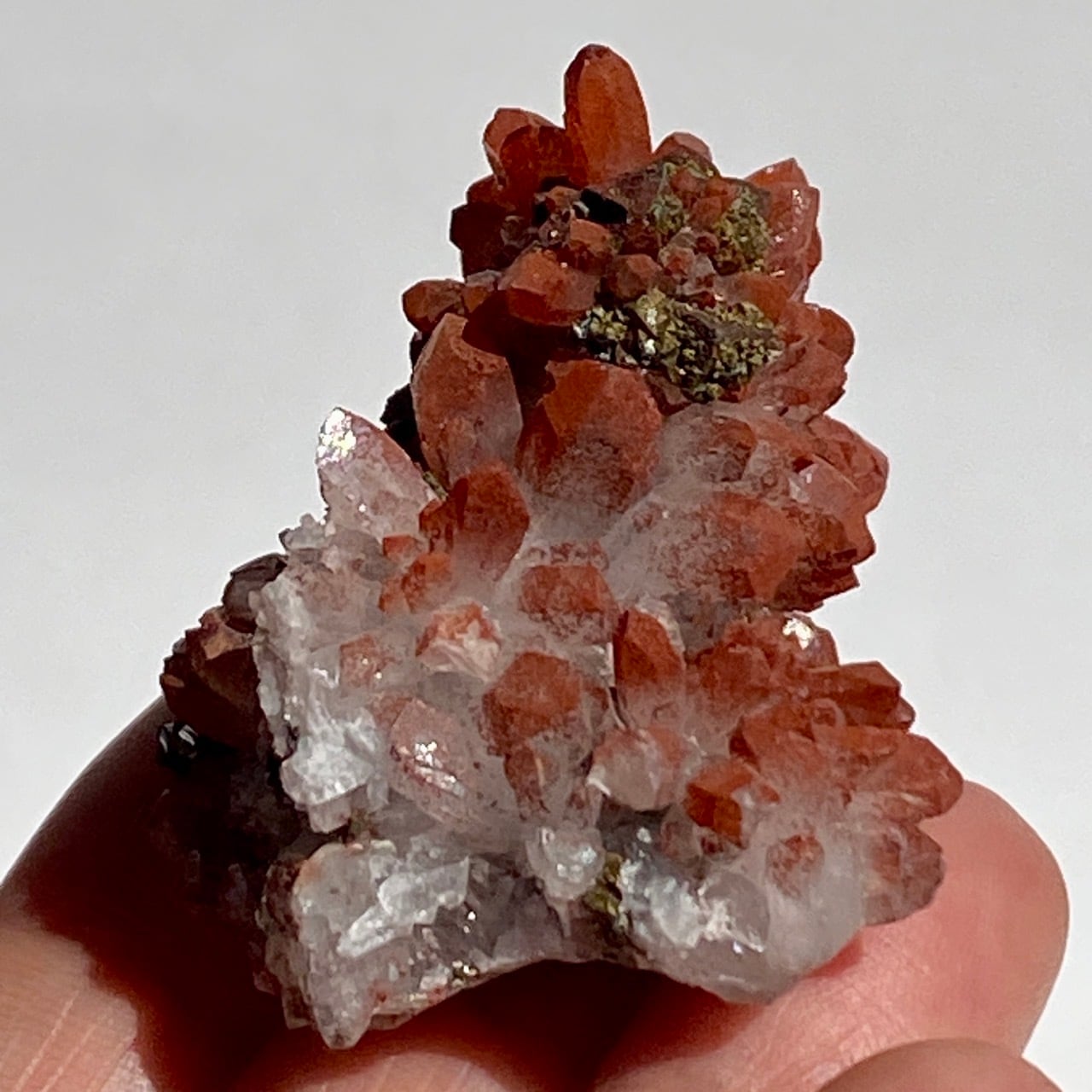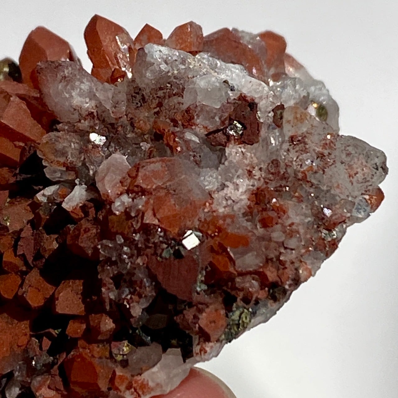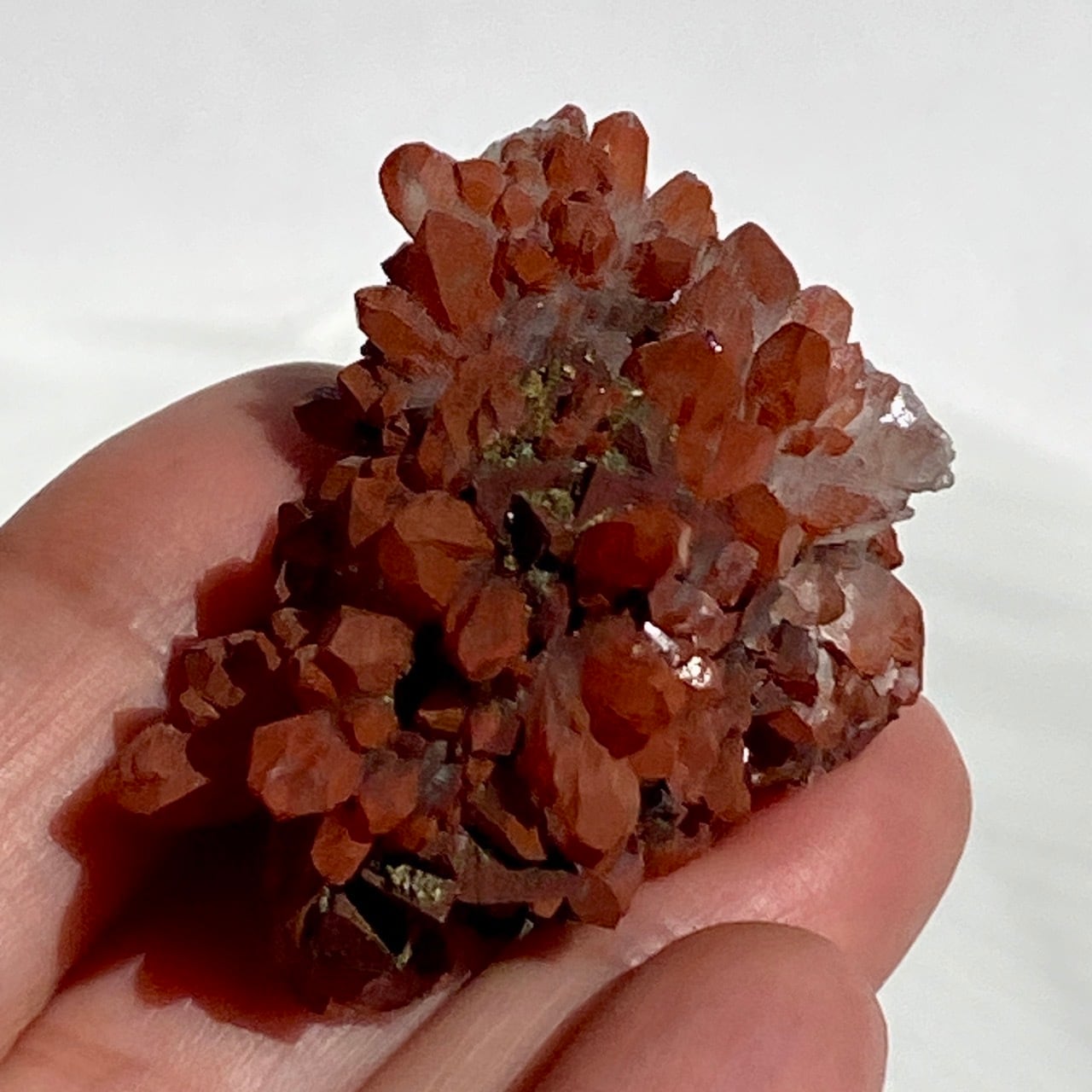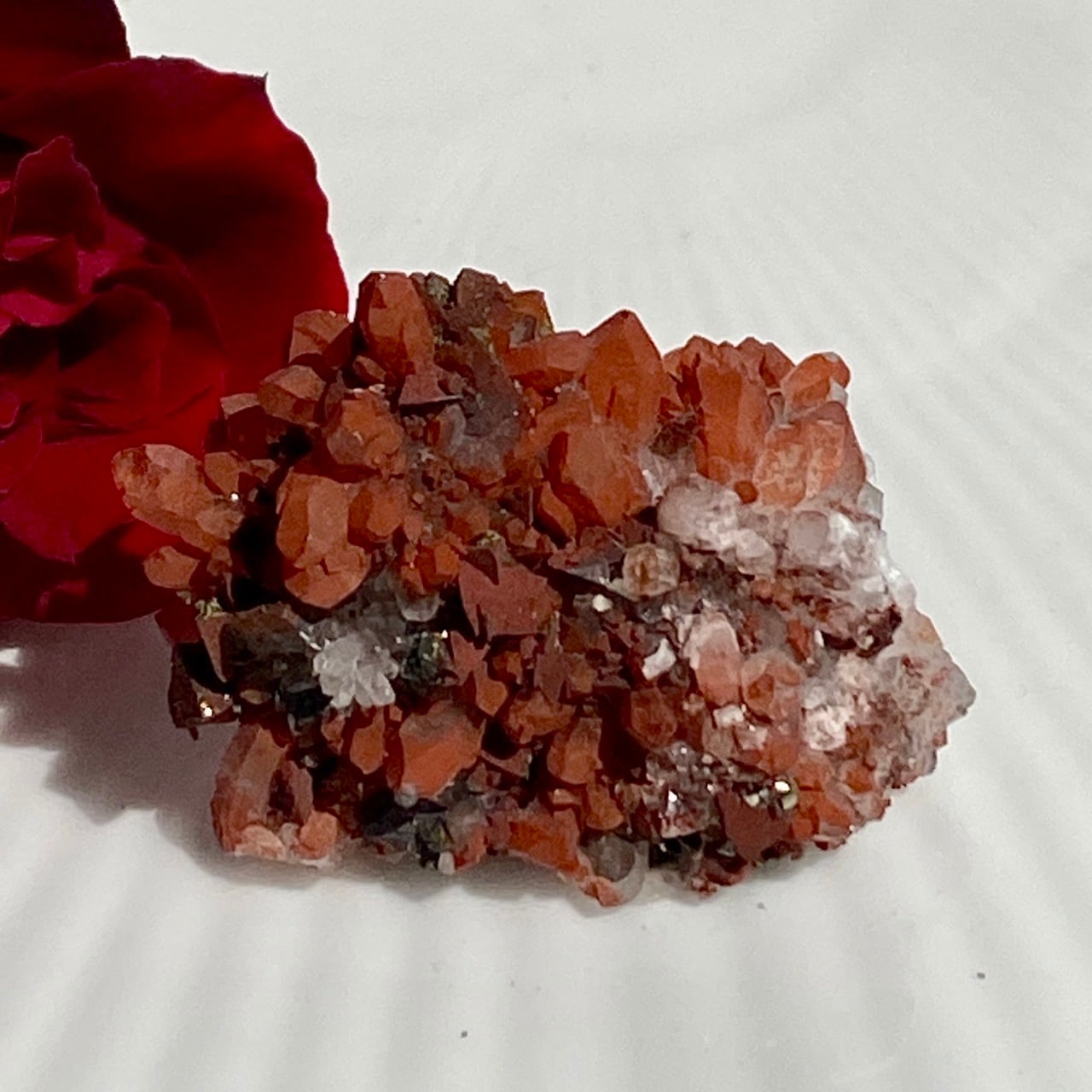 細かいポイントの周りに赤鉄鉱(ヘマタイト)のコーティングがされている可愛いミニクラスターです。ところどころ黄鉄鉱(パイライト)も付着しています。