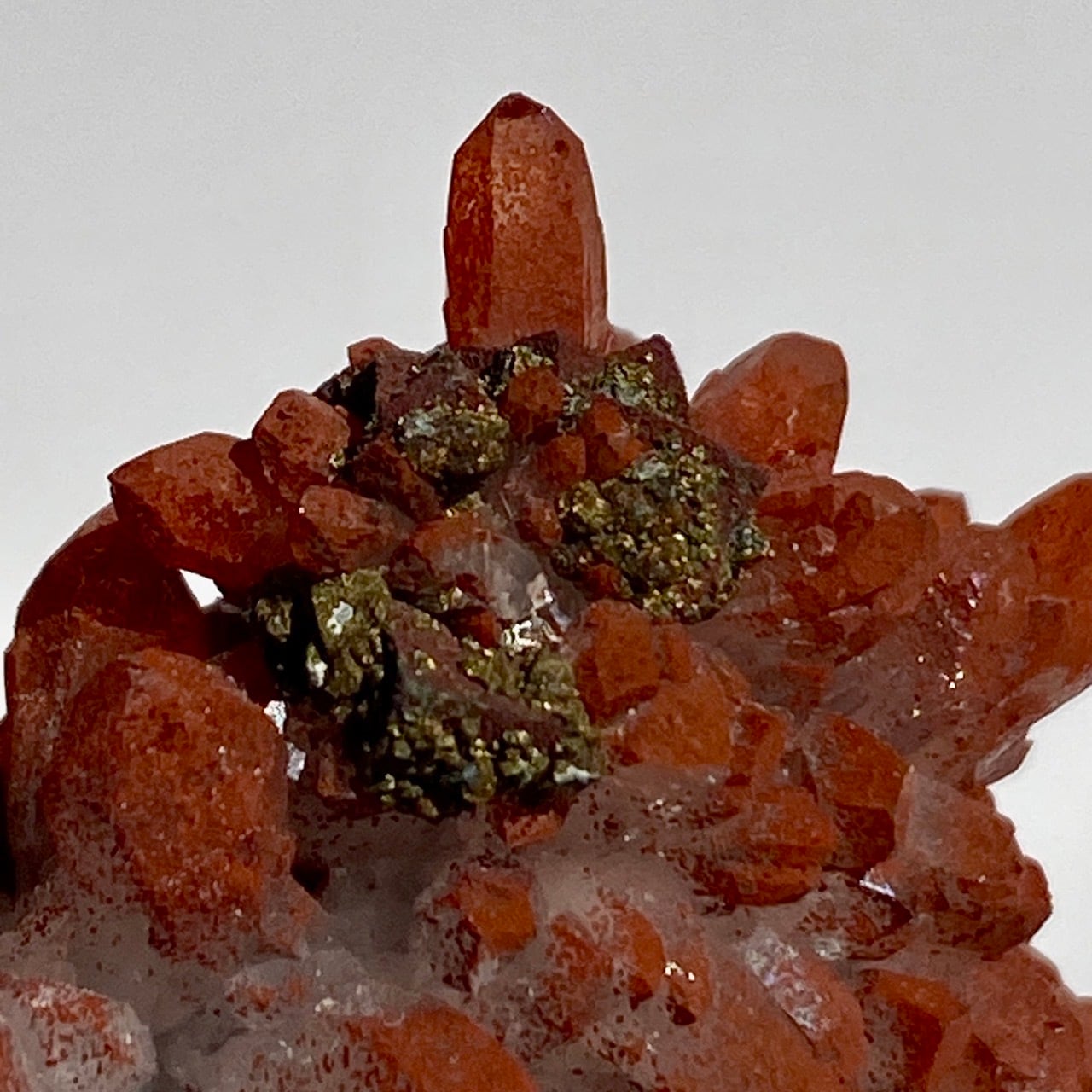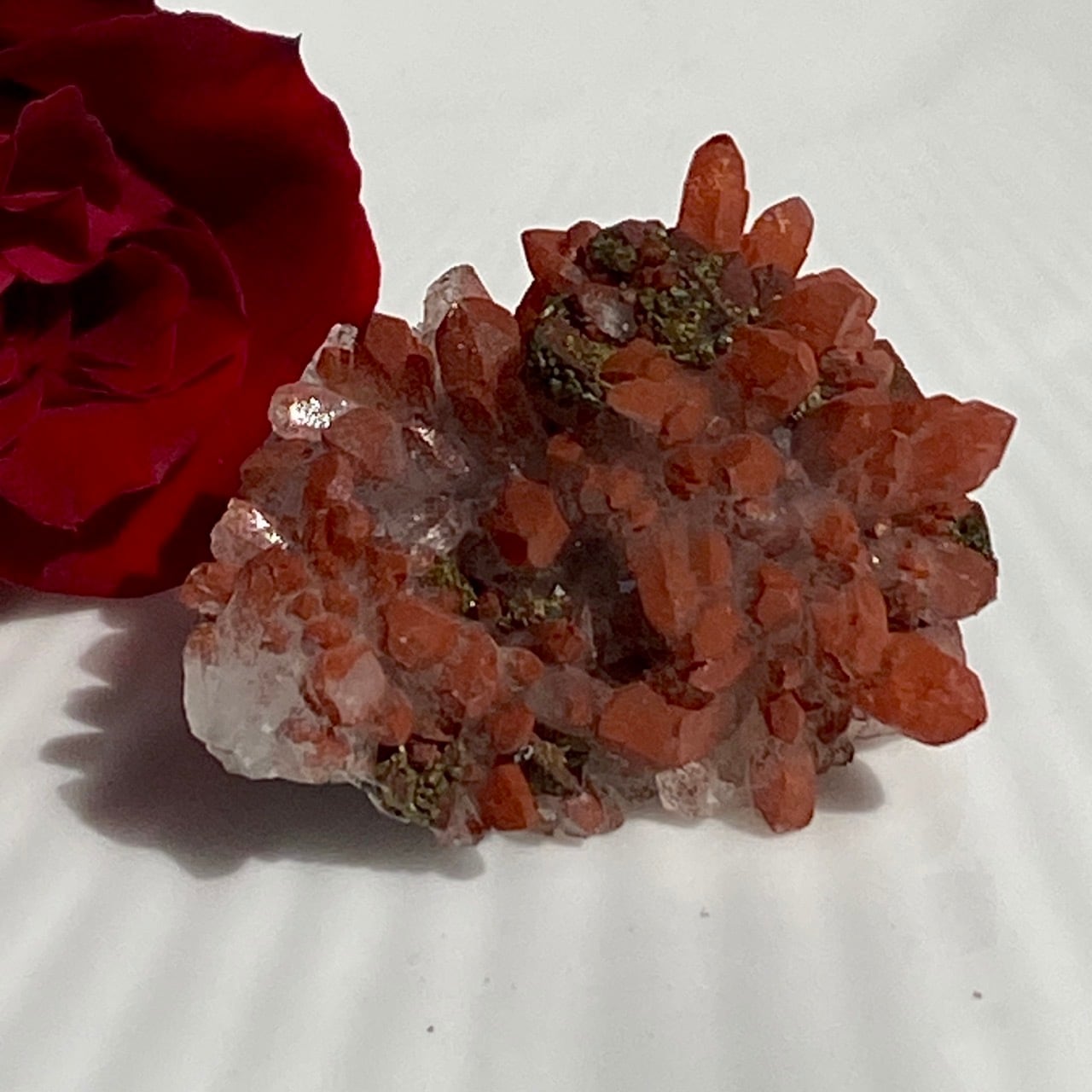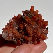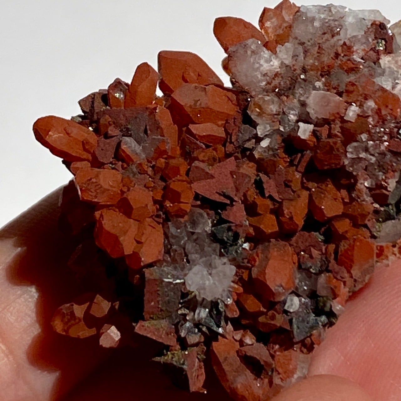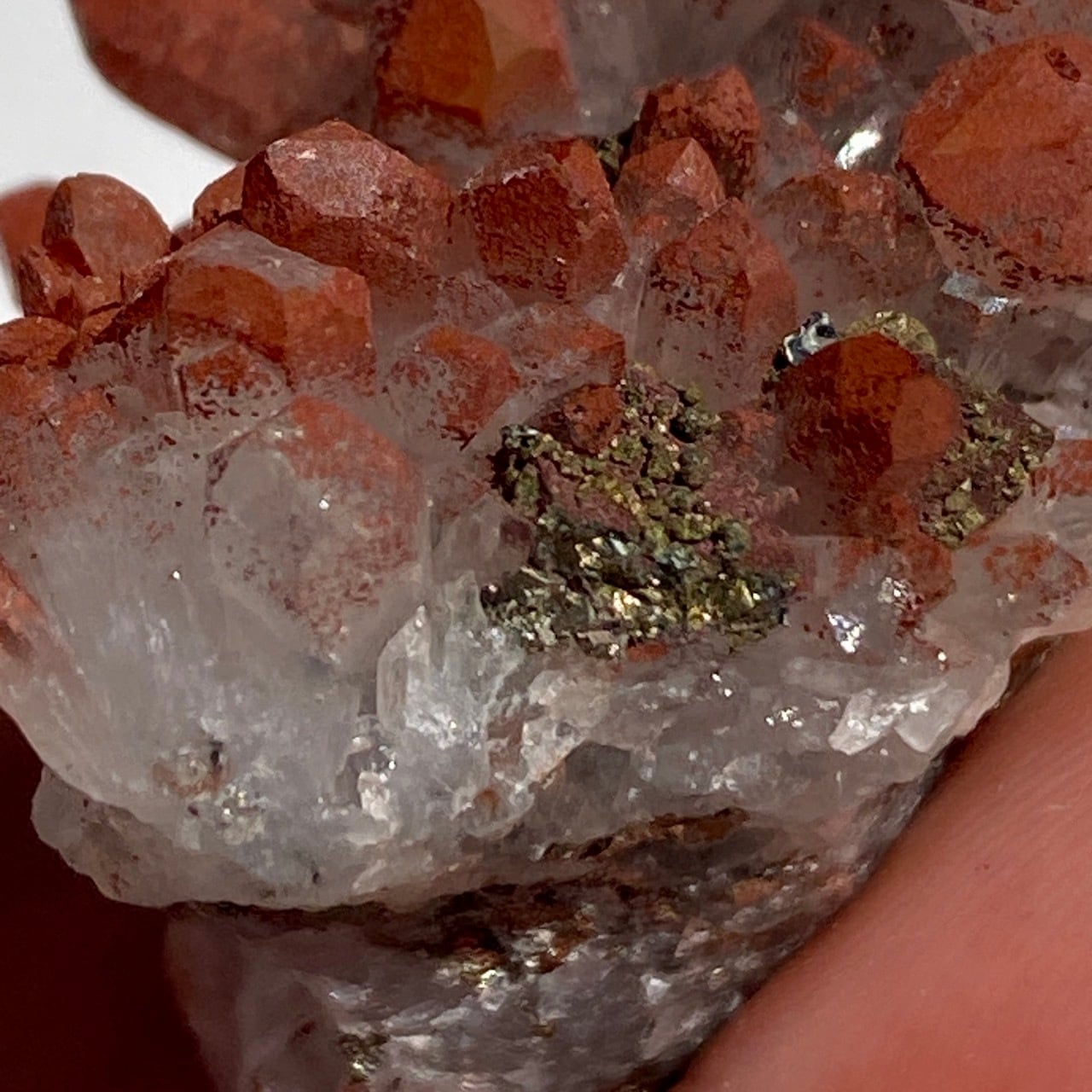 細かいポイントの周りに赤鉄鉱(ヘマタイト)のコーティングがされている可愛いミニクラスターです。ところどころ黄鉄鉱(パイライト)も付着しています。