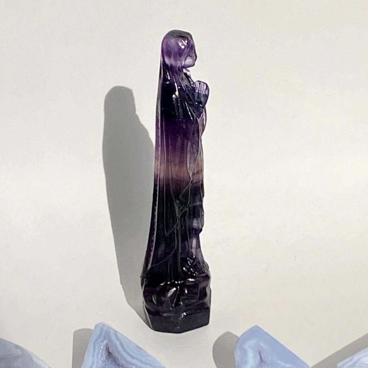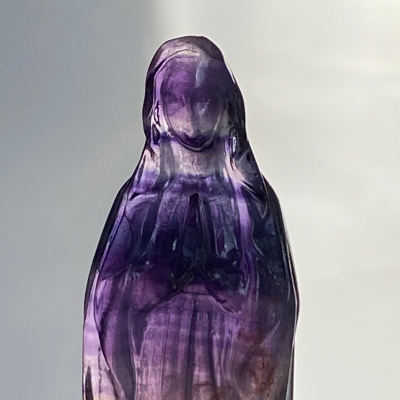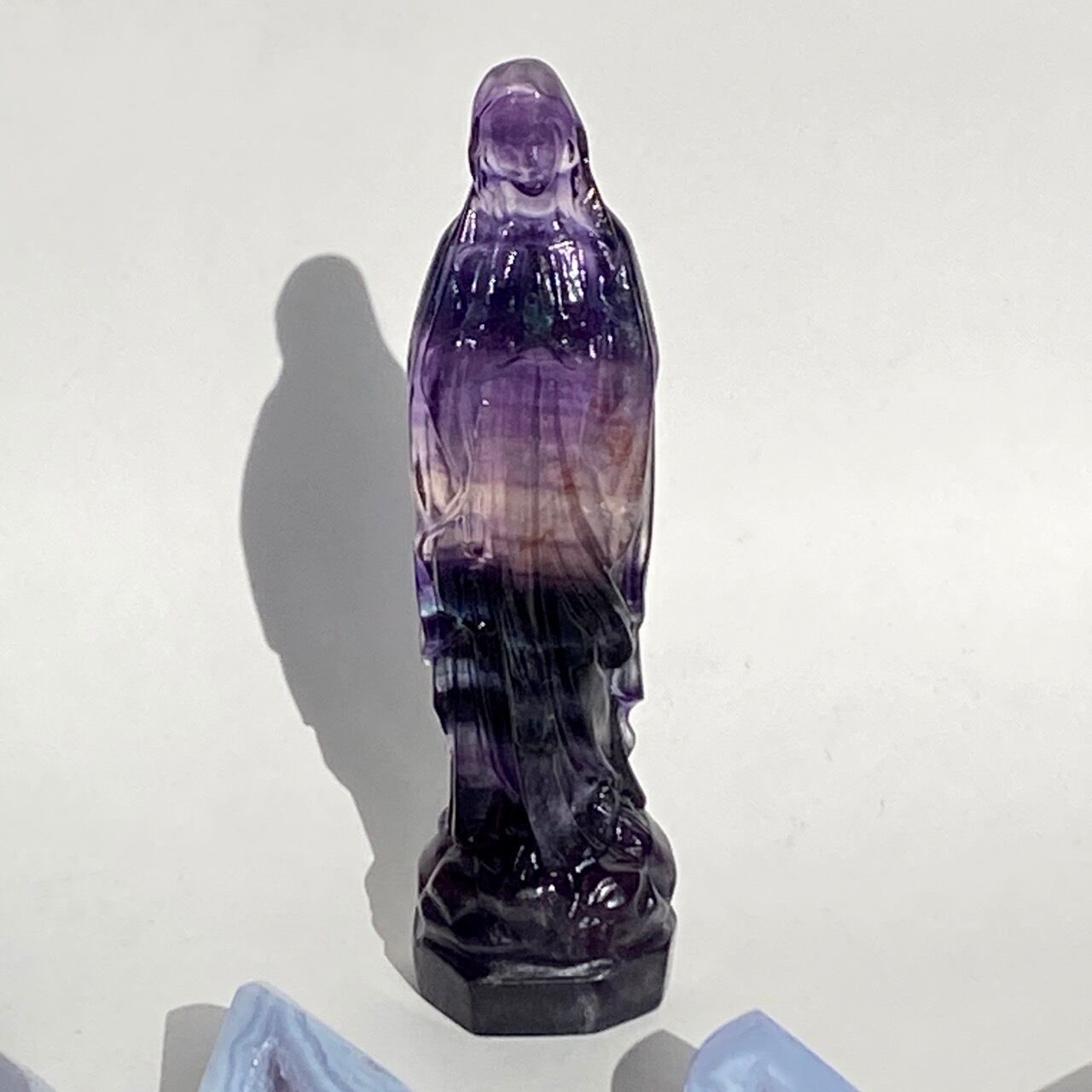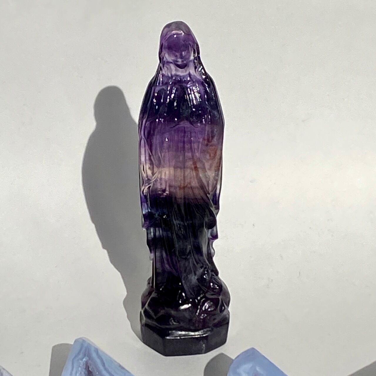 店主はアセンデッドマスター・聖母マリアの大大大ファンで、自分の心の身近な存在ゆえマリア様グッズには目が無く、販売中のローズクォーツの他に、今回フローライトのマリア様をお迎えしました。