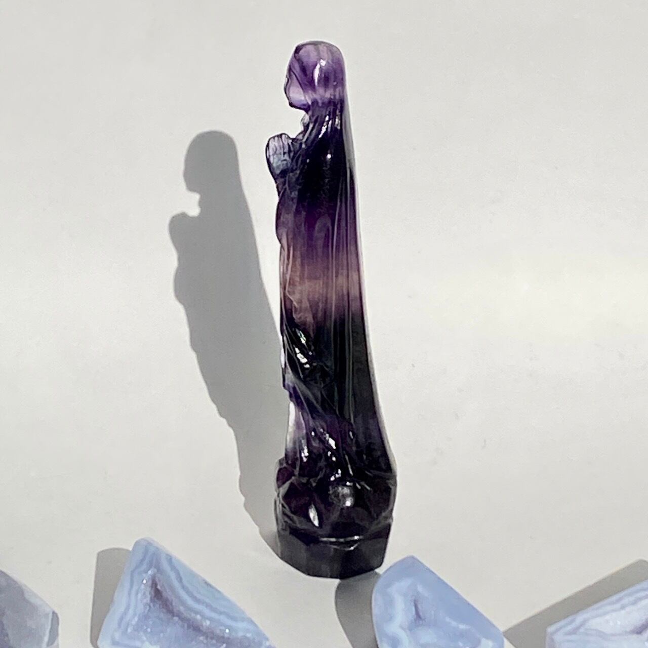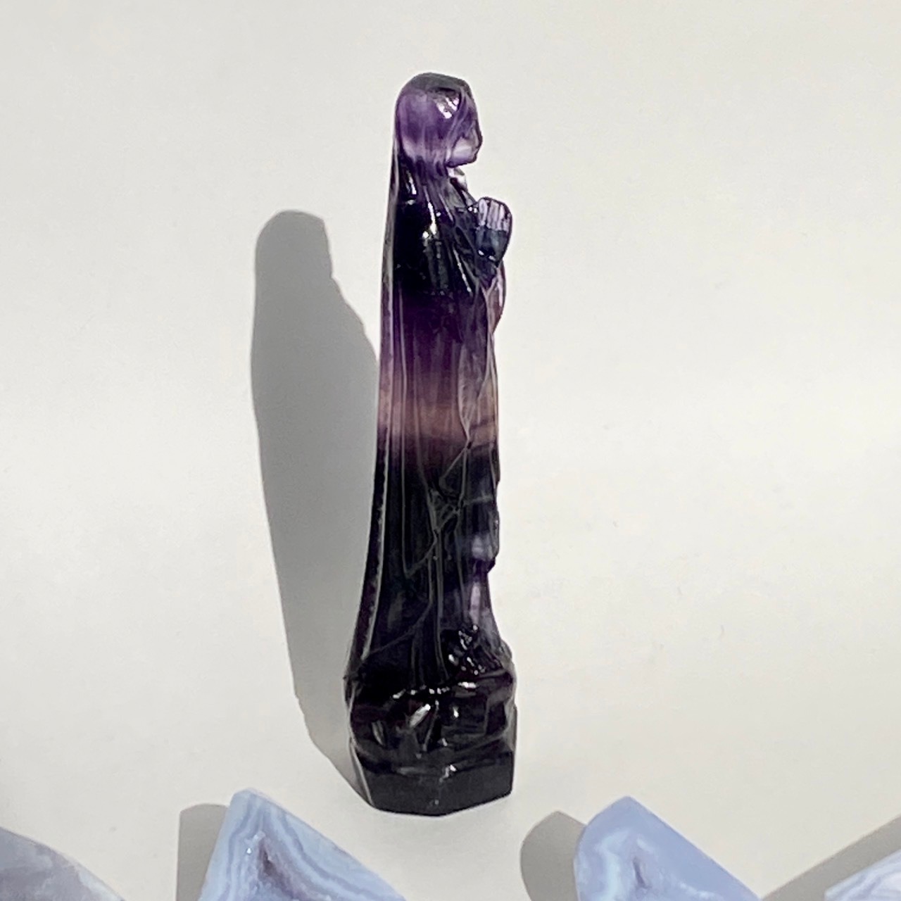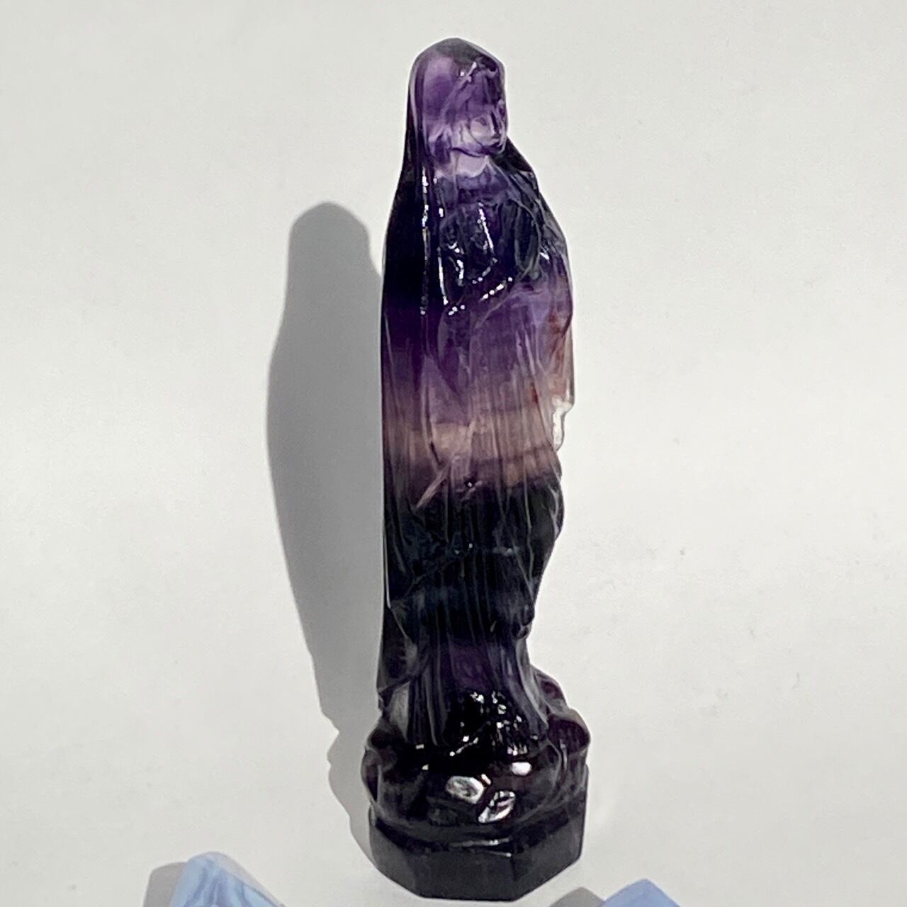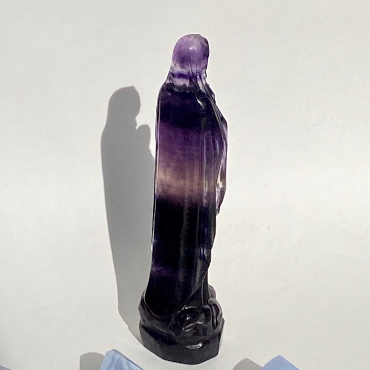 店主はアセンデッドマスター・聖母マリアの大大大ファンで、自分の心の身近な存在ゆえマリア様グッズには目が無く、販売中のローズクォーツの他に、今回フローライトのマリア様をお迎えしました。