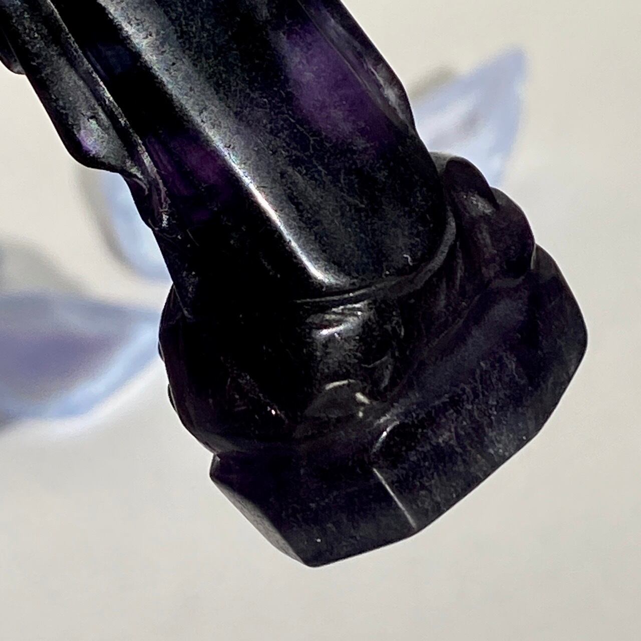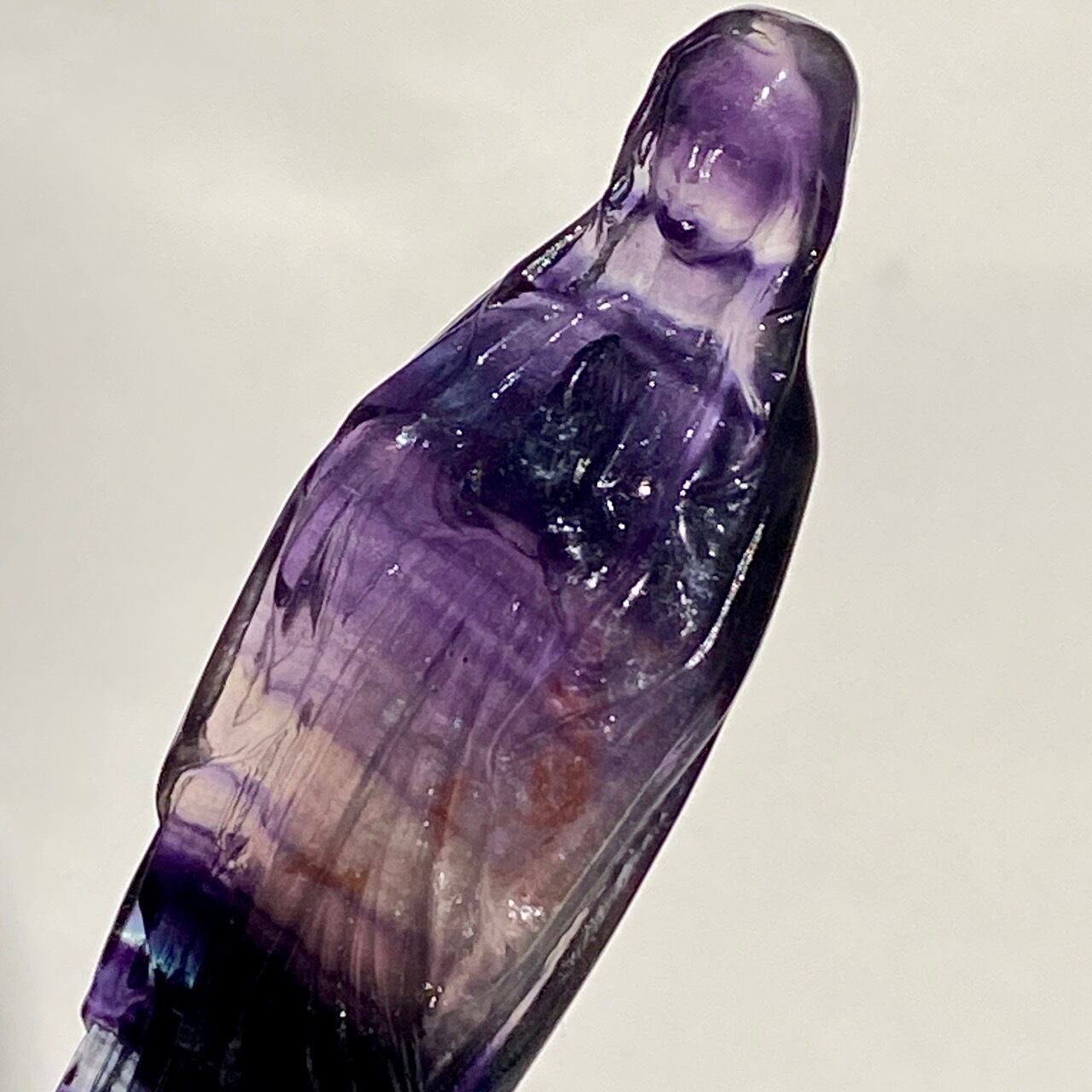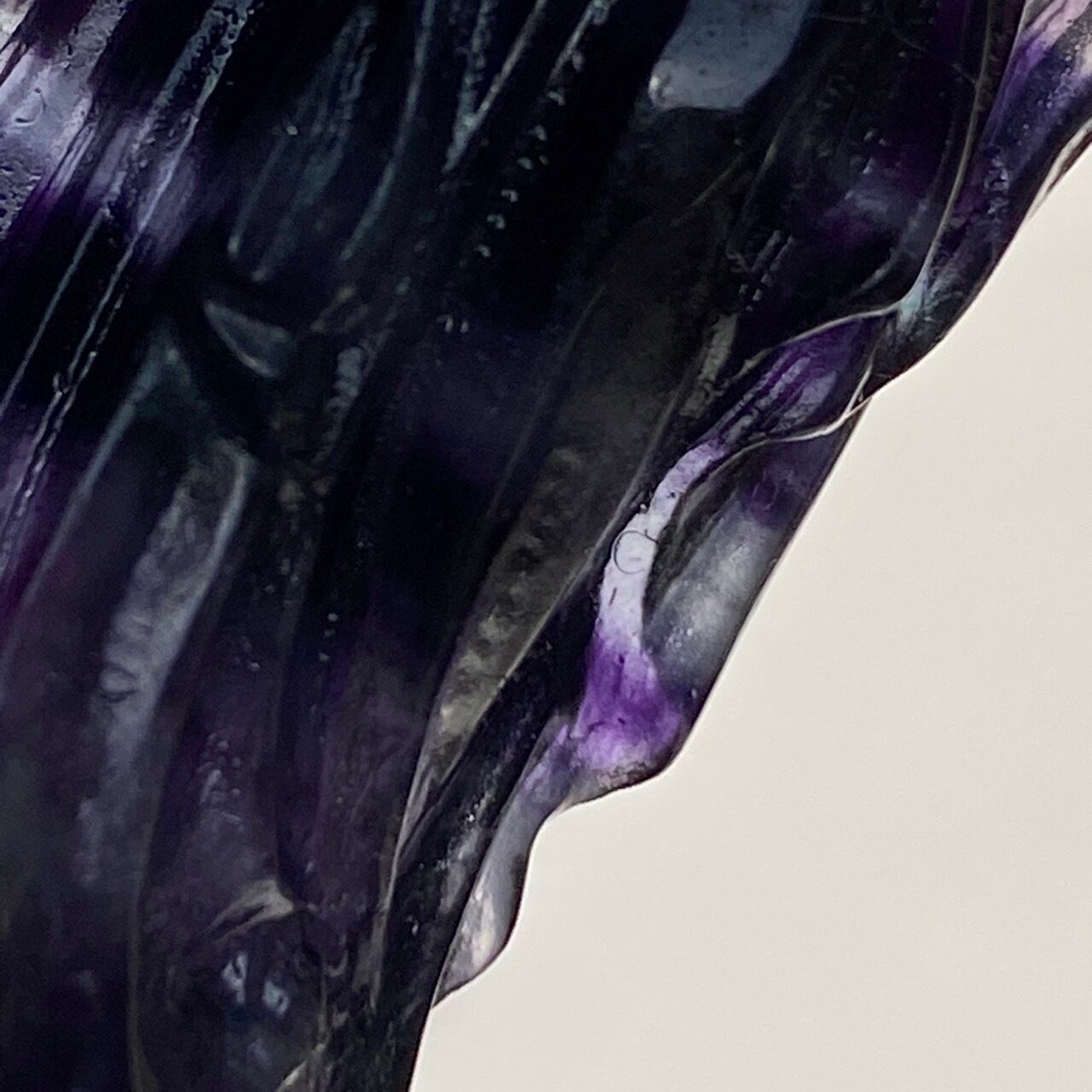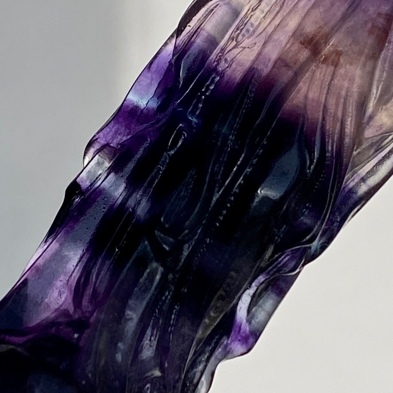 光に透かすと、紫の濃淡、鮮やかなブルー、透明な(もしくは少し白っぽい)部分から成る、美しいカラーコンビネーションが確認できます。そして左袖(正面向かって右)の裾から胴体中央にかけて赤っぽいインクルージョンが見られます。レインボーフローライトは通常、室内で見ると色が濃いですが、光に当てるとステンドグラスの様に鮮やかな色が浮かび上がります。