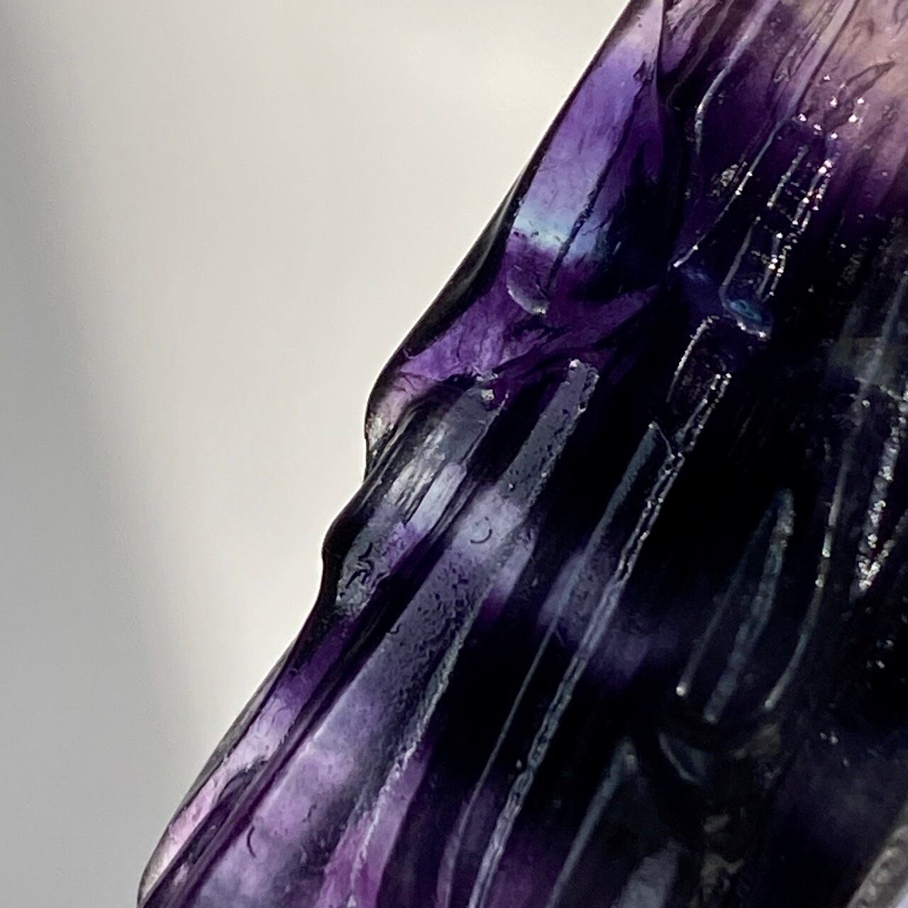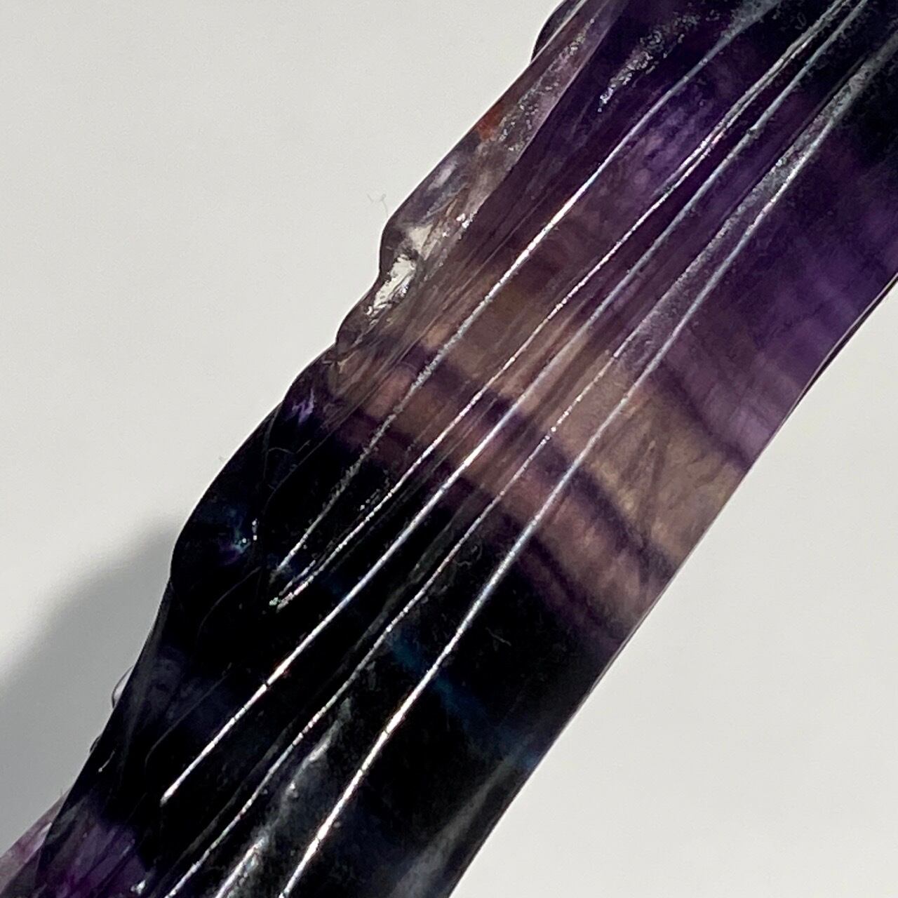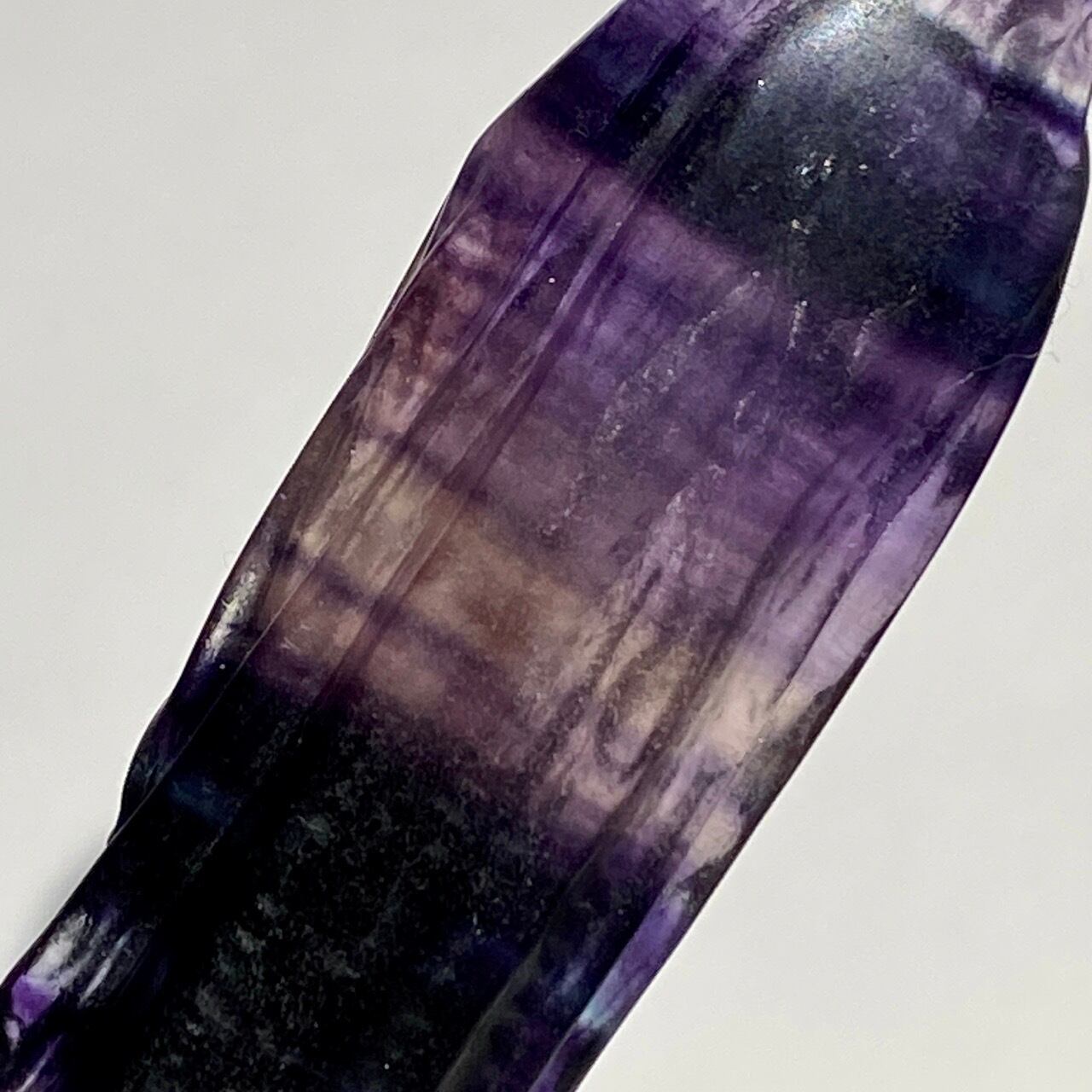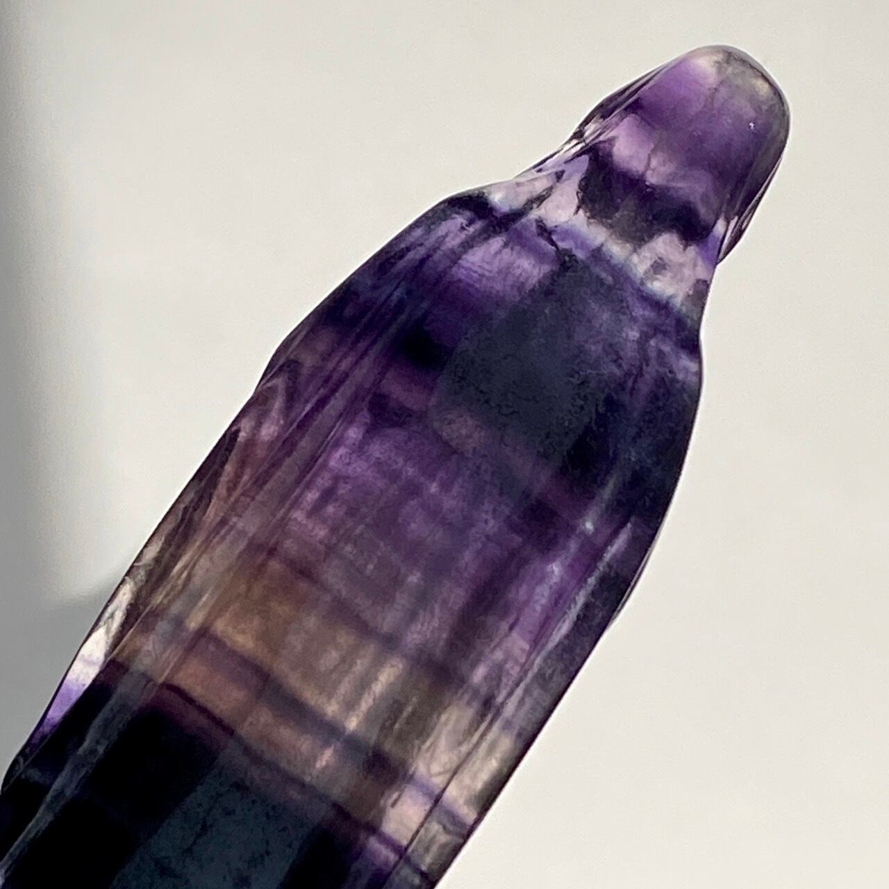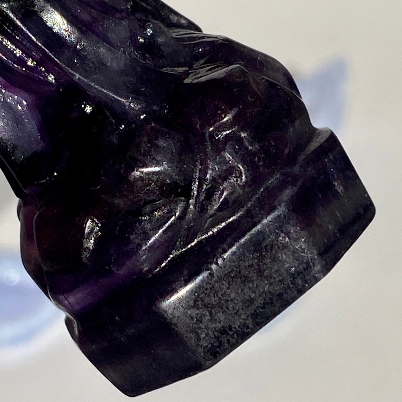 光に透かすと、紫の濃淡、鮮やかなブルー、透明な(もしくは少し白っぽい)部分から成る、美しいカラーコンビネーションが確認できます。そして左袖(正面向かって右)の裾から胴体中央にかけて赤っぽいインクルージョンが見られます。レインボーフローライトは通常、室内で見ると色が濃いですが、光に当てるとステンドグラスの様に鮮やかな色が浮かび上がります。