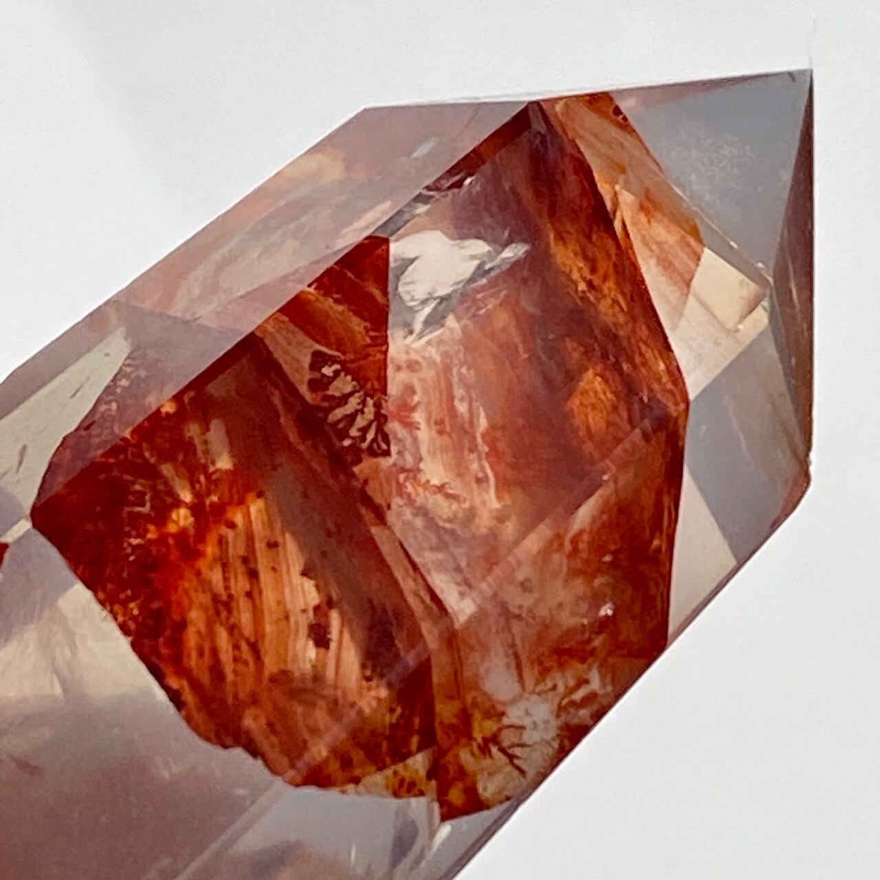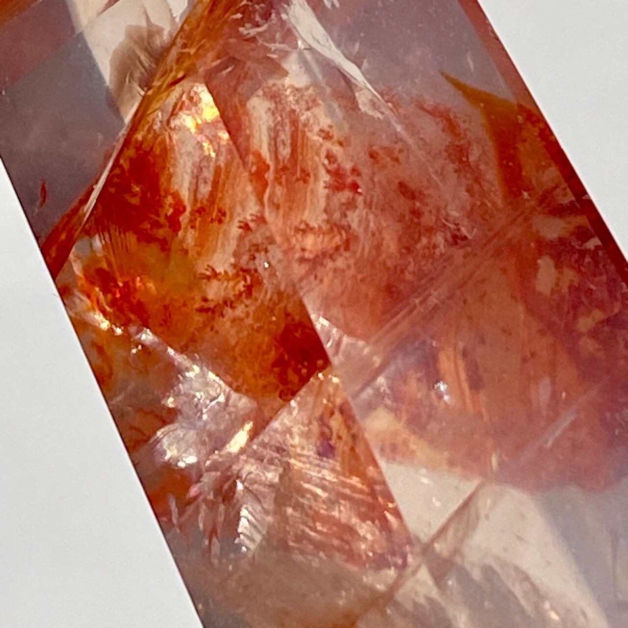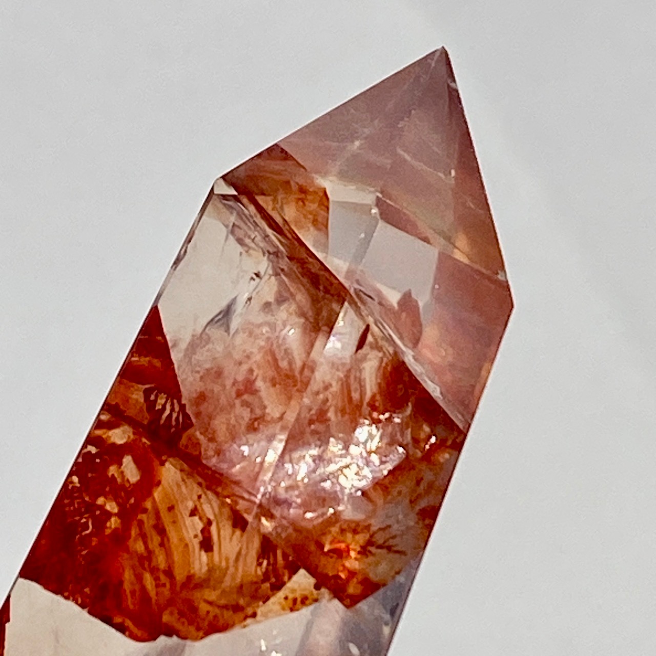 水晶に赤いレピドクロサイト(鱗鉄鉱)を内包する石で、その見た目から力強さを象徴し、持ち主に自信や決断力、そして前進する力をを与えてくれると言われています。