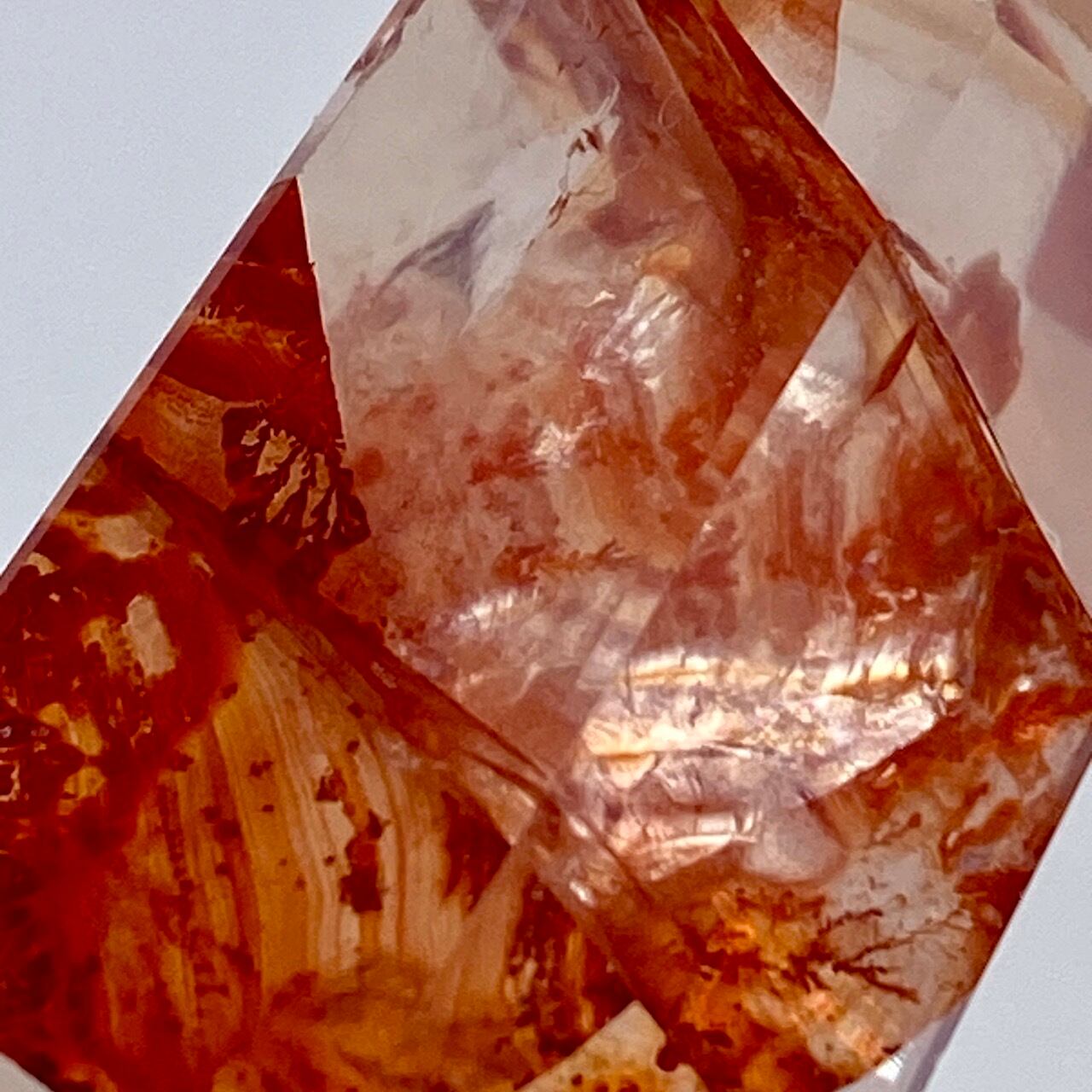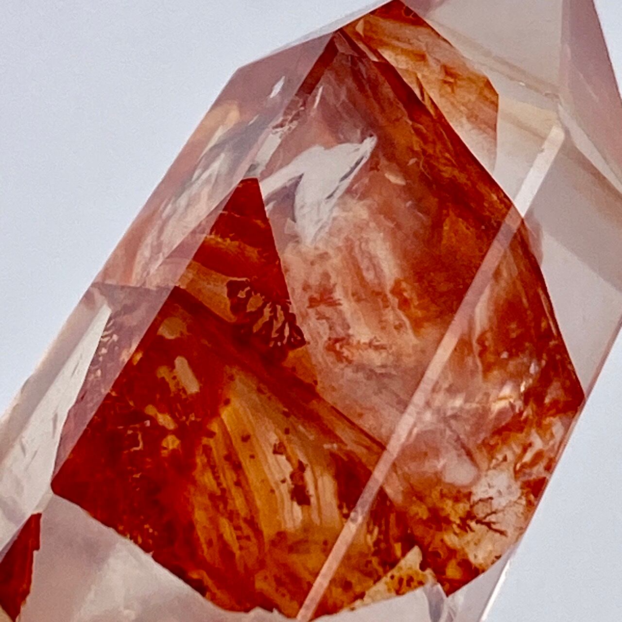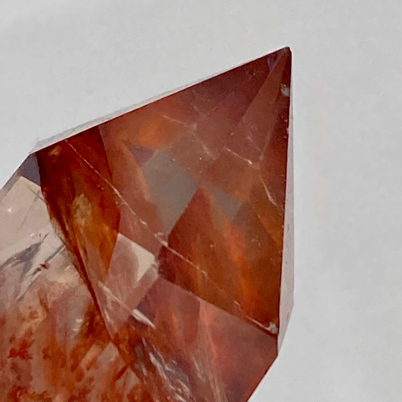 水晶に赤いレピドクロサイト(鱗鉄鉱)を内包する石で、その見た目から力強さを象徴し、持ち主に自信や決断力、そして前進する力をを与えてくれると言われています。