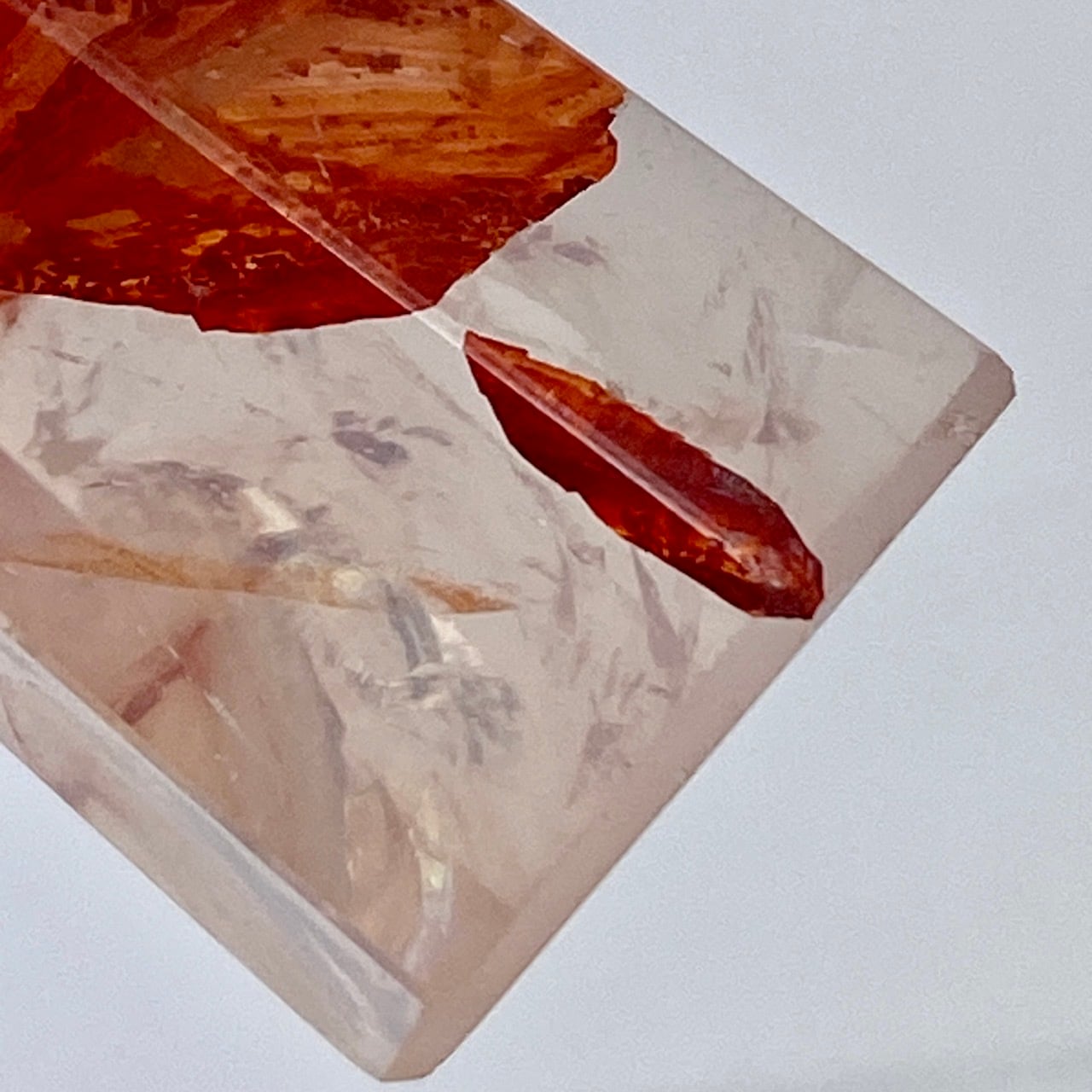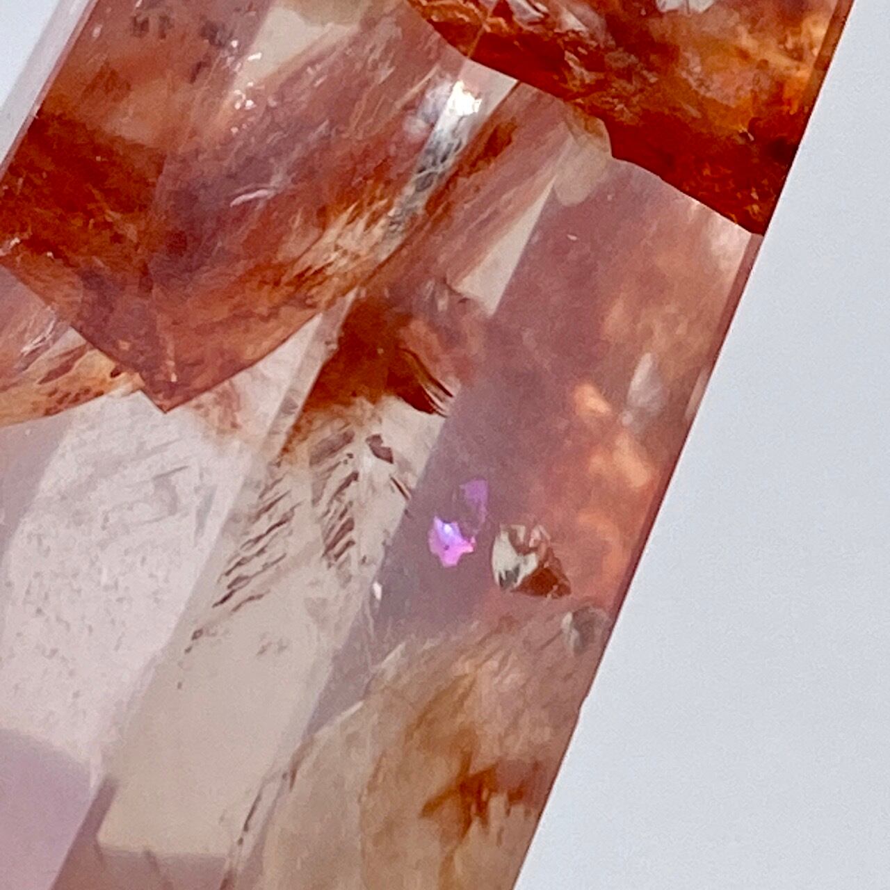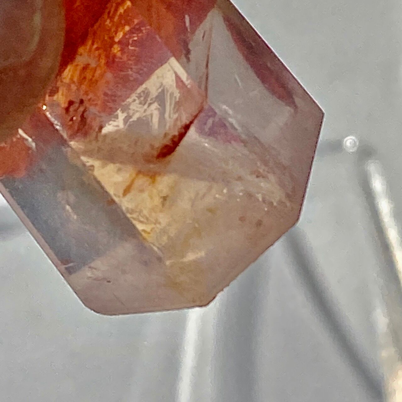 まるでジラソルクウォーツのようなクォーツに朱色のインクルージョンが入った子で、ミニサイズながらも虹が数カ所入っている上、角度を変えると煌めきも見られます。中が見通せるので、インクルージョンが細部まで愛でる事ができます。とても可愛いです♡