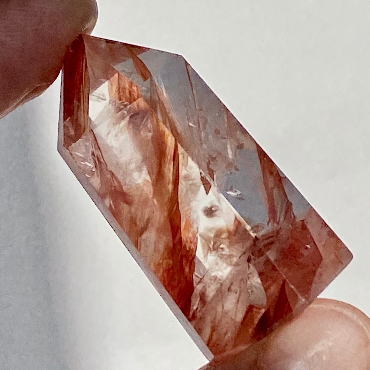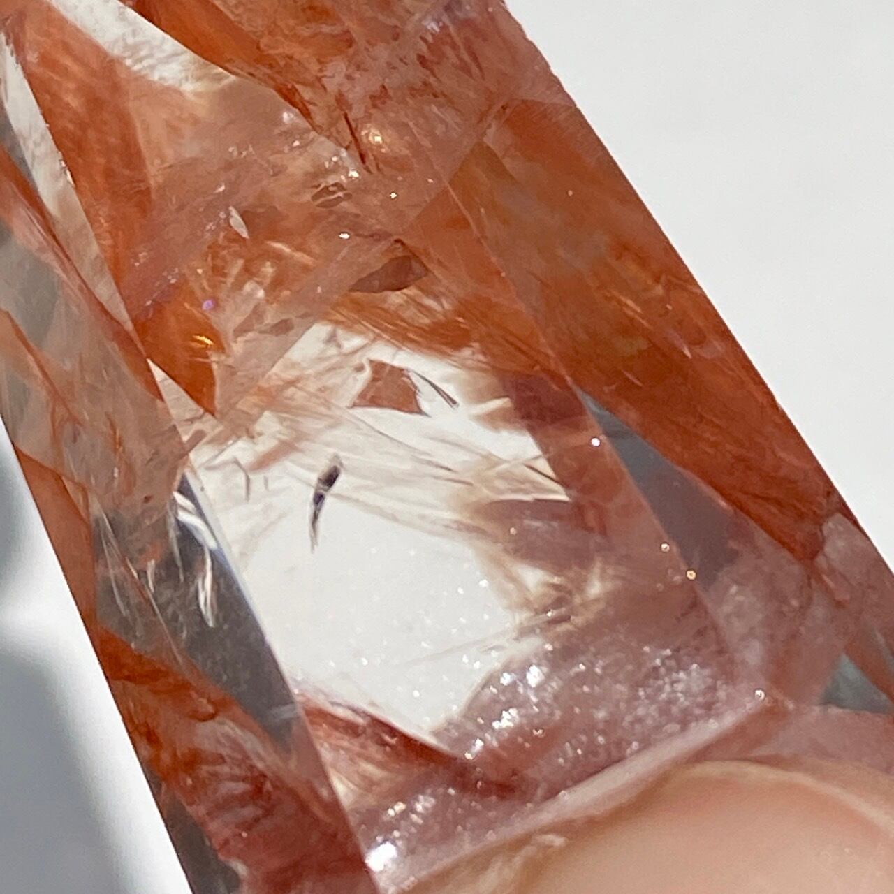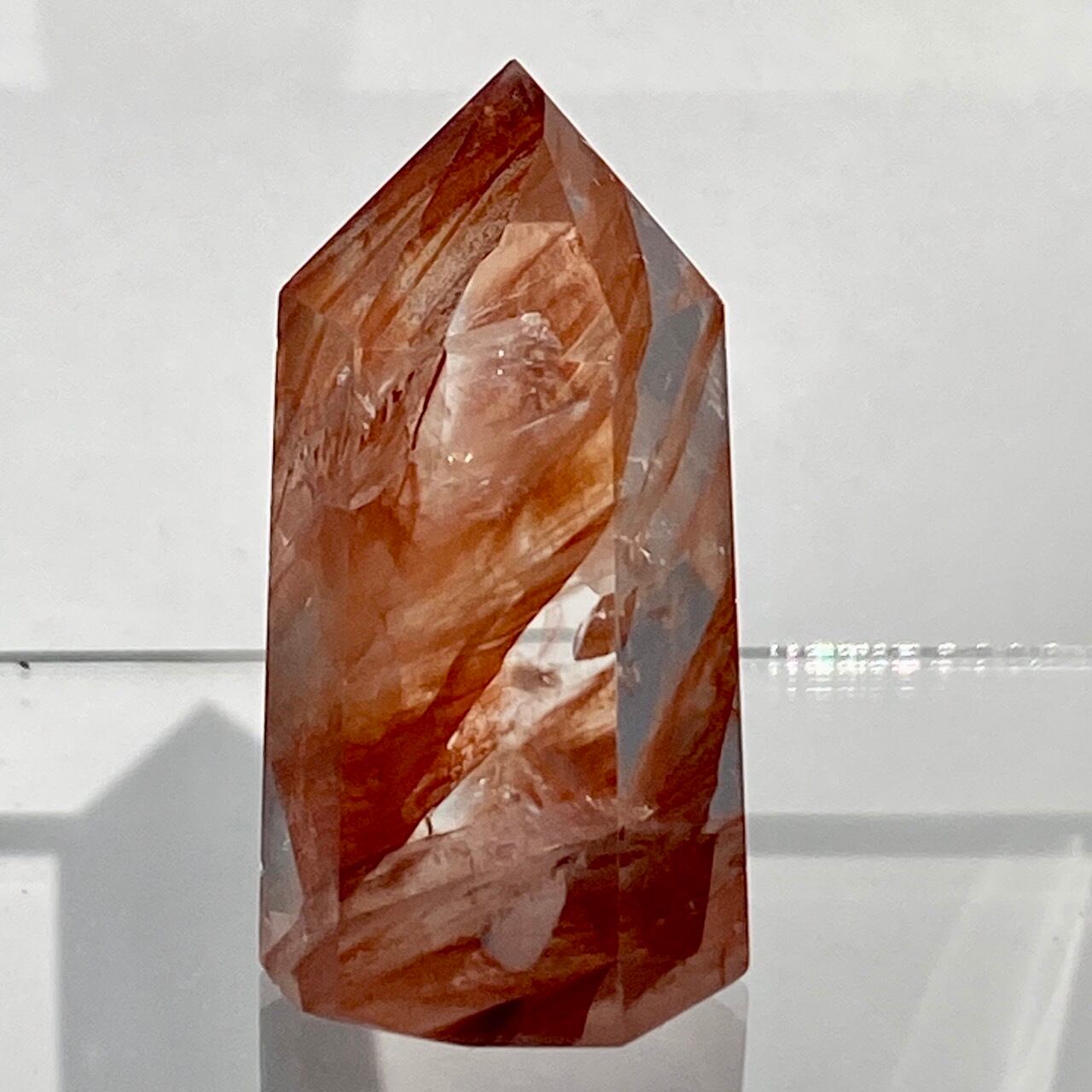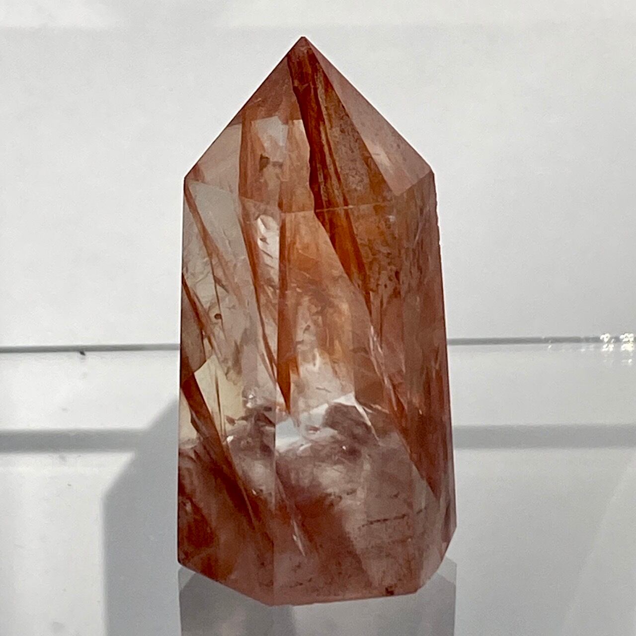 水晶に赤いレピドクロサイト(鱗鉄鉱)を内包する石で、その見た目から力強さを象徴し、持ち主に自信や決断力、そして前進する力をを与えてくれると言われています。