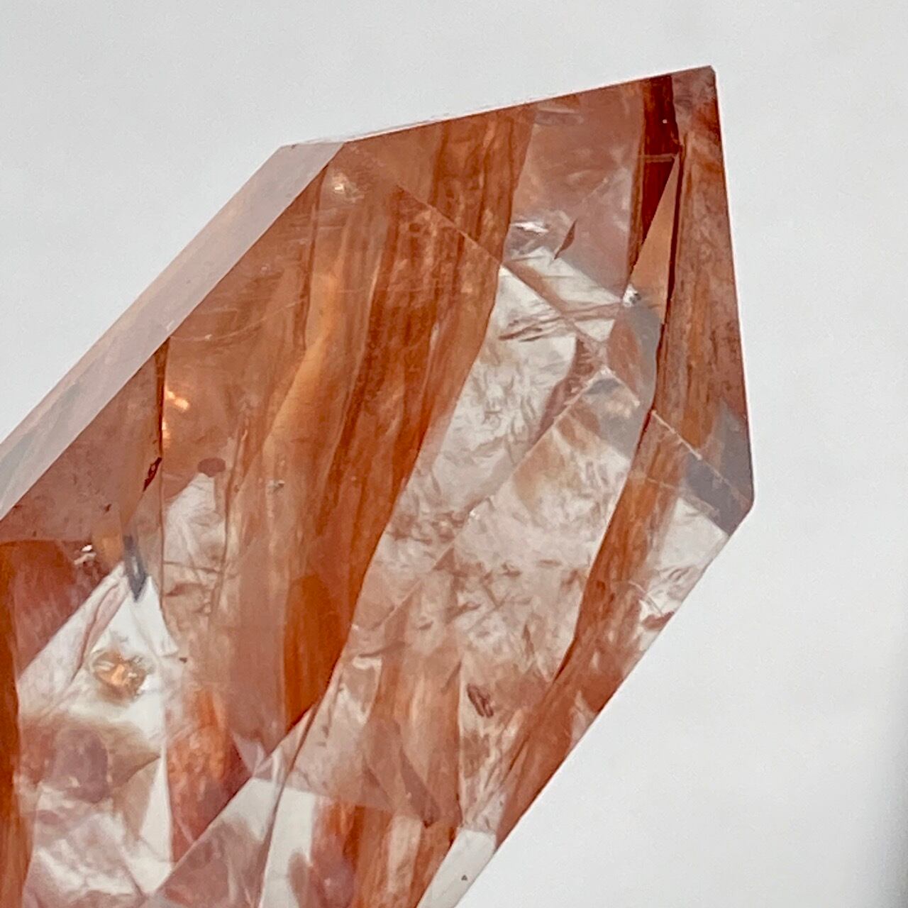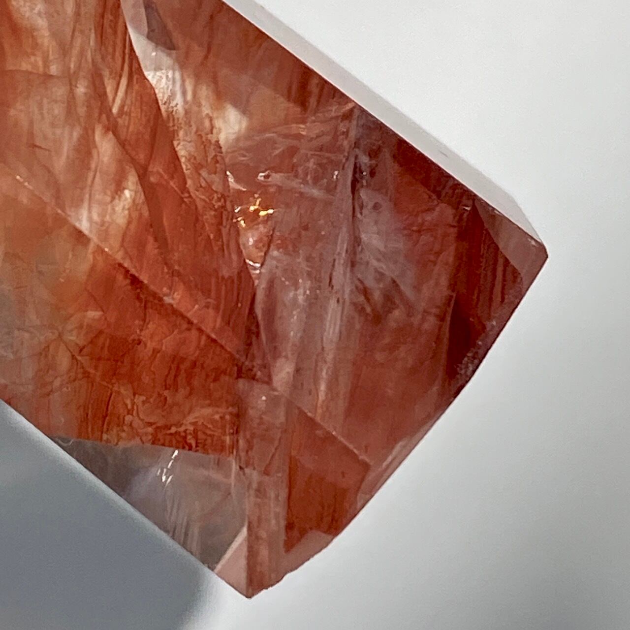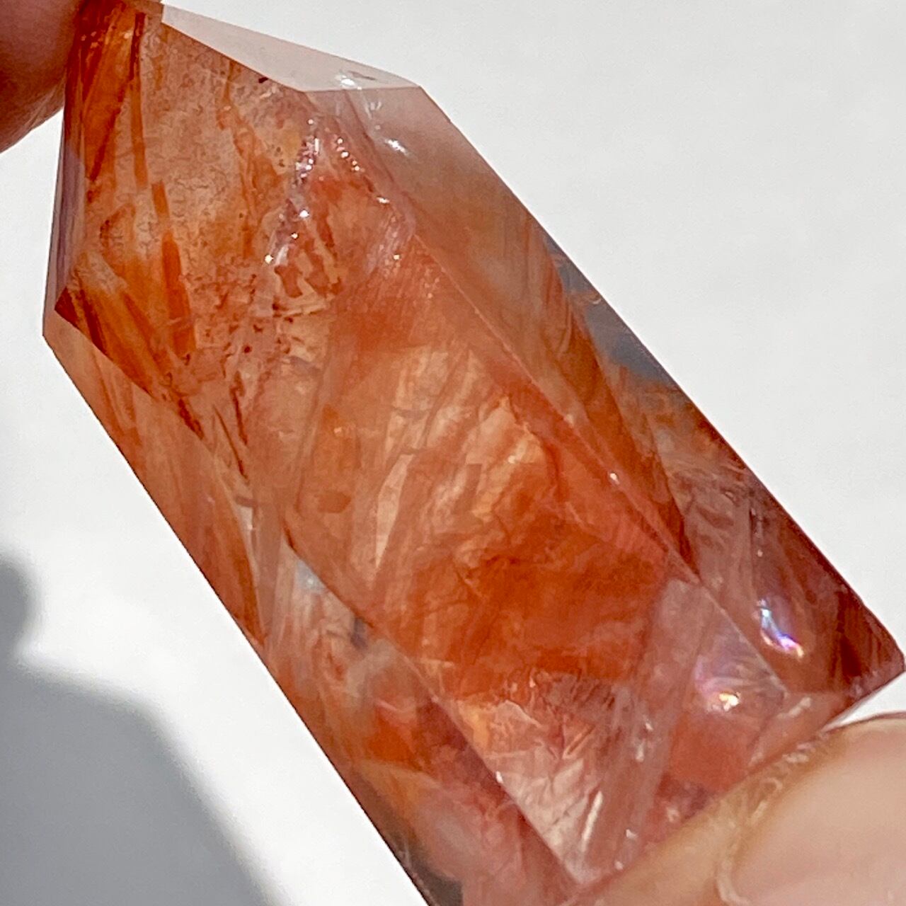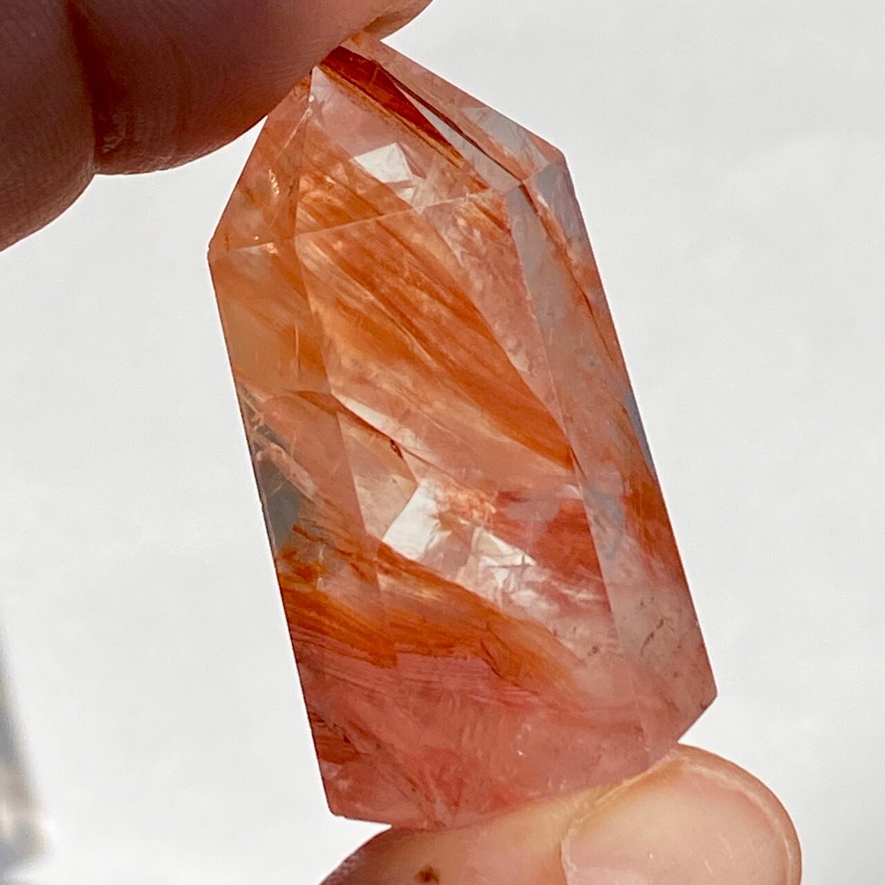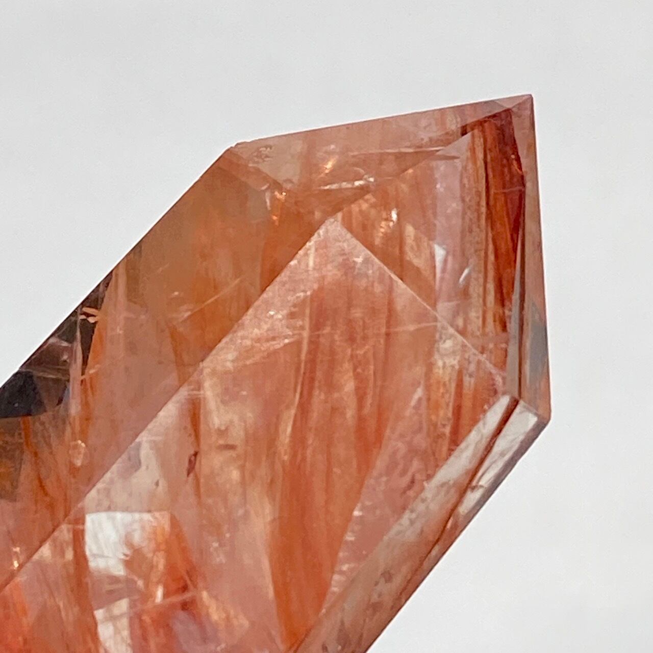 水晶に赤いレピドクロサイト(鱗鉄鉱)を内包する石で、その見た目から力強さを象徴し、持ち主に自信や決断力、そして前進する力をを与えてくれると言われています。