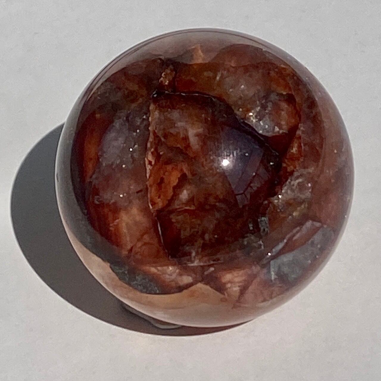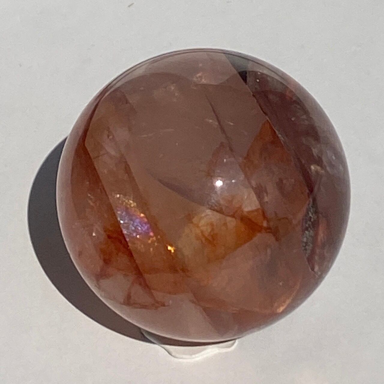 まるでジラソルクォーツのように若干ミルキーなクォーツに朱色から深紅までのインクルージョンが入った、ファイアークォーツのスフィアになります。