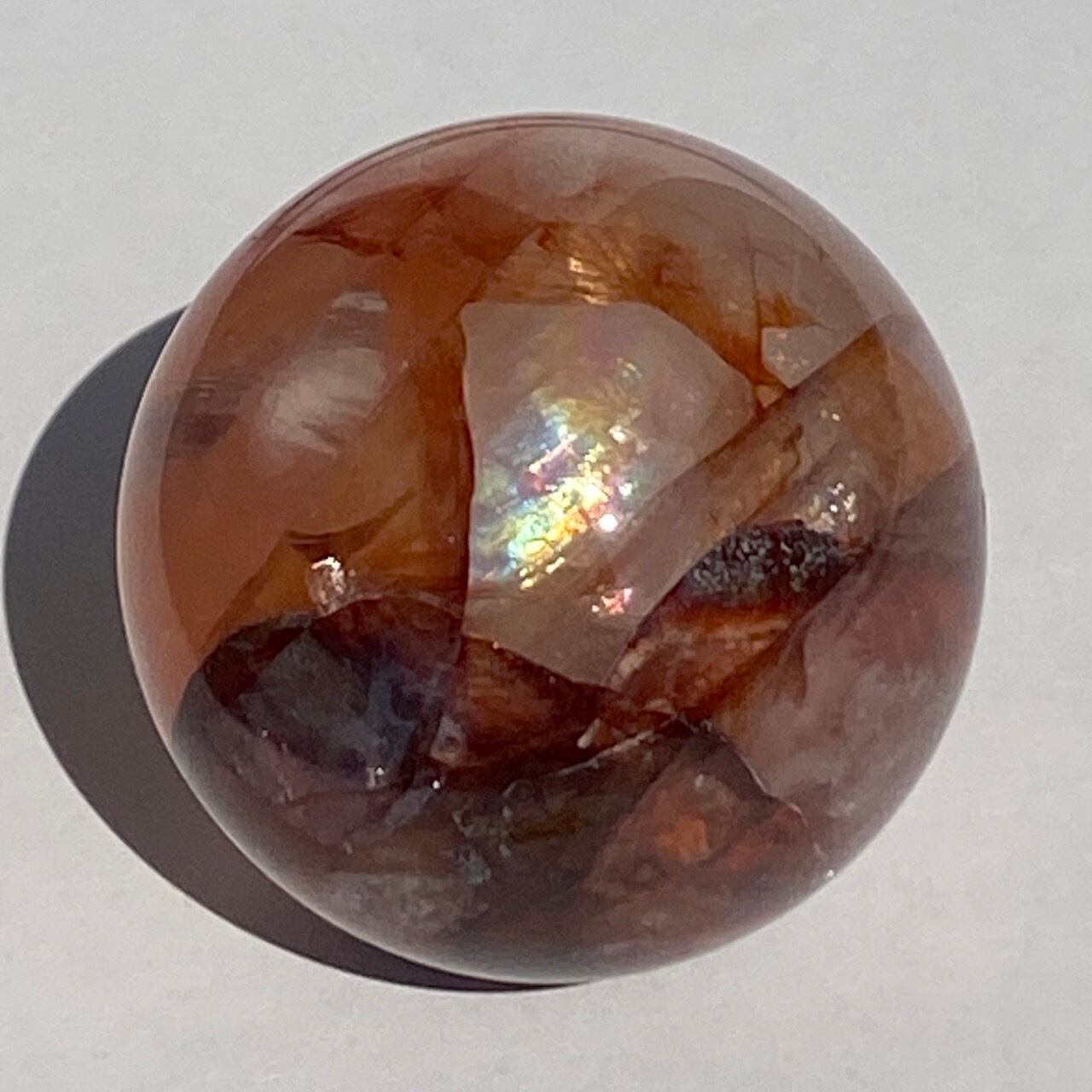 1、2枚目の画像のように、クォーツの窓から大きくてはっきりとしたレインボー(虹)が見られ、スターライトがそれを美しく照らして映し出します。それ以外にも大きなレインボーが複数箇所あり、とてもゴージャスなスフィアです。インスタに動画をUPしていますので、是非そちらをご確認下さい。