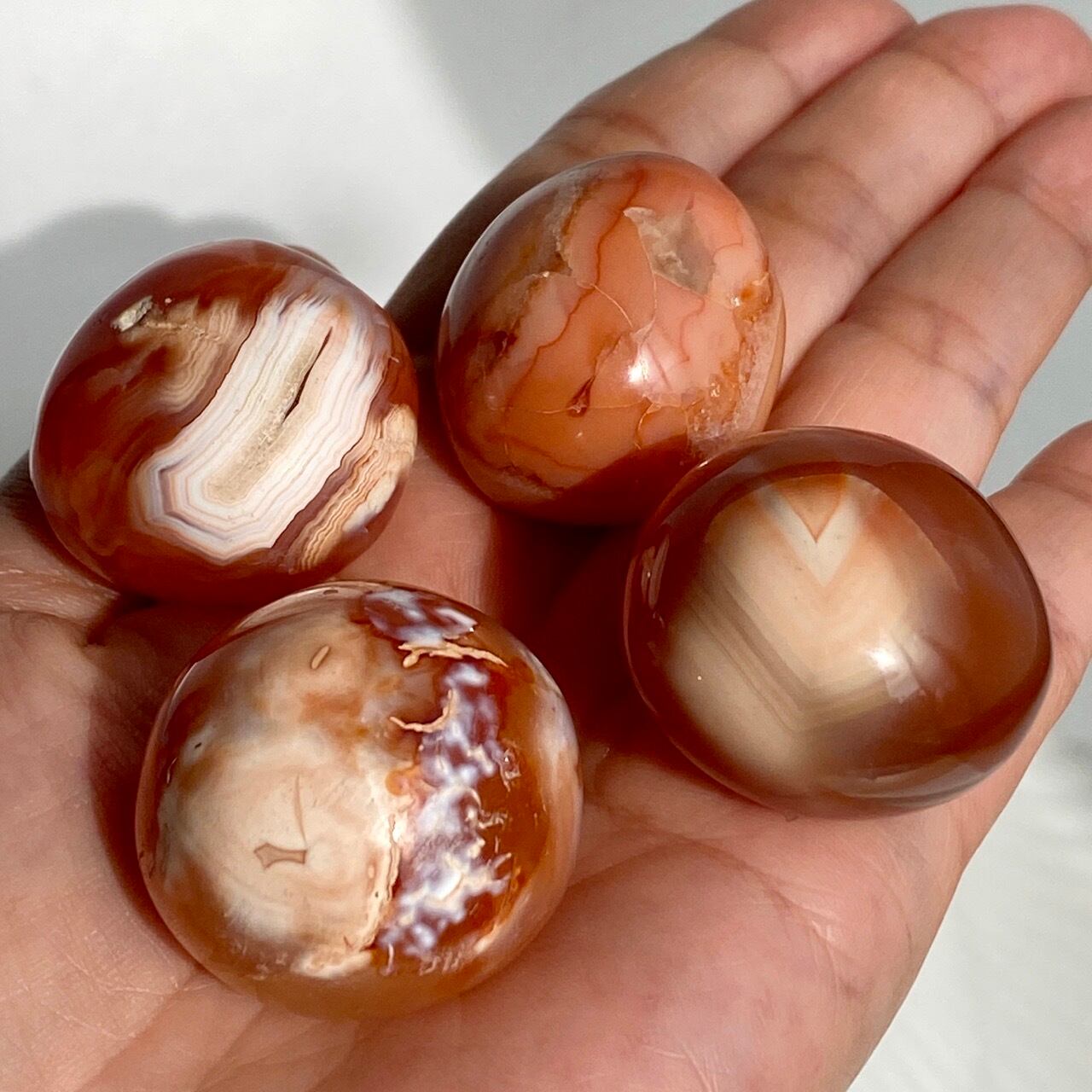 タンブルサイズ位のミニパームストーンの4個入りで、カーネリアンとオルカカーネリアンのセットとなります。