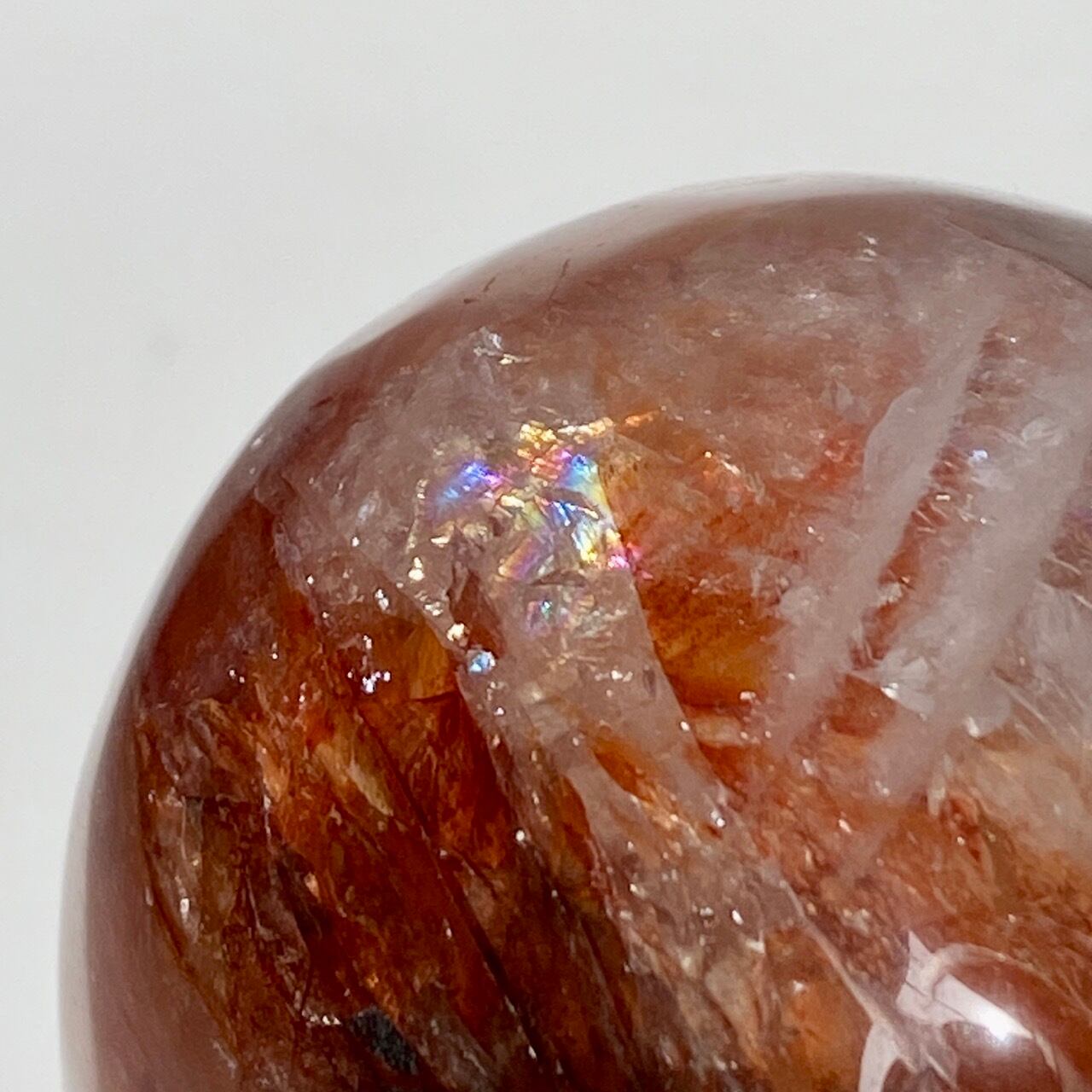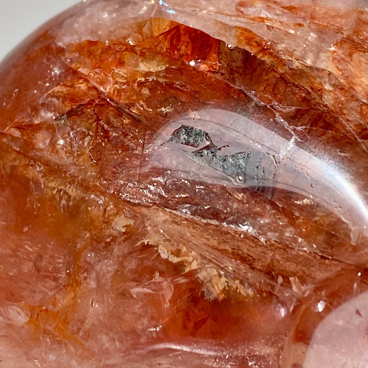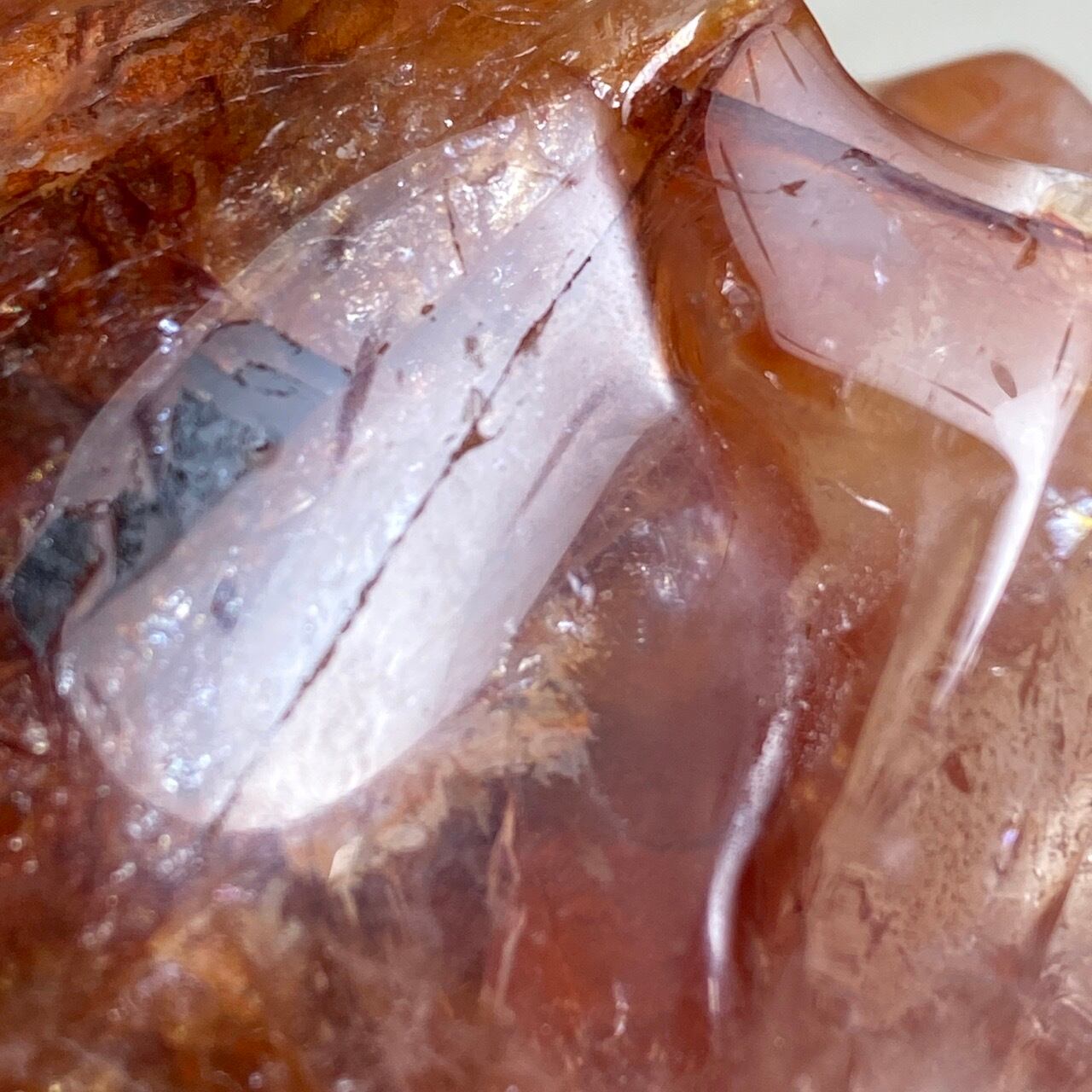 水晶に赤いレピドクロサイト(鱗鉄鉱)を内包する石で、その見た目から力強さを象徴し、持ち主に自信や決断力、そして前進する力をを与えてくれると言われています。